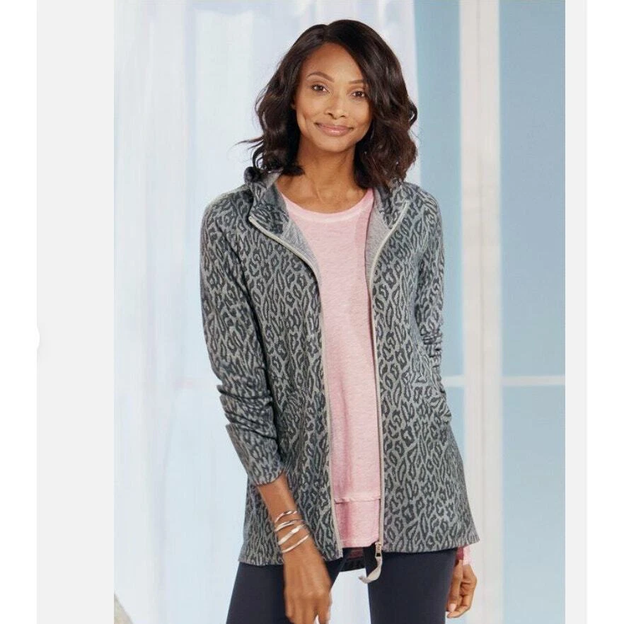 Soft Surroundings Hoodie Women Size L Lyra Leopard Hooded Zip Front Jacket Gray Measurements are included in the photos Material: 78% Polyester/17% Viscose/5% Spandex Color: Gray Multi Animal print Excellent Pre-Owned Condition. Very slight signs of wear and washing Bundle for a discount or send an offer