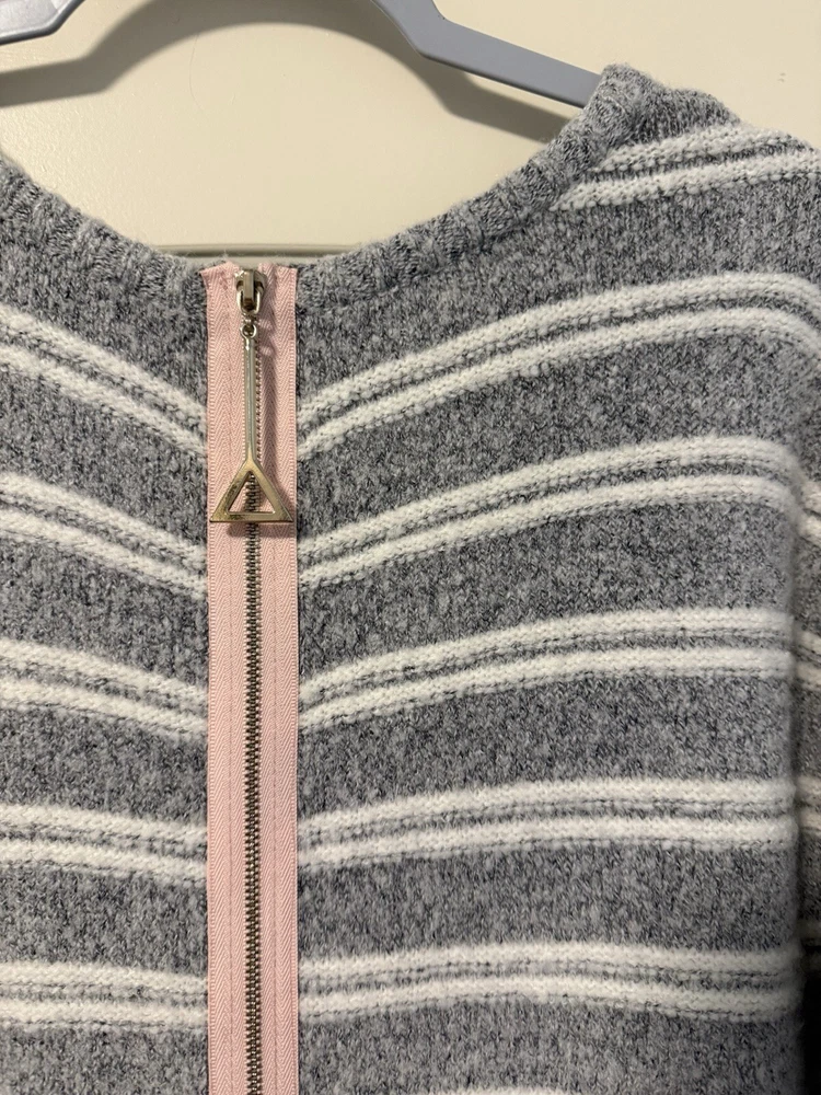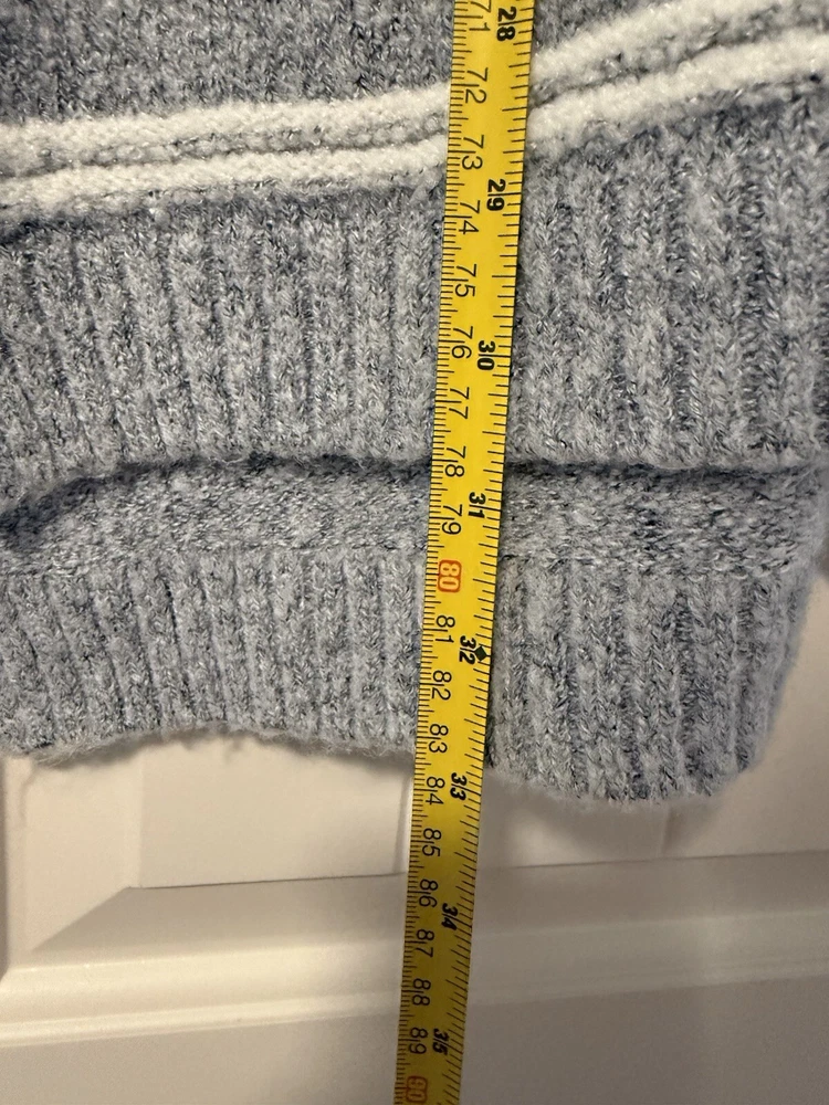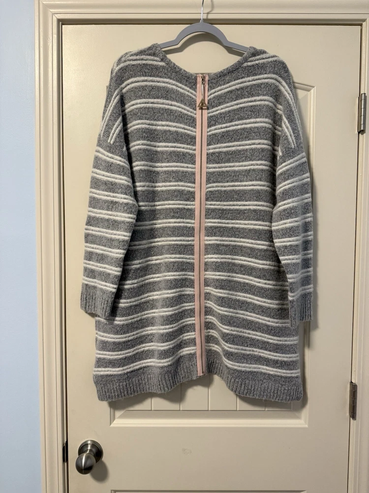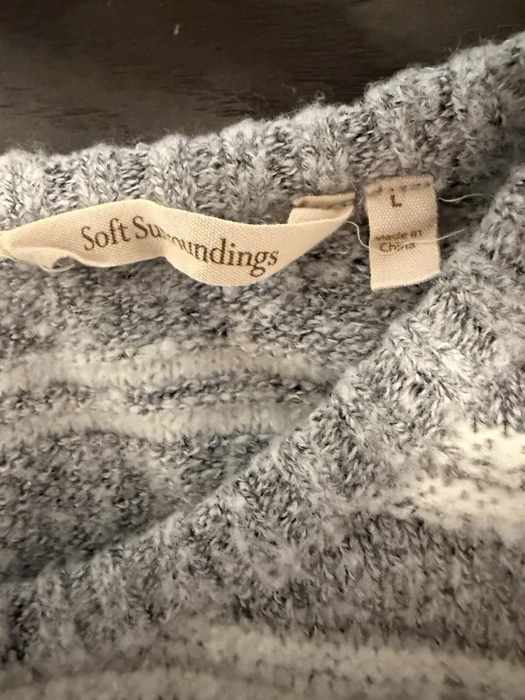 Theme: Classic Size: L Fit: Regular Knit Style: Tight-Knit Type: Sweater Sleeve Type: Dropped Sleeve Occasion: Casual Vintage: No Garment Care: Machine Washable Department: Women Sleeve Length: Long Sleeve Color: Gray Neckline: Round Neck Size Type: Regular Character Family: ….. Pattern: Striped Character: …. Material: Acrylic, Nylon, Spandex Accents: Zipper Style: Tunic Fabric Type: Knit Features: Full Zip Brand: Soft Surroundings Country/Region of Manufacture: China Season: Fall, Winter, Spring Personalize: No