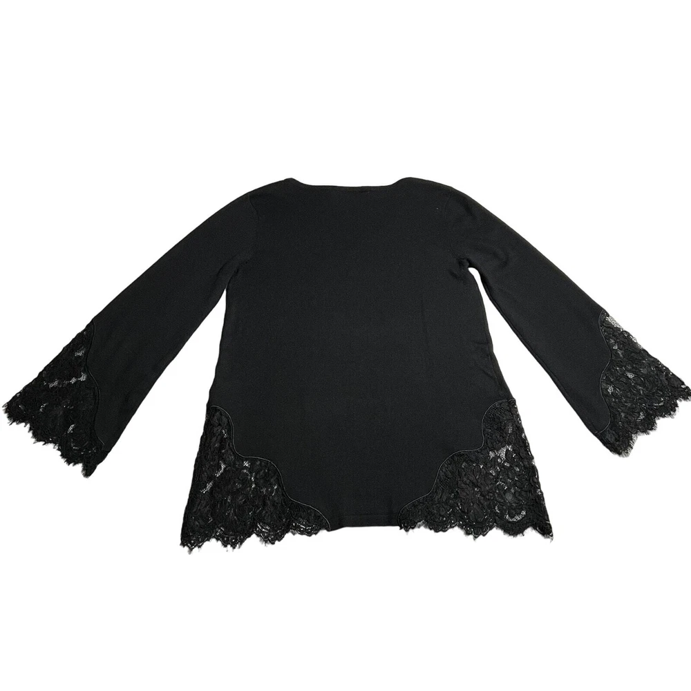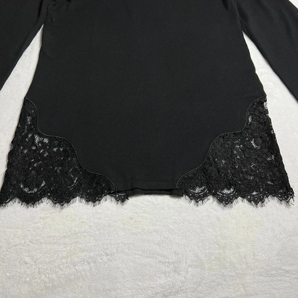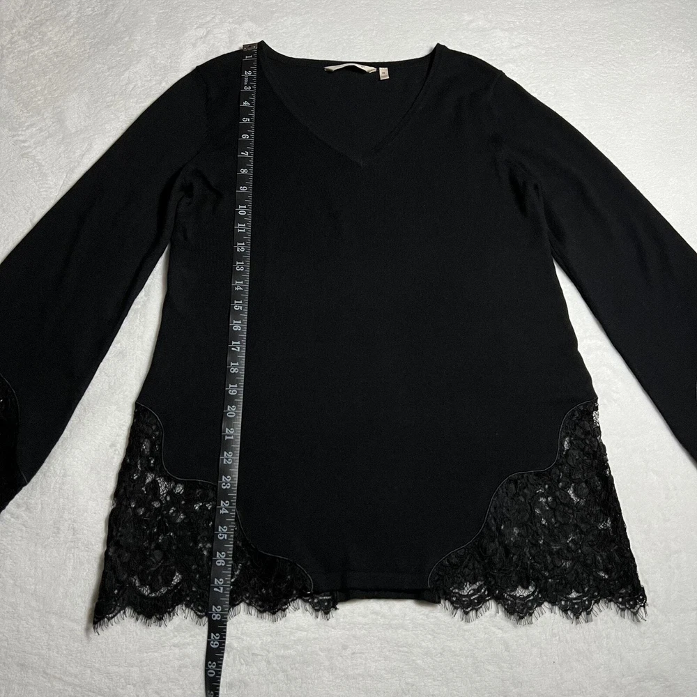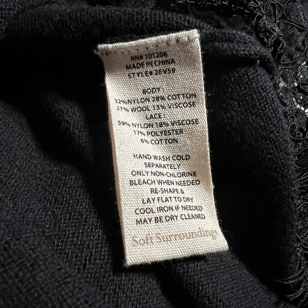 Soft Surroundings V-Neck Wool Blend Lace Trim Sweater Size X-Small Neutral CONDITION: Pre-Owned. Excellent Used Condition. FLAWS/ALTERATIONS: No flaws. COLOR: Black SIZE: Women’s Size X-Small DETAILS: V-Neck Long sleeve Lace trim on sleeves and body Stretch Wool blend Pull over MEASUREMENTS: Chest: 18.5" Full Length: 28.5" **All measurements are approximate and are taken flat** MATERIAL: BODY: 32% Nylon 28% Cotton 27% Wool 13% Viscose LACE: 59% Nylon 18% Viscose 17% Polyester 6% Cotton Bundle 2 OR MORE items to save more! Reasonable offers are welcomed! TAGS: Casual Comfy Fall Winter Contemporary Minimalist Boho Bohemian Cottagecore Neutral Basic Effortless Layers