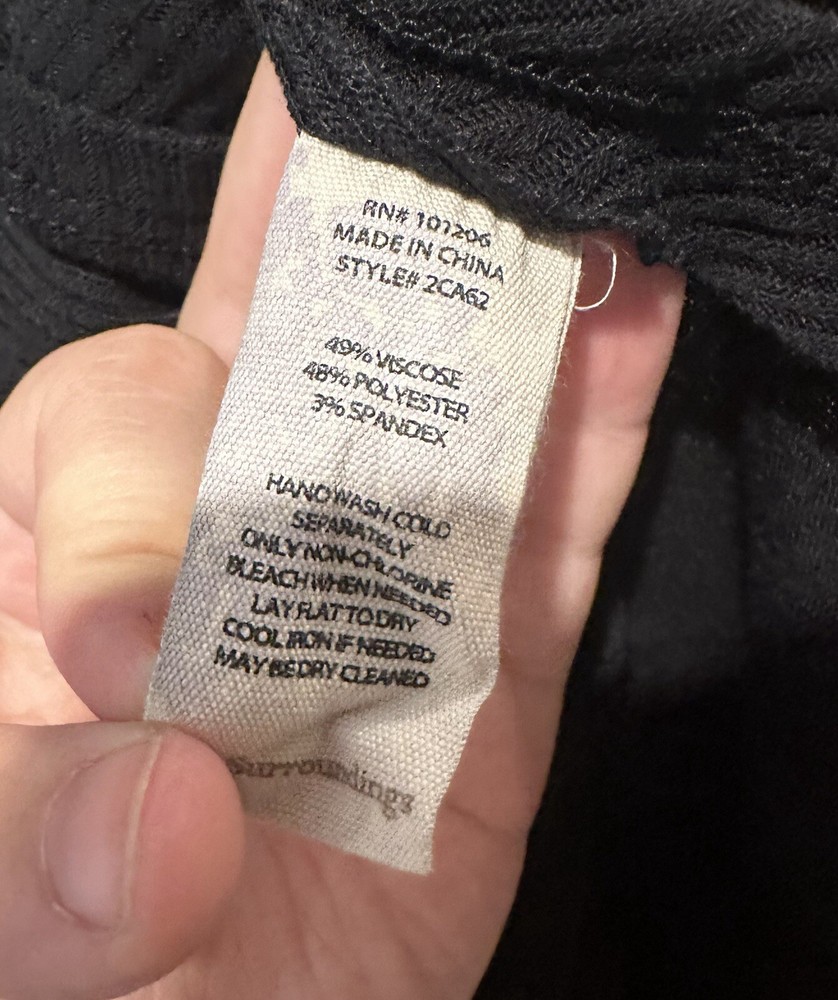 Elevate your wardrobe with this Soft Surroundings women's long sleeve top in size small. The classic black color and solid pattern make it a versatile piece to mix and match with any outfit. The V-neckline adds a touch of femininity, while the classic/fitted sleeves provide a comfortable and flattering fit. Crafted from a blend of polyester, spandex, and viscose, this knit top is lightweight, stretchy, and breathable for all-day wear. The oversized design provides a relaxed and comfortable fit, making it perfect for layering or wearing on its own. This Soft Surroundings top is a must-have basic for any woman's wardrobe. No rips holes or stains! Good Pre-Owned condition!