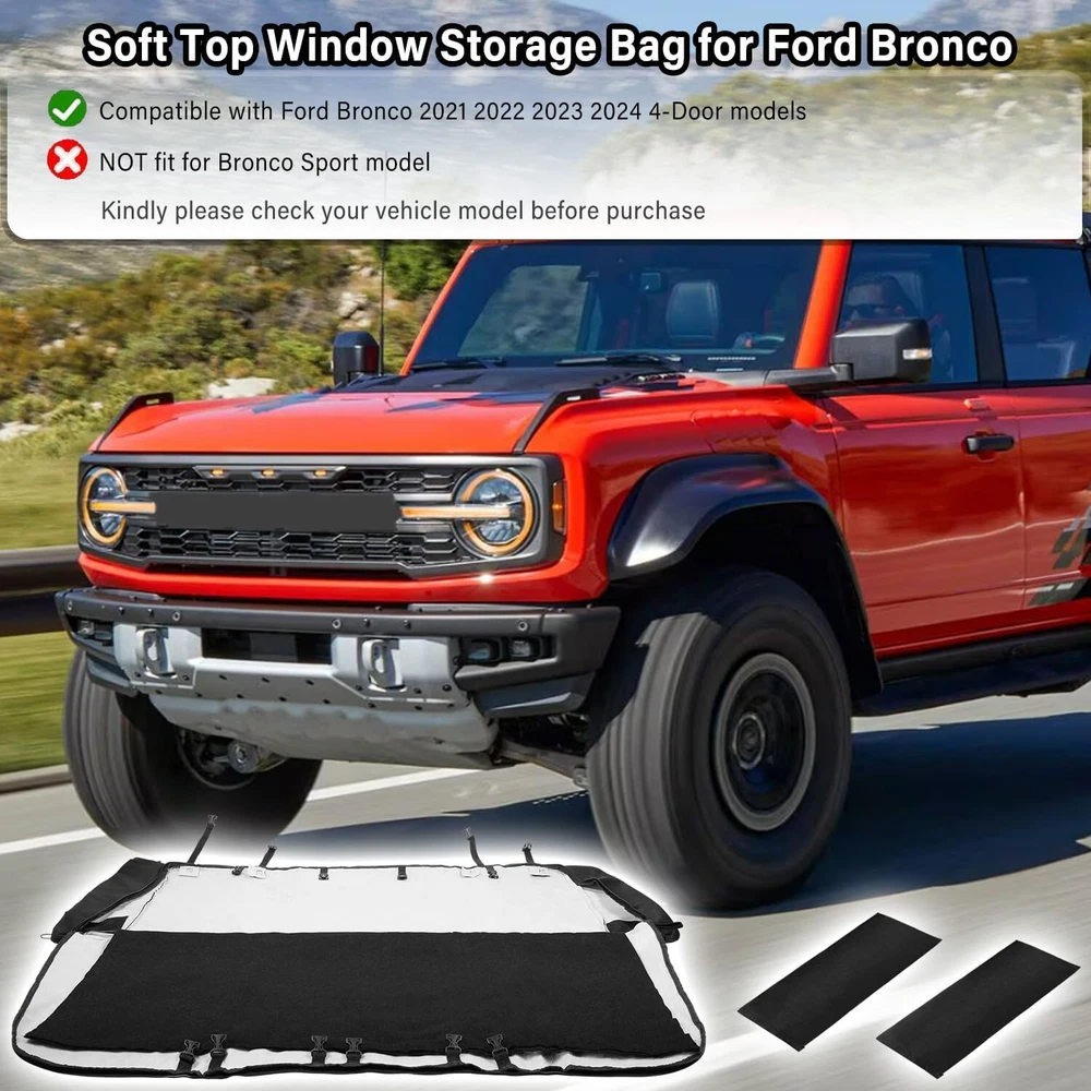 【Perfect Fitment】 The soft top window storage bag is compatible with Ford Bronco 2021 2022 2023 2024 4-Door models with soft-top windows. This will NOT fit for Bronco Sport model. Kindly please check your vehicle model before purchase. 【Comprehensive Protection for Soft-Top Window】 This organizer storage bag will effectively protect the soft-top windows from damage, scratches and bends. A must-have storage accessory when you take off the soft-top windows for enjoying the open air and sunshine. Store the window panels easily with our quality protection bags. 【Expertly Made & Superior Quality】 The interior soft lining will separate the panels and avoid collision. To prevent window panels from rubbing and causing scratches, the storage bag is designed with 2 partitions and some buckles, hooks and loop fasteners inside for panels fixed in place. Furthermore, the storage bag is attached with straps for easy carriage and transportation. 【Built to Last】 Made of premium-grade 600D Oxford Cloth with soft inner liner. Waterproof and more durable. Dirt-resistance, anti-impact and anti-deformation for long-lasting reliable use. 【Satisfaction Guarantee】 If you're not satisfied with the product, simply return it in 60 days or get a replacement within 1 year for quality-related issues via our customer service. If your item is defective, incorrect, arrived damaged or any other problems, please contact us (include pictures if possible) and we will reply in 24 hours.