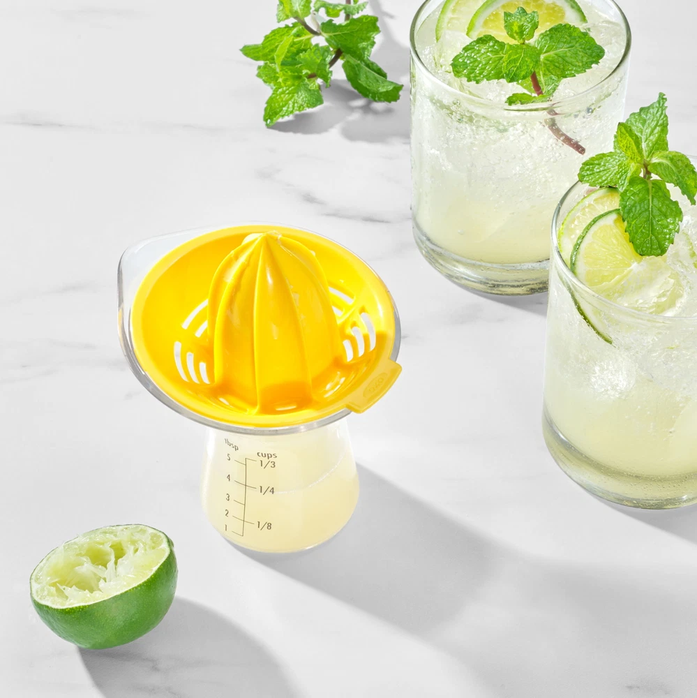 Our SoftWorks Small Citrus Juicer is perfect for your juicing needs! The unique reamer design makes juicing efficient and easy, while the built in strainer catches seeds and pulp. The compact container features convenient measurement markings and a spout for drip-free pouring to minimize messes. The Small Citrus Juicer comes apart for easy cleaning, the yellow reamer and strainer, and clear body can all go in the dishwasher! Contains one Soft Works Small Citrus Juicer in Yellow Unique reamer design for easy and efficient juicing 2.5 oz. cup with convenient measurement markings Disassembles for cleaning. Dishwasher safe BPA-free plastic
