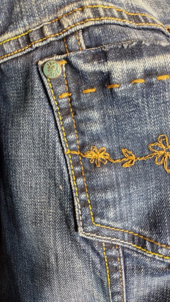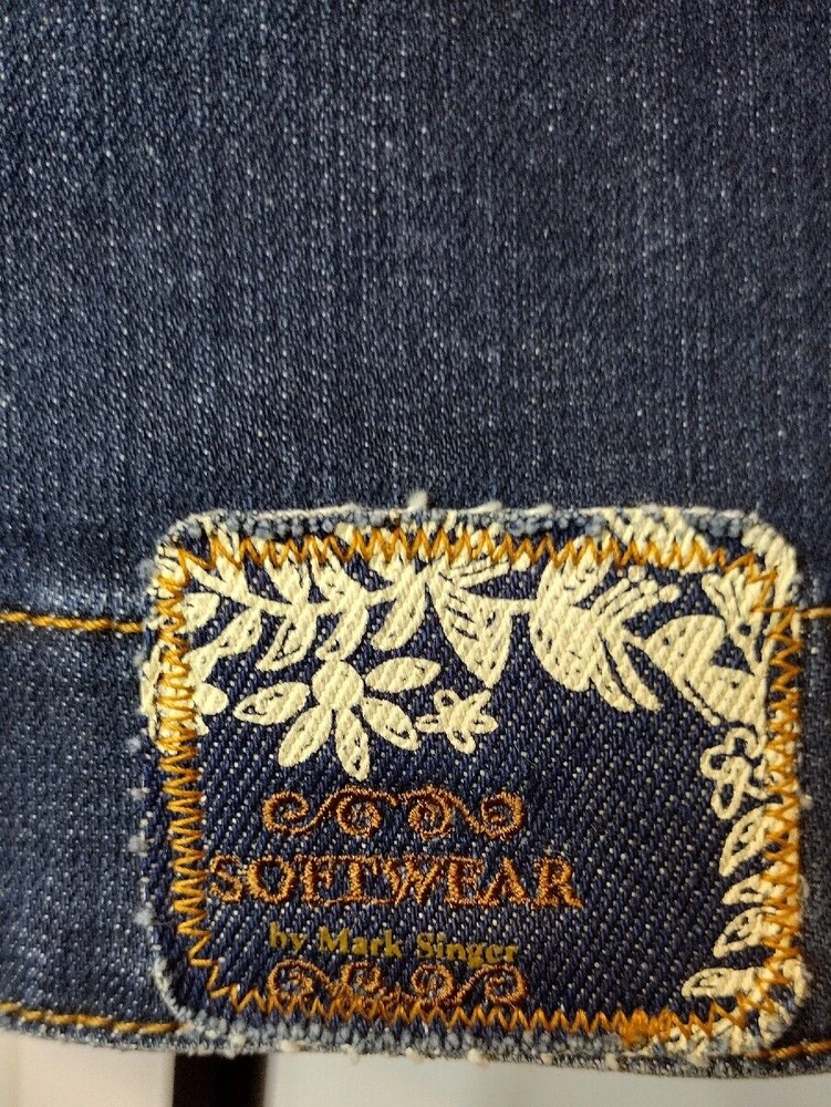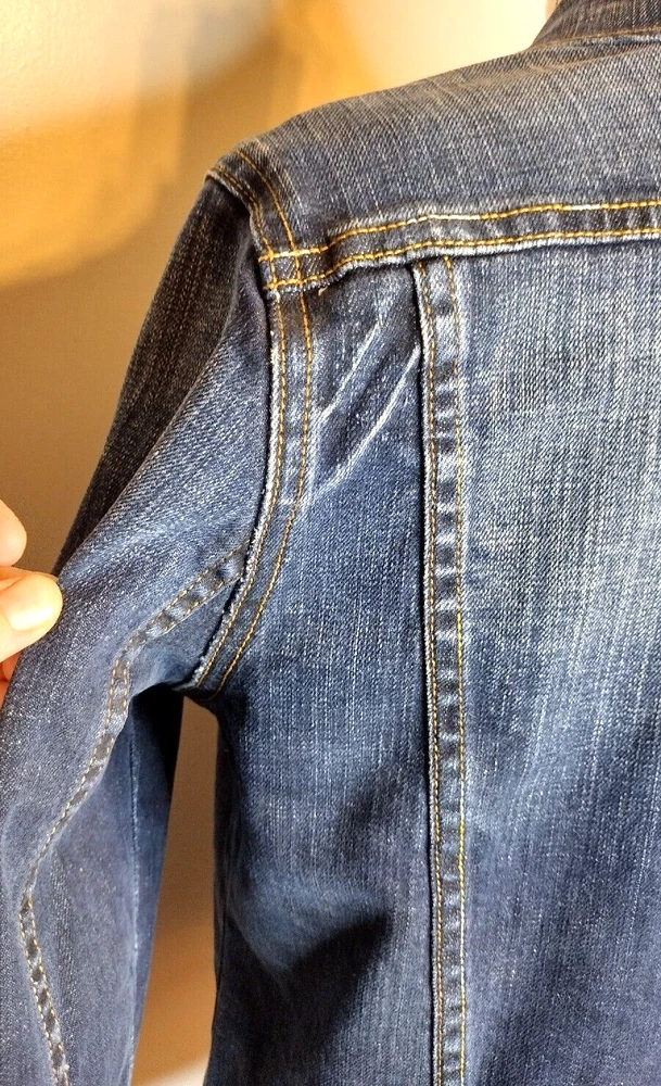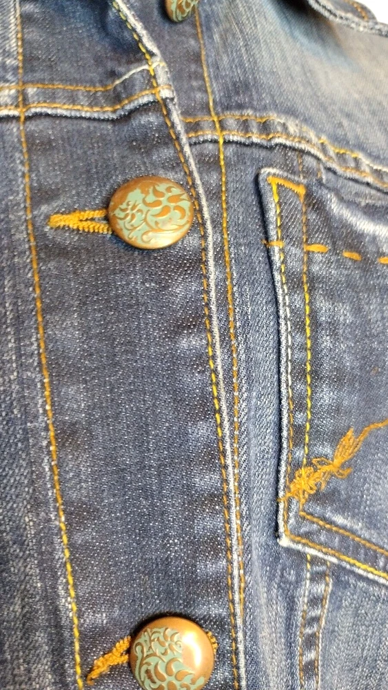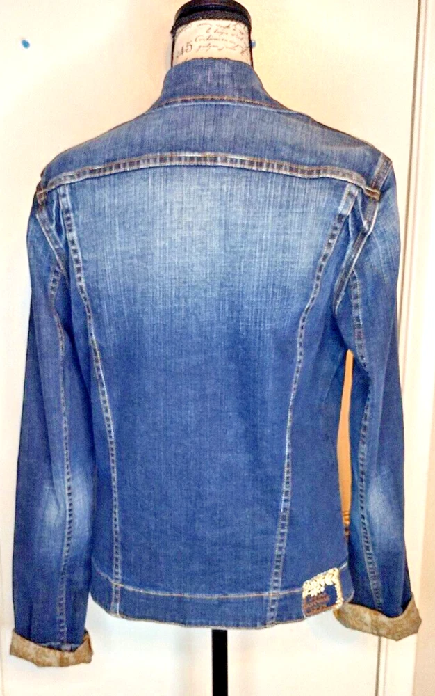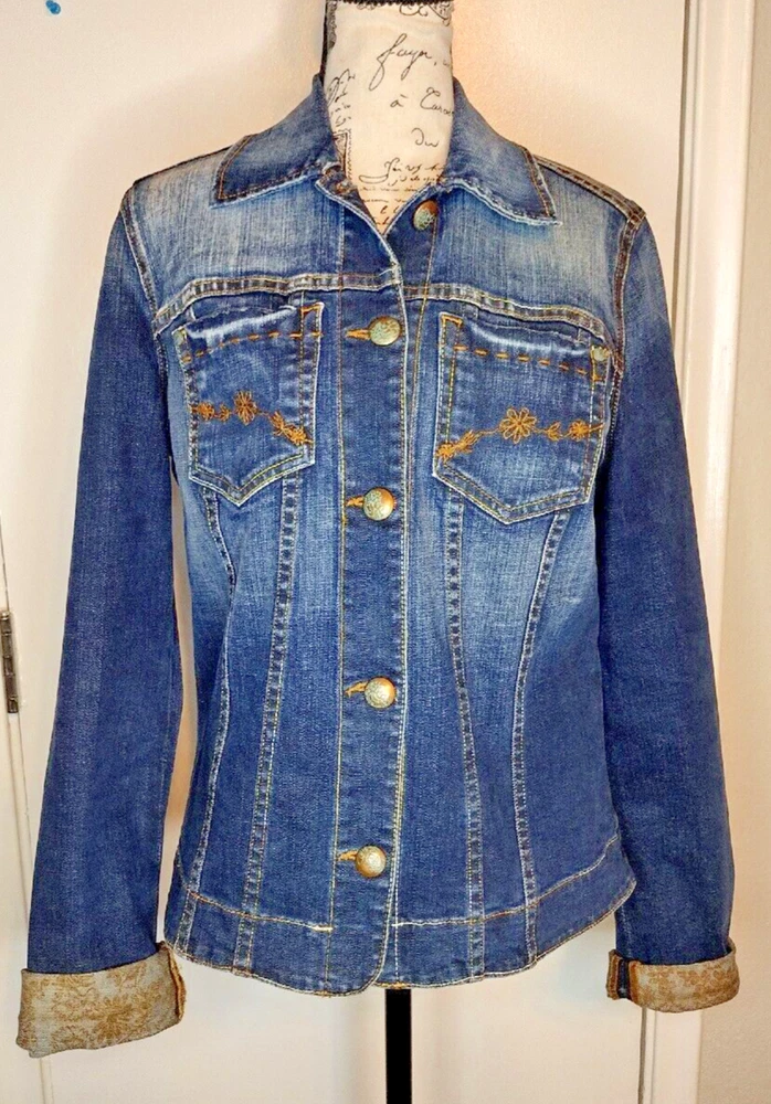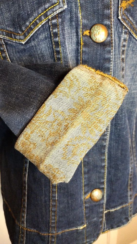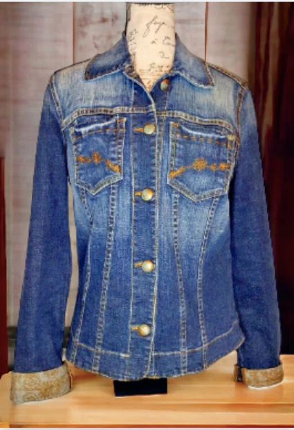 This beautiful denim jean jacket is a S/M and measures 23.5" from the top seam of the shoulder to the bottom hem and 19" from pit to pit. It has embellished buttons and the same pattern on the rolled up sleeves. No rips or stains. Please see all photographs as they are part of the description. Shipped with USPS Ground Mail. Up M44