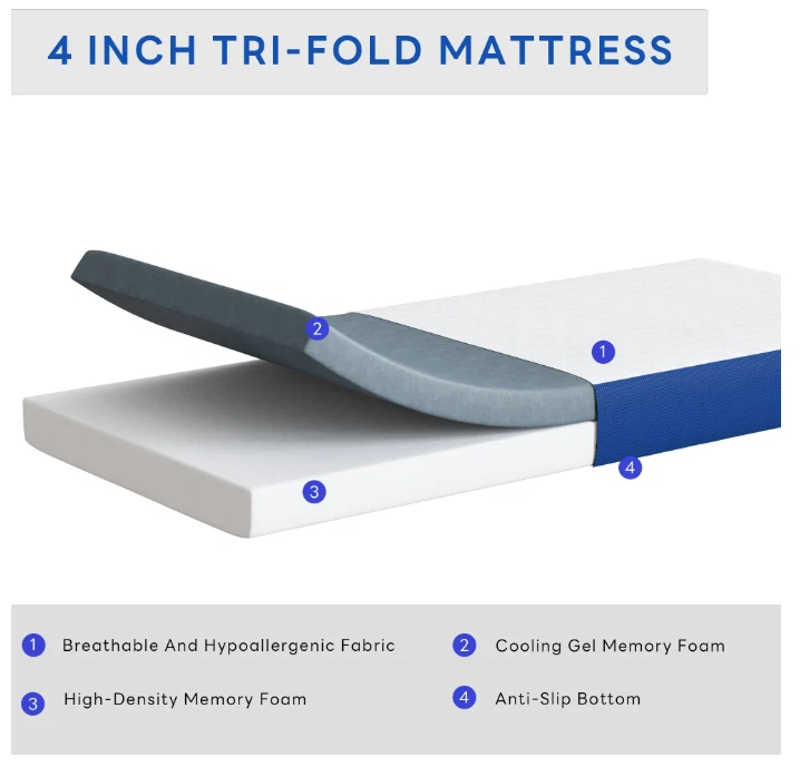 Soges, 4-Inch Tri-Folding Gel Memory Foam Portable Floor Mattress