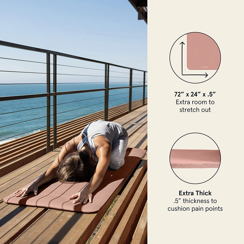 Extra thick for comfort and balance: Solana firm ½-inch extra thick fitness mat w/ mat strap alleviates stress on pressure points such as joints, hips, hands, and knees. 72" x 24" x ½" Non-slip surface: Solana's non-slip material keeps you steady and balanced while staying securely on the floor, preventing injury and allowing you to focus on your practice or workout. Durability: Solana's thick, durable material allows for everyday use, regardless of the intensity of your exercise. Ideal for your home or studio practice. BPA free: our products are free of Phthalate, heavy metals and latex. Your mat may initially release a harmless odor. If so, unroll your mat and air it for a day or two before using. Easy to clean: Solana is easy to keep clean and fresh for your next workout. Use a mix of gentle soap and water, wipe clean, and hang it to dry. Do not submerge. From the manufacturer Easy to Clean Wipe clean with a mix of water and a light amount of gentle soap, then hang it to dry. (Do not submerge.) Carrying Strap Easily transport your mat from your home practice to your studio salutations with its convenient nylon carrying strap. Ribbed Surface Texture Helps prevent slipping and keeps you well grounded during your flow. Extra Thick Foam Dense NBR foam alleviates stress on pressure points such as joints, hips, hands, and knees.