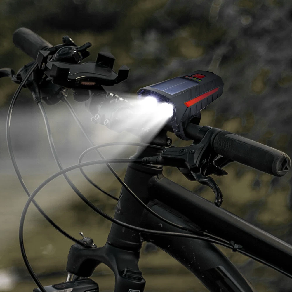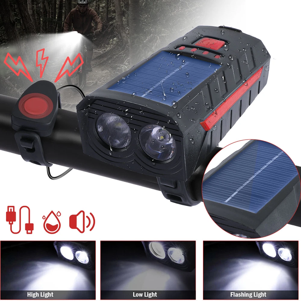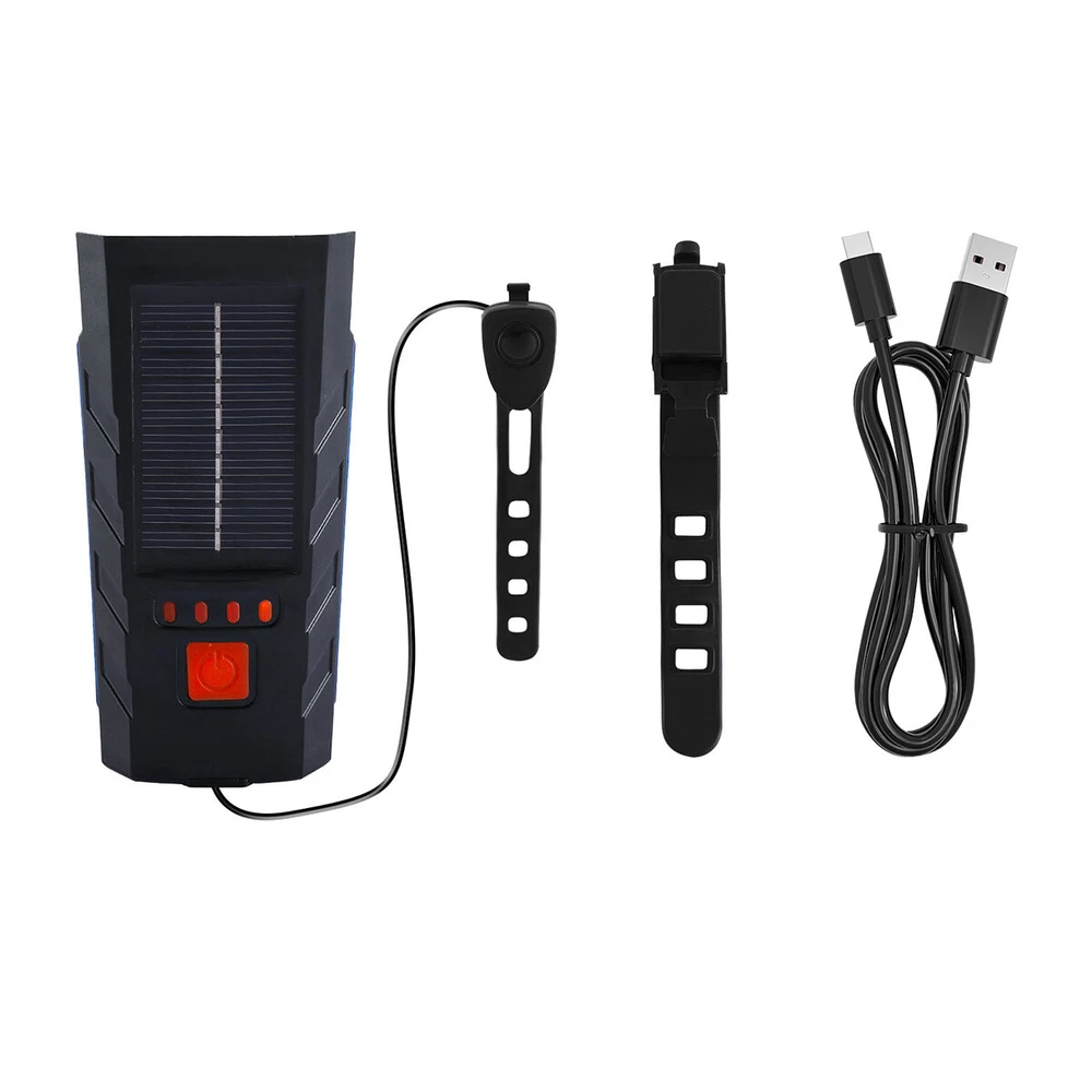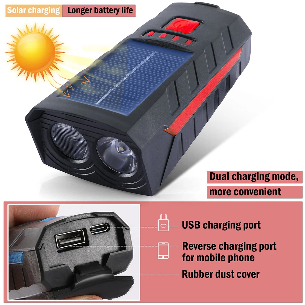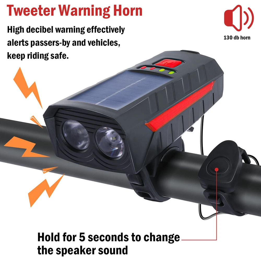 Solar Bike Light with Horn, USB Charging, 3 Modes for Night Riding