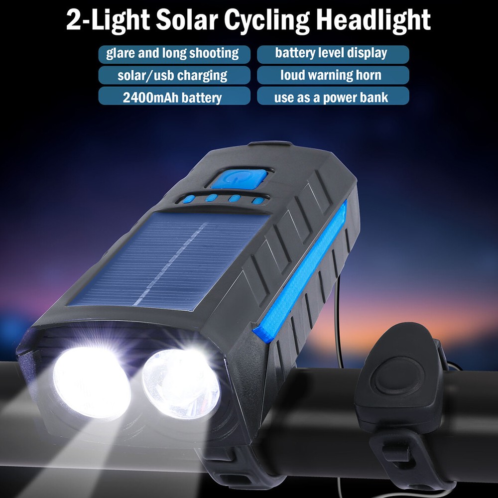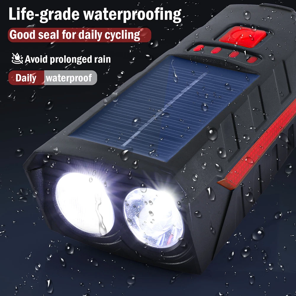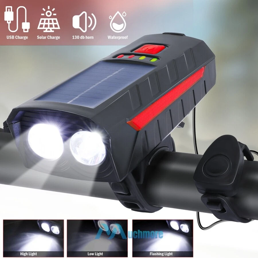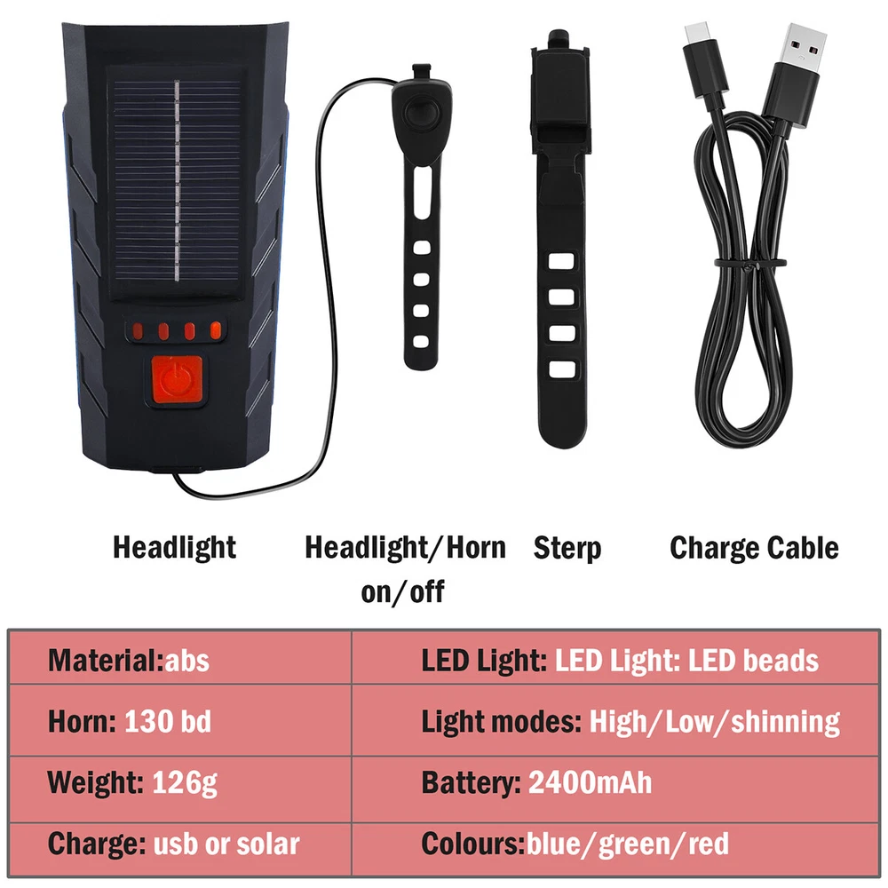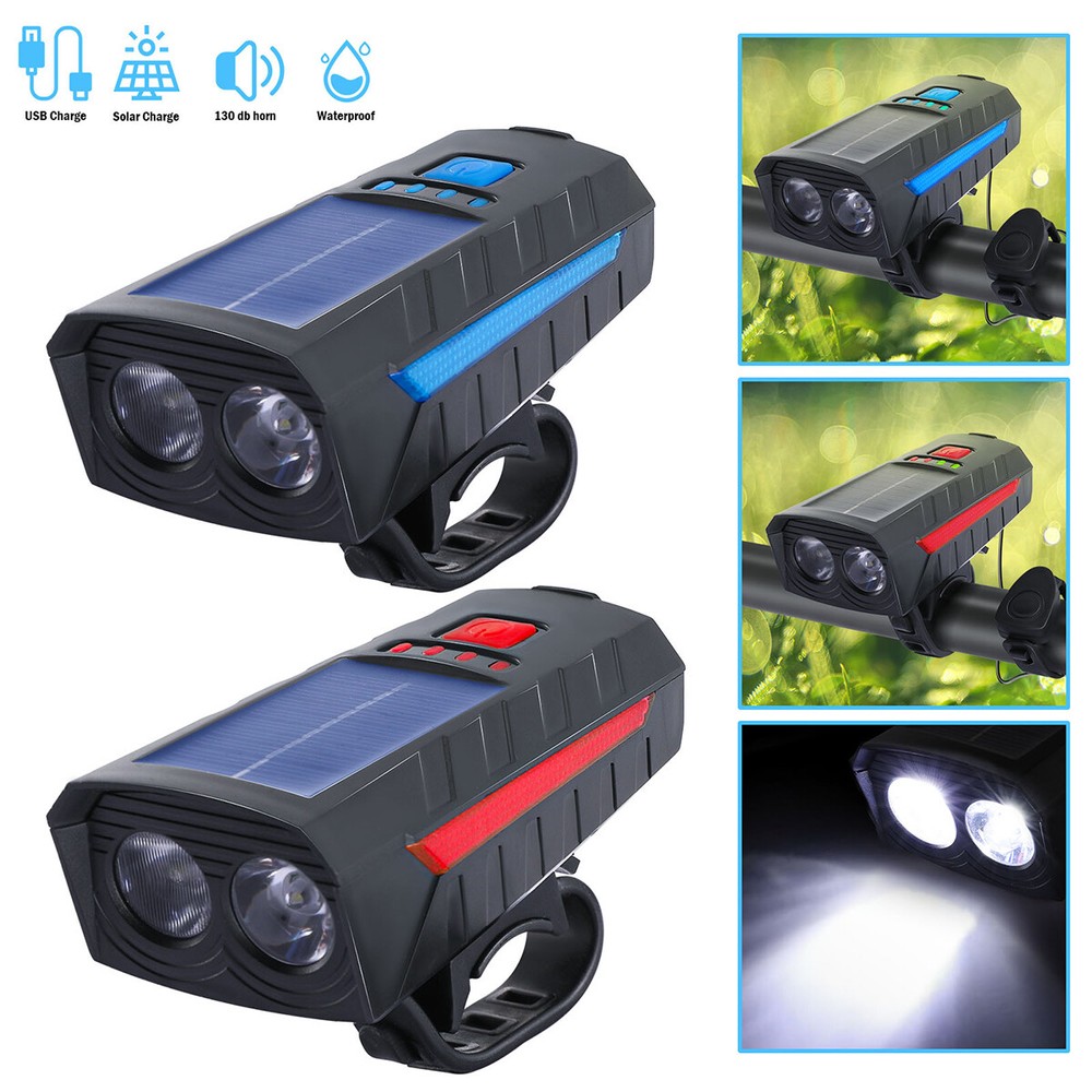 Solar Bike Light with Horn, USB Charging, 3 Modes for Night Riding