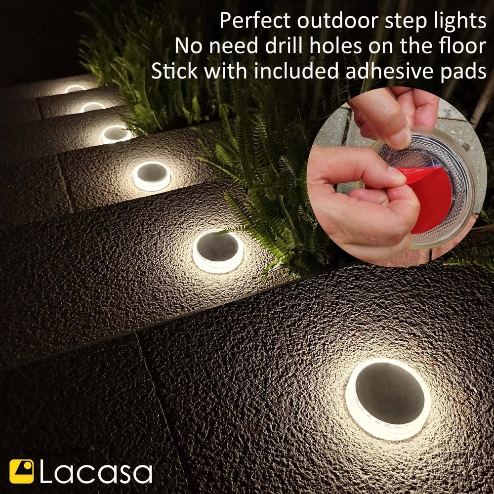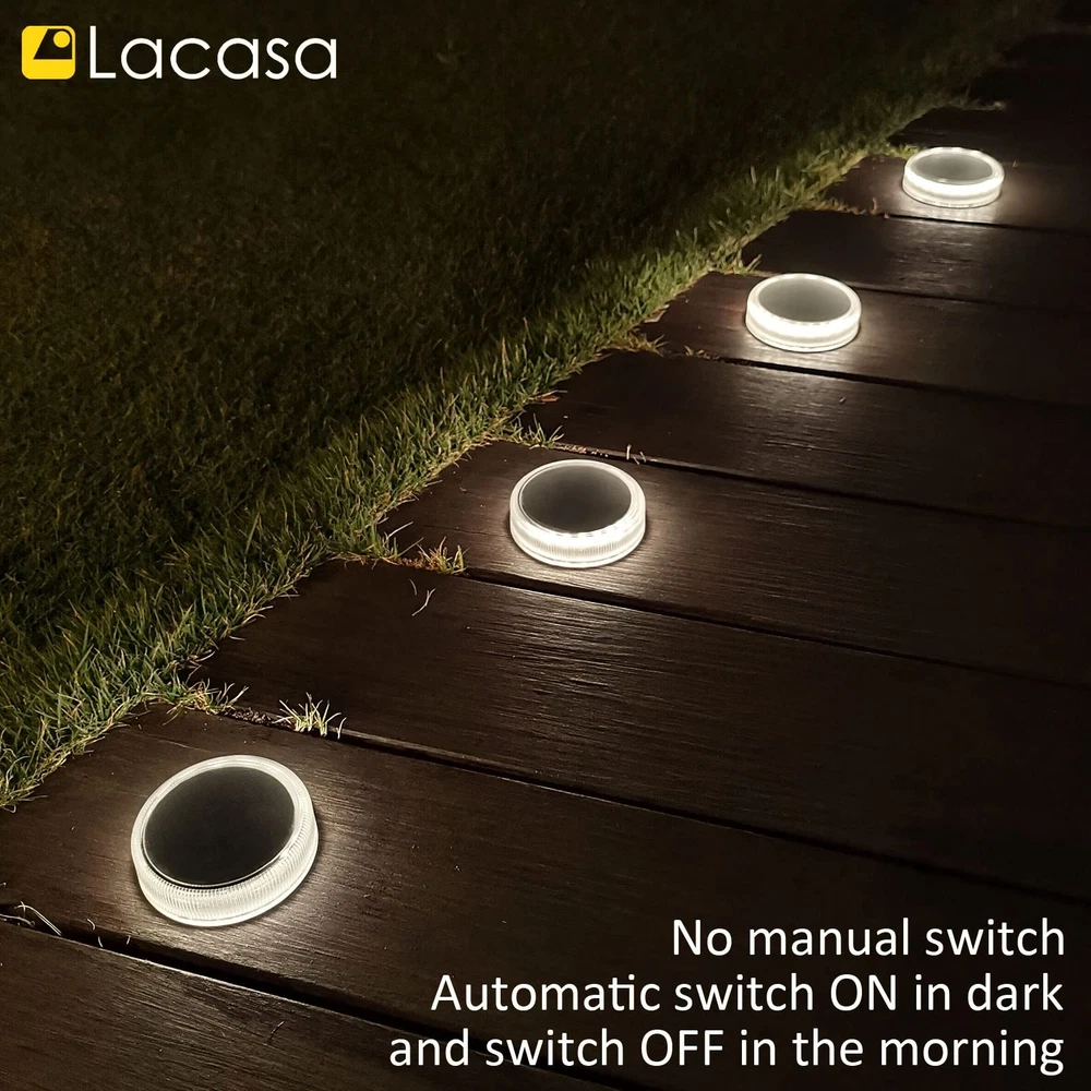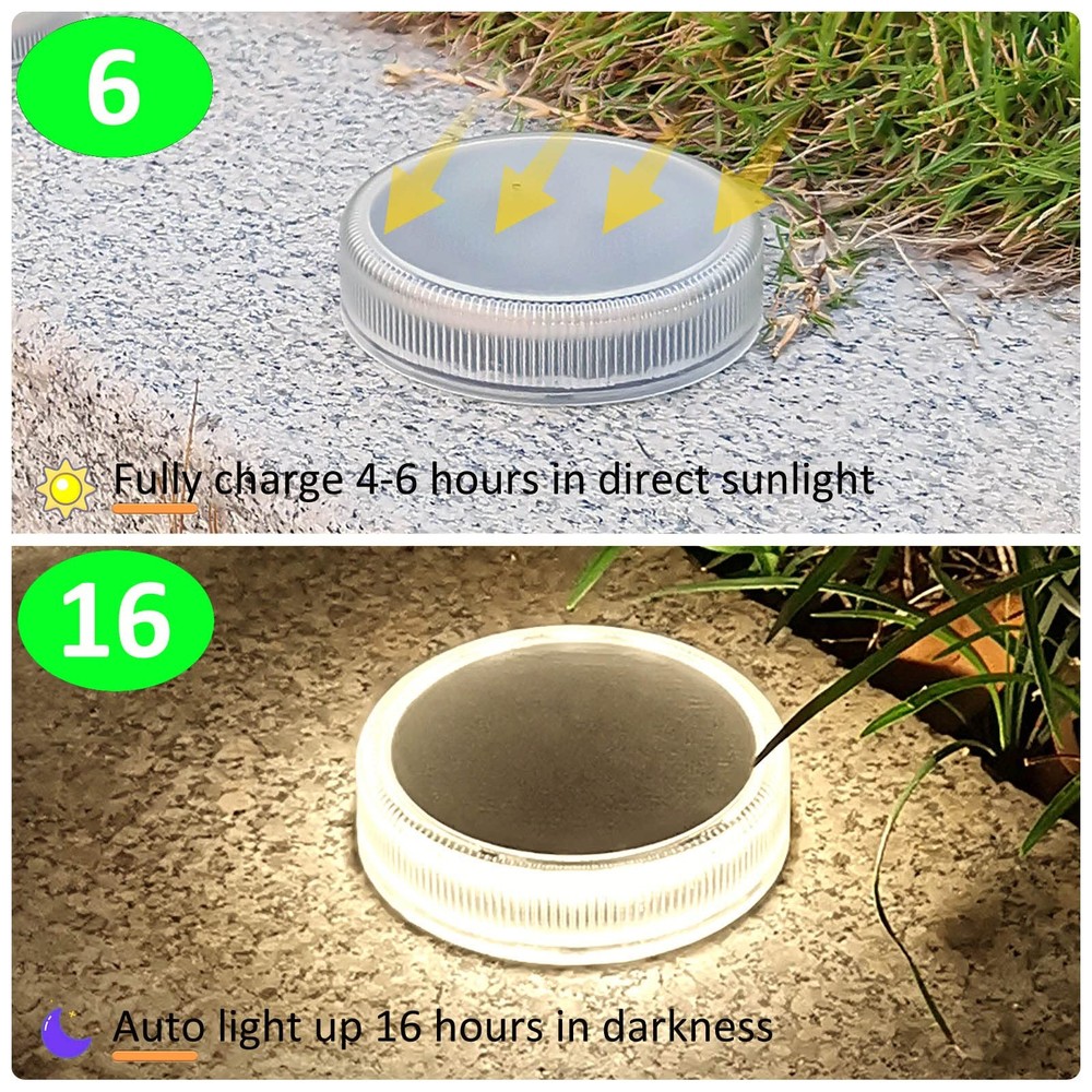 Features: - No manual switch for this deck light. - AUTO ON/OFF, light up ONLY in dark. - Battery is exhausted before shipment. - Charge 4 hours by solar before use. - Install to direct sunlight for sufficient charge. - Working time will be shorter in winter or cloudy days. 【Large Solar Power】: Built-in 700mAh battery and big solar panel, Deck lights solar powered can get fully charged in 6 hours by sunlight, and lights last all night long until morning. They are perfect outdoor solar lights for garden path. 【30LM Bright 4000K Neutral White】: Distribute up to 30 lumen bright light, nice ring of light come from the side 20 LEDs, the solar deck lights can upgrade your garden or swimming pool dock to be bright, secure and beautiful. 【Easy to Install】: The solar step lights are designed to be attached on outdoor steps or floor with included waterproof adhesive pads. No need to drill holes which will damage the floor. 【Waterproof and Durable】: The solar deck lights were assembled with ultrasound-based self-sealing method, they are IP68 waterproof, weatherproof and robust for car drive over, great for your driveway. 【Outdoor Solar Lights】: 4 Pack solar ground lights have no manual switch, they automatic switch ON in dark and switch OFF in the morning. Ideal for garden steps, deck, dock, pathway, driveway, patio and wherever with direct sunlight.