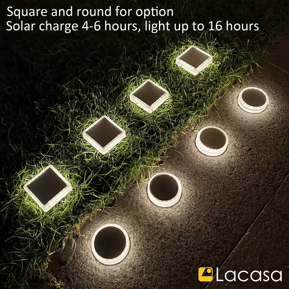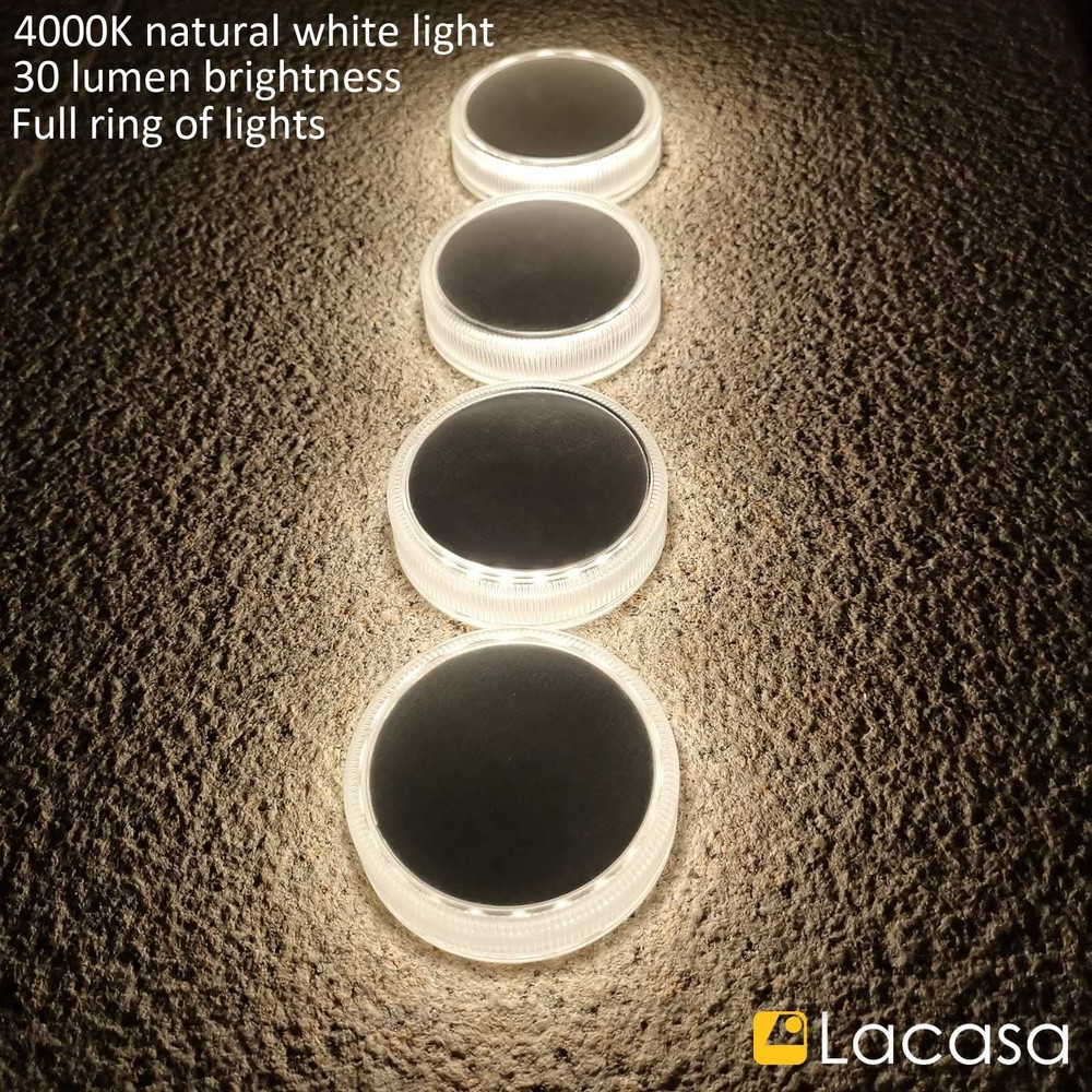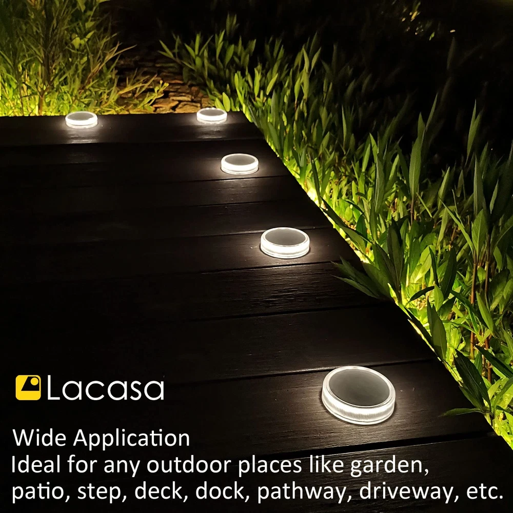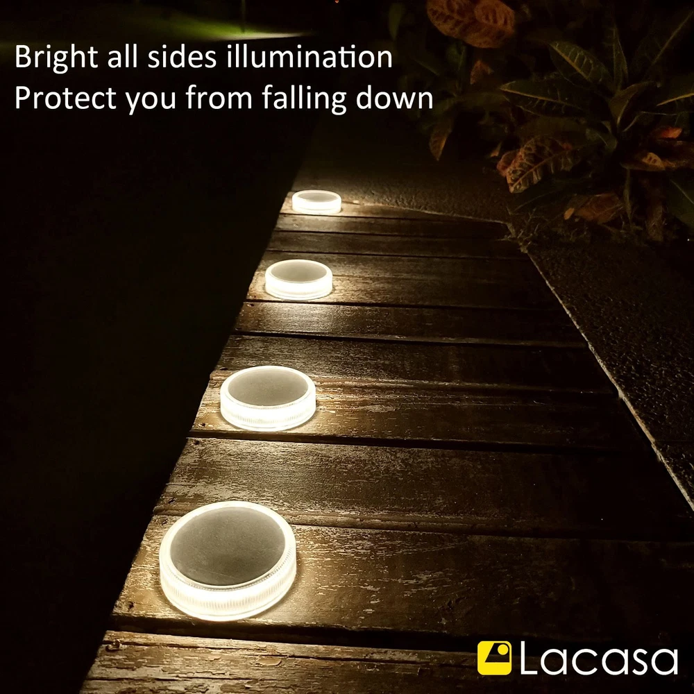 Features: - No manual switch for this deck light. - AUTO ON/OFF, light up ONLY in dark. - Battery is exhausted before shipment. - Charge 4 hours by solar before use. - Install to direct sunlight for sufficient charge. - Working time will be shorter in winter or cloudy days. 【Large Solar Power】: Built-in 700mAh battery and big solar panel, Deck lights solar powered can get fully charged in 6 hours by sunlight, and lights last all night long until morning. They are perfect outdoor solar lights for garden path. 【30LM Bright 4000K Neutral White】: Distribute up to 30 lumen bright light, nice ring of light come from the side 20 LEDs, the solar deck lights can upgrade your garden or swimming pool dock to be bright, secure and beautiful. 【Easy to Install】: The solar step lights are designed to be attached on outdoor steps or floor with included waterproof adhesive pads. No need to drill holes which will damage the floor. 【Waterproof and Durable】: The solar deck lights were assembled with ultrasound-based self-sealing method, they are IP68 waterproof, weatherproof and robust for car drive over, great for your driveway. 【Outdoor Solar Lights】: 4 Pack solar ground lights have no manual switch, they automatic switch ON in dark and switch OFF in the morning. Ideal for garden steps, deck, dock, pathway, driveway, patio and wherever with direct sunlight.