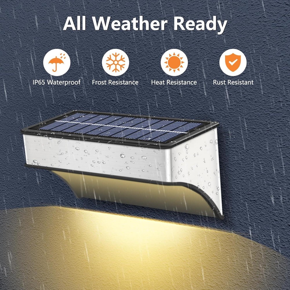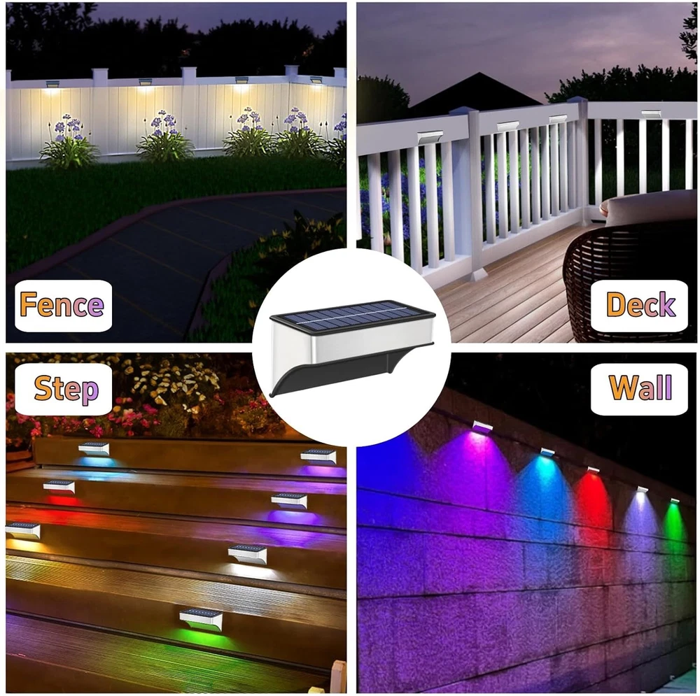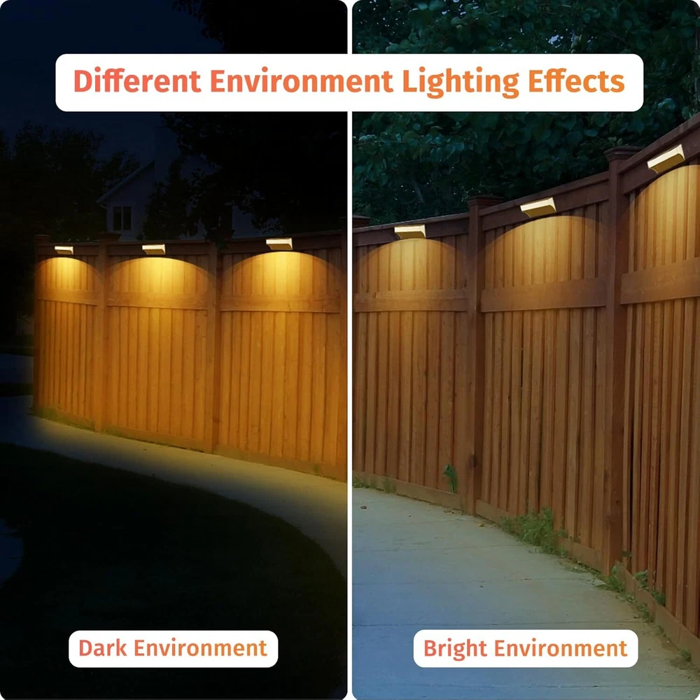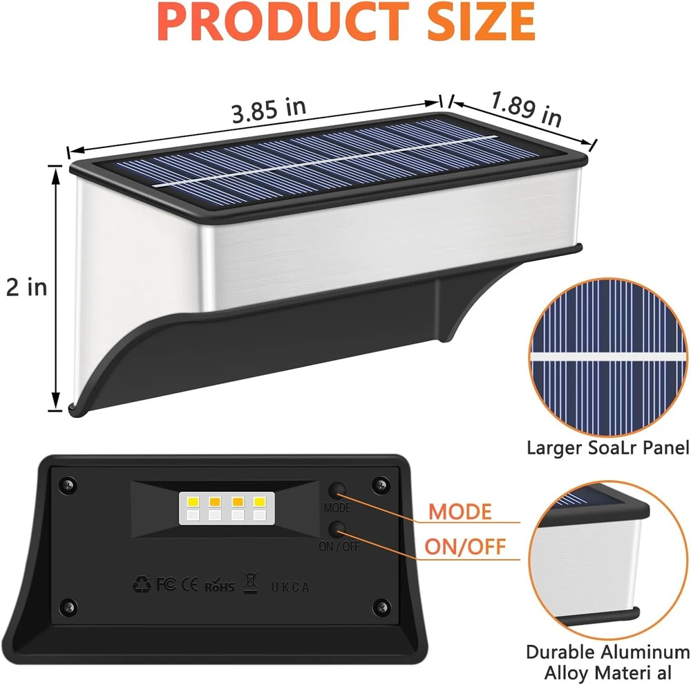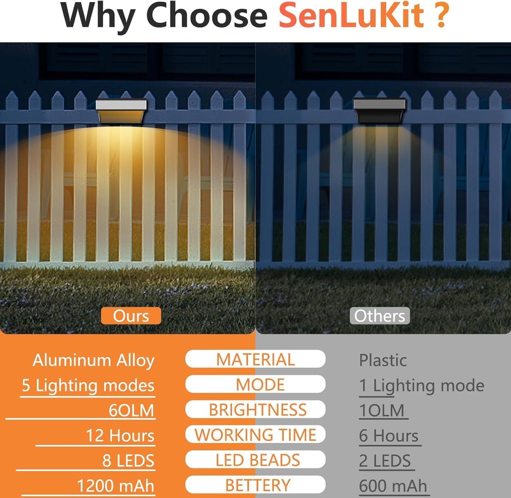 đăUnique Light & Dazzling Nightsă- SenLuKit solar fence lights feature a 8 leds design. It's unique and special lighting that shines up and down, creating a nice puddle of light on the ground, adding a stunning glow to your home's exterior. This would be perfect for Halloween or Christmas decoration! đăDusk to Dawn Auto On-Offă- No more hassle of manually switching every day, enjoy the convenience of an intelligent lighting system. Our wall mounted solar lights turn on at sunset, providing beautiful illumination, and turn off at sunrise, utilizing solar power for charging. Ensure a full charge before the first use to optimize battery life. đă Enjoy Your Colorful Nightă- Our outdoor solar patio lights offer 5 modes and 10 color, perfect for walls, porches, entrances, pillars, pool, decks, railings, stairs, patios, backyards various outdoor settings. The color-changing mode creates a delightful atmosphere for outdoor events. đăBigger Panels, Brighter Nightsă- Our solar wall lights come with larger solar panels and a high-capacity 1200mAh battery, making them brighter than others with just small panels and 500mAh batteries. SenLuKit solar stair lights only need 6-8 hours of direct sunlight to provide all-night lighting. đăUpgraded Waterproof & Durableă- With a hard and durable Aluminum Alloy housing and high-quality solar panels, IP65 waterproof backyard lights is designed to withstand wind, rain or snow. The high-efficiency polysilicon solar panels (5V, 200mA) enhance energy conversion, providing stable and reliable performance for longer-lasting illumination compared to conventional batteries. đăEasy Installation and Memory Functionă- Our solar fence light is designed for easy installation, requiring no complex steps. Simply set the light to the "ON" position before installation, as it will not charge in the "OFF" position. The outdoor solar light's smart memory function can automatically reverts to your most recently used mode. Use the mode adjustment button to switch between colors and lighting modes, providing consistent and convenient illumination. đăCustomer Satisfaction Guaranteeă- We stand behind the quality and performance of outdoor solar fence lights. If you have any issues or concerns, our dedicated customer service team is ready to assist you. Invest in our outdoor solar lights for a worry-free lighting solution.