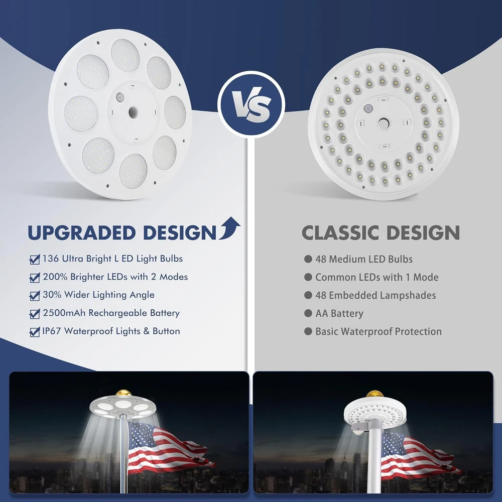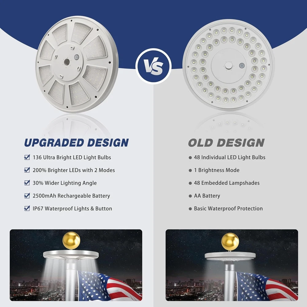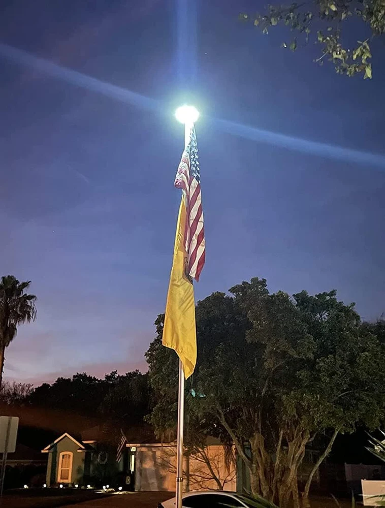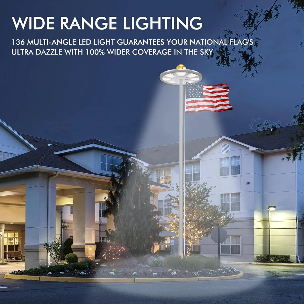 Store Categories Store Categories Other Solar Flagpole LED Light 136LED Flag Pole Light Waterproof Outdoor Pole Top Lamp Product Description Features: 【136 LED Solar Flag Pole Light】Our solar flag light with 136 multi-angle LEDs ensures your flag shines brilliantly even at night. Designed to be U.S. Flag Code Compliant, it perfectly lights up every part of the flag with 100% flag coverage. 【Impressive 10000h Lifespan】Illuminate your flag properly for years with a simple 30-second setup. The solar flagpole light fits standard 15-25 ft flag poles with a shaft diameter of less than 0.63 inches. Please check the specifications to ensure it is compatible with your flagpole. 【66 Solar Panels & Auto On/Off】It is powered by a 2500mAh rechargeable lithium-ion battery and 66 scattered solar panels that store energy from the sun more efficiently. This allows the solar light to last for up to 10 hours consistently from dusk to dawn. To use the light, push the "ON" switch in either of the two lighting modes. 【Reliable 1-Year Warranty】The flagpole light comes with 1 Solar light, 1 Tube, 1 Hook & 1 Clip, all backed by our commitment to quality. Please Note- It does NOT include a Top Ball, Flag & Pole. 【Experts in Eco-friendly Lighting】The US Brand PPQ (Perfect Product Quality) is a leading expert in yard solar lighting. Our fire retardant technology ensures a safe yard and a carbon-free green lifestyle. By illuminating your flag with our flagpole light, you can show pride in your patriotism, honor the Stars and Stripes, and show love for veterans Specifications: - Color: White - Material: ABS - Light-emitting chip: 136 LED Package Included: 1 x Solar Flagpole Light 2* Hanger Accessories Tips: 1. Please use a 15-20 foot flagpole with a 0.5"-0.6" pole on the top. 2. Please tear off the protective film on the solar panel for the first time. 3. Make sure that the light switch is in the ON position before installation. 4. If you want to get the best performance of 128 LED solar lights, please ensure 8 hours or more sunlight, about 10 hours of lighting, 5. Please note that this list only applies to solar flag lights. Does not include balls, bolts, decorations, flags or flagpoles. The props in the product pictures are only for demonstration and application purposes. 6. The maximum brightness of the flagpole is 640 lumens. If you want your flagpole to light up longer at night, please select "I" level. If you want to get 640 lumens of brightness at night, please choose the "II" level. Copyright © 2023 Dianxiaomi