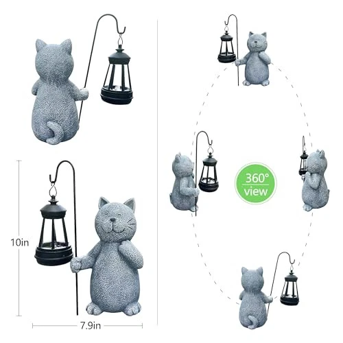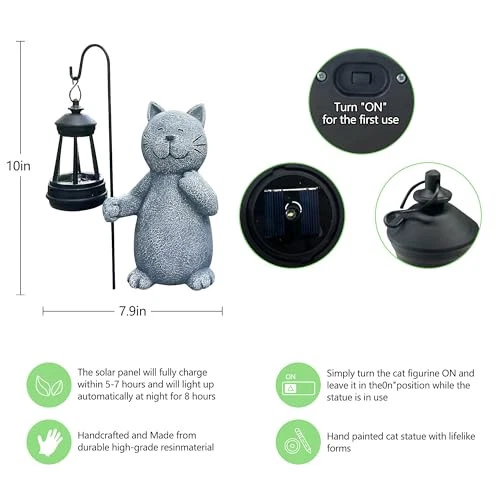 30 Days Return Policy Fast Delivery Trusted seller Solar Garden Decor Statues Figurine: Garden Art for Patio Balcony Yard Lawn - Unique Christmas Birthdays Gifts for Mom Grandma Women Wife Sister Product Description 【Perfect after-sales service 】 If you have any questions or opinions about the resin cat statue of the sun lamp, please feel free to communicate with our customer service at any time. We will provide you with satisfactory after-sales service within 12 hours. We provide a 90 day replacement or risk-free refund warranty for every cat enthusiast. 【 Exquisite Design 】 This smiling cat is holding a solar lantern in its right hand and chin in its left hand. Its fingers are lifelike and its beard is visible, making it extremely cute. Suitable for various indoor or outdoor scenes. The size of this solar powered cat resin statue is 5X5X10 inches. 【Versatile Placement】: Suitable for patios, balconies, yards, and lawns, this garden art piece can be placed anyw to enhance your outdoor decor.Solar-powered garden statue featuring an adorable cat figurine design, perfect for adding a touch of charm to your outdoor spaces. 【The Best Choice for Home Garden Decoration Gifts】This solar powered statue cat is not only a great gift for various occasions, such as birthday, Christmas, Mother's Day, or Father's Day, but also a perfect choice for occasions such as Easter, Thanksgiving, weddings, Valentine's Day, New Year, and graduation ceremonies. It is a warm and perfect choice.. It can even be given to cat enthusiasts, animal enthusiasts, your friends and family. 【Low Maintenance and Illuminating】: Powered by solar energy, this garden statue requires no wiring or electricity, making it an eco-friendly and hassle-free addition to your outdoor space.The integrated solar lantern provides warm, ambient lighting at night, creating a cozy and inviting atmosp Shipping Returns Payment Shipping Shipping is FREE to all addresses other than APO/PO boxes in the lower 48 states. All our stock ships from US-based warehouses. Shipped via USPS or UPS (depending on location and package weight) Unless stated otherwise, all orders will ship within 24-72 hours of your payment being processed. Check our feedback to see the great reviews of FAST shipping we offer. Returns As our valued customer, we will do our best to make sure the product you receive arrives to you on time and as expected. If you are not satisfied with your purchase, please contact us within 30 days of receiving your order to process a return. Payment We currently accept payment via eBay managed payments only. Once payment is cleared, we will dispatch your shipment within 1-3 business days. Please refer to the "Shipping" tab for more information regarding shipping speed to your destination.