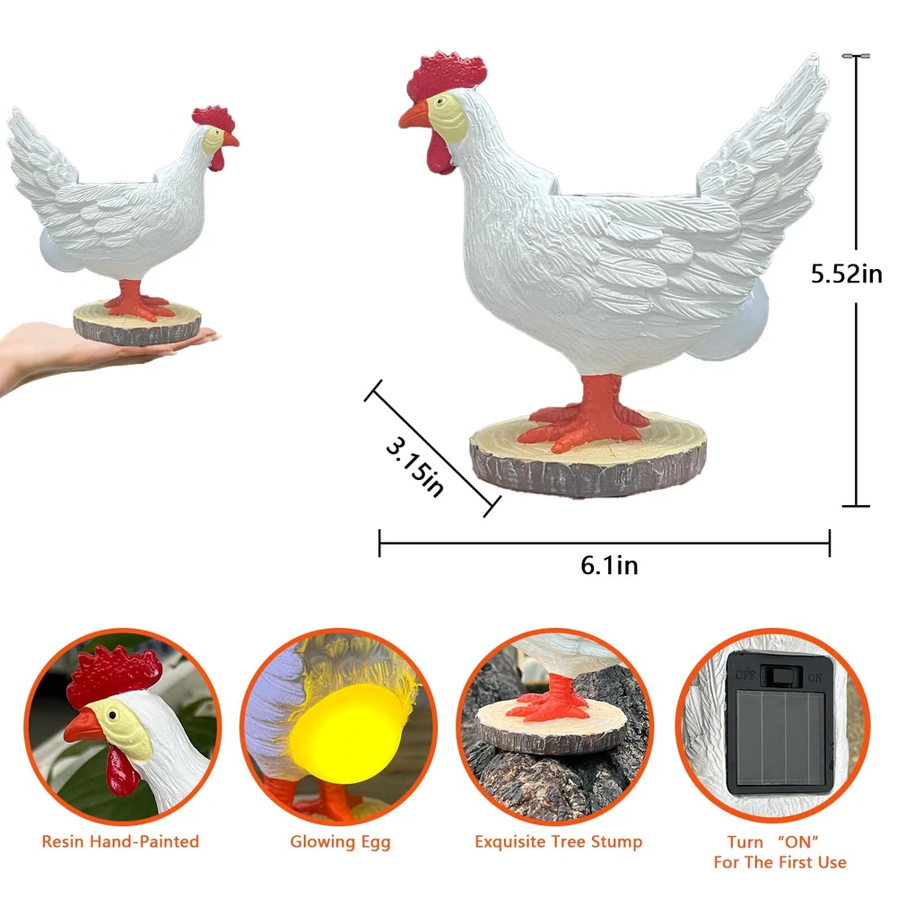 Solar Garden Statues Outdoor Decor - Miniature Chicken Egg Lamp Figurine Thanksgiving Decorations Chickens Lights with Egg in Butt LED 3D Sculpture for Patio, Lawn - Unique Christmas Housewarming Gift Solar Garden Statues Outdoor Decor - Miniature Chicken Egg Lamp Figurine Thanksgiving Decorations Chickens Lights with Egg in Butt LED 3D Sculpture for Patio, Lawn - Unique Christmas Housewarming Gift Free Shipping 24/7 Customer Service Premium Quality 【One-of-Kind Chicken Egg Lamp Presents】- In many cultures, hens symbolize great maternal love, kindness and the continuation of life, making the chicken lamp with egg in butt an excellent gardening gift for mother, grandma, wife, daughters and sons to show your love and appreciation on special occasions like Christmas, Mother’s day, birthday, wedding anniversary, Thanksgiving, Valentine's Day and Halloween. Also suitable to be a housewarming gift to your friends for its cozy lighting. 【Easy to Operate Solar Garden Decoration】-This lifelike LED solar chicken decor is charged by a solar panel in 6-8 hours during the daytime and illuminating your garden for 8-10 hours when night falls with a warm glow without worrying about electricity bills. Simply leave the switch in the “ON” position during using, then place chicken egg lamp butt outdoor under direct sunlight for full charging. 【Robust Materials for Multi-scene Uses】- Made of durable resin material in an eco-friendly hand painted finish, our solar chicken egg lamp is sturdy and weather resistant that will stand the test of time to be an eye-catching addition to your patio, porch, lawn, balcony or corridors. Whether setting in your modern style, country style house, or ranch, farm, the artfully painted chicken lights showcases your decorative aesthetics. 【Chicken Laying Egg Lamp Garden Statues】- An elegant white hen stands on a tree stump, laying a glowing egg emitting soft and glare-free light, which brings color, warmth and vitality to your peaceful courtyards and keeps you stay relaxed. The round tree stump base is wide enough to ensure gentle solar chicken with egg stands steadily without wobbling. 【Attention and Satisfactory Service】 - ATTENTION: Measuring 6.1*3.15*5.52 inches, our outdoor decor solar chicken laying egg lights figurines are not large-sized. Please make sure you have checked the dimensions before purchasing. At Scuyari, customer shopping experience is our priority. If you have any question about our products, just feel free to contact us and our friendly after-sales service team would be glad to help you resolve the problem in 24 hours. Shipping Information We offer FREE shipping on all orders! We ship within three business days of payment, usually sooner. We use a selection of shipping services such as UPS, FedEx, USPS, etc. We only ship to the lower 48 states, no APO/FPO addresses or PO Boxes allowed. Return Policy You can return a product for up to 30 days from the date you purchased it. Any product you return must be in the same condition you received it and in the original packaging. Please keep the receipt. Feedback Customer satisfaction is our top priority. If you have any problem with your order, contact us immediately. We respond to all inquiries within 24 hours and will do our utmost to ensure you are fully satisfied with your shopping experience. Contact Us If you have any queries, please contact us via eBay. Our dedicated customer support team prioritizes your satisfaction and guarantees a response within 24 hours on weekdays. Discover Dobby's Deals! Thank you for choosing Dobby for your shopping needs. Explore more premium items in Dobby's Store today!