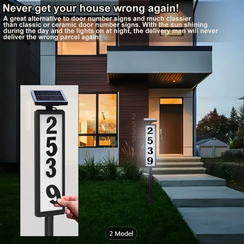1pc New Solar Digital Door Sign Light, Decorative LED House Number Light, For Houses, Villa Indicator Lights, Solar Powered [Height 35 Inches] Specification: Control Method: Light Sensor Embellishment: Other Embellishments Finish Type: Polished Special Features: Low-voltage Fixture Type: Detachable Light Fixture Form: Floodlight Lamp Shade Material: Acrylonitrile Butadiene Styrene Included Components: LED Lens Material: Acrylonitrile Butadiene Styrene Power Supply: Solar Charging Remote Control Included: No Battery Properties: Solar Battery Solar Battery: 2* 600mah Nickel Battery Solar Panel:2v 100mah Polysilicon charging time:6-8h Lighting Time:8h Features: Solar Powered: This doorplate light is powered by solar energy, making it eco-friendly and energy-saving. It charges during the day and lights up automatically at night. Illuminated House Numbers: The light illuminates your house numbers, making it easy for visitors, delivery drivers, and emergency services to find your home even in the dark. Ground Stake Sign: The light comes with a ground stake, allowing you to easily install it in your yard or garden. It's a perfect way to display your house number and add a stylish touch to your outdoor space. Waterproof: The doorplate light is designed with a waterproof feature, making it durable and suitable for outdoor use, even in rainy or snowy weather. Warm Tips: (1)Please note, the solar light is designed to work when the environment gets dark. The selected location should not benear a light source such as porch light or street light,as these might keep the solar lights from automatically turning on. (2)Although the battery has been charged by the manufacturer, the electric charge may have dropped by the time consumer receives the product, Please let the solar light charge for a full day for maximum performance. (3)The surface of the solar panel must be kept clean. Dust accumulated on the surface will reduce the charging efficiency. (4)If the solar light stops working after it has been used for a long time,the battery may need to be replaced. You may openthe battery cover and replace it with a new rechargeable battery. (5) If the solar light does not tum on automatically at night after 6 hours of charging during the day, please check the followings. Make sure the power switch is at the "W* or “C” position. Check the battery and make sure the battery contact the terminal securely. Package List: 1 * Solar house number light