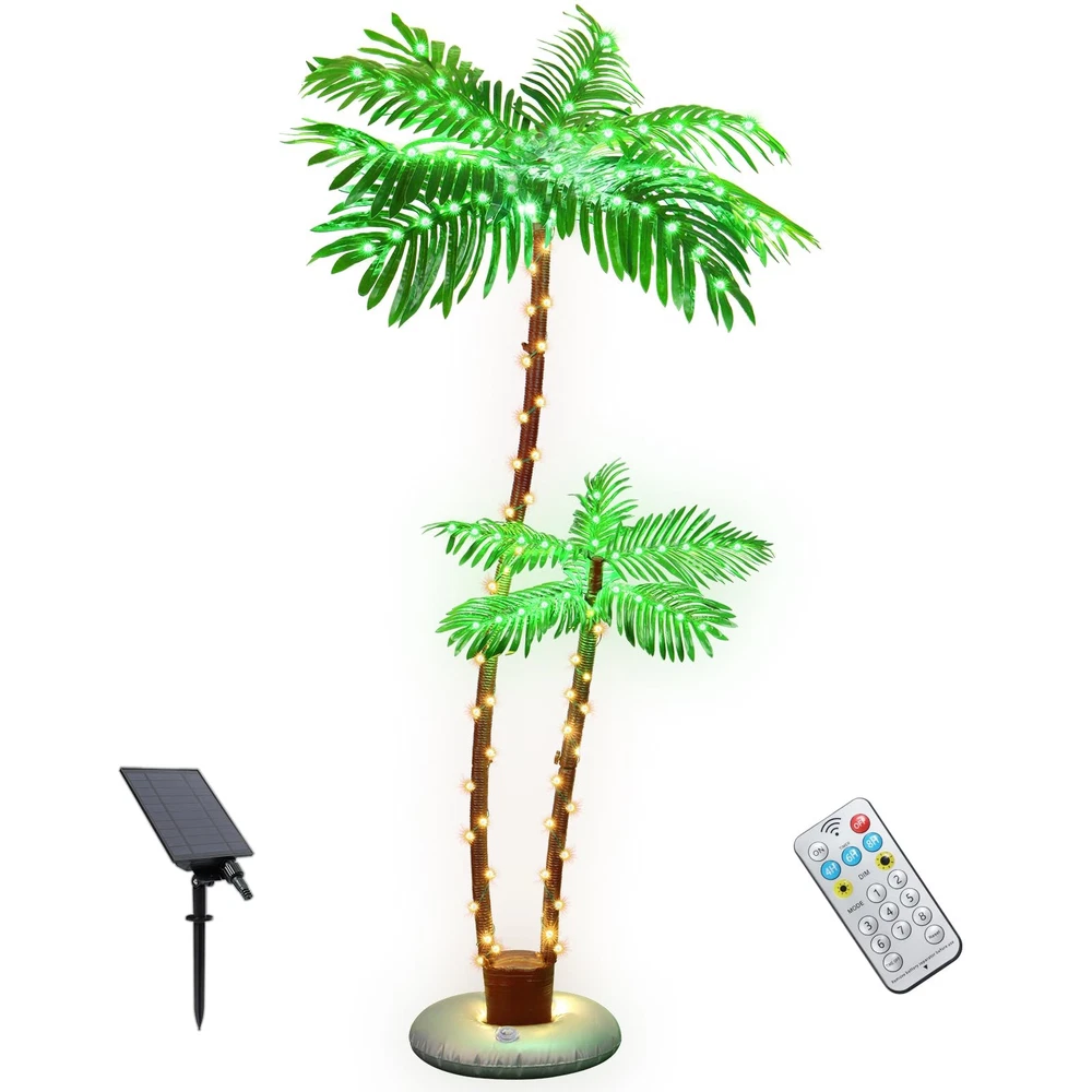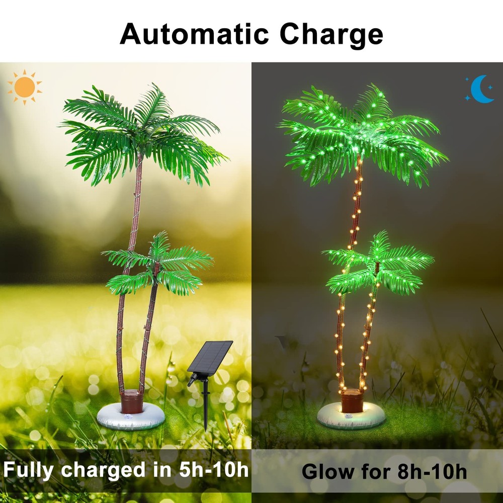 Solar Lighted Palm Trees for Outside Patio, Bar Pool Deck Outdoor Decorations Decor, Light Up LED Artificial Fake Tree Lights for Yard Tropical Party Christmas Solar Powered: Use solar energy to charge during the day and enjoy Hawaiian style lights at night. Only takes 5-10 hours to be fully charged, providing 8-10 hours of lighting for LED solar lights. IP65 Waterproof for indoor/outdoor use. 8 Lighting Modes & Timer - Solar Palm Tree Lights with 8 pre-programmed lighting modes (IN WAVES/SLO-GLO/FLASH, and so on). You can use the remote control to adjust the light mode and set the 4/6/8 timer to save energy. Steady On is the last mode. Sturdy Metal - Compared to the plastic materials used by others, palm tree uses a metal trunk wrapped in nylon rope, with a heavy-duty base and 4 ground stakes, which is beautiful and sturdy. Ideal Unique Decorations - Unique shape of two trees. You can freely adjust the shape of the trees to bring you different tropical styles. Ideal for Summer Bar themed parties and Christmas Eve event. Note: The item can be used outdoors but not extreme weather. US Patent Protected. If you encounter any problems during use, you can check the troubleshooting manual on the page or let us know directly.