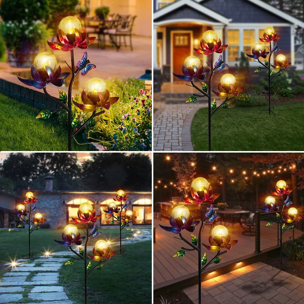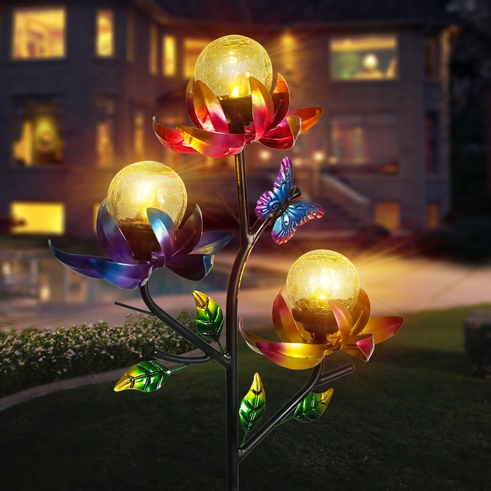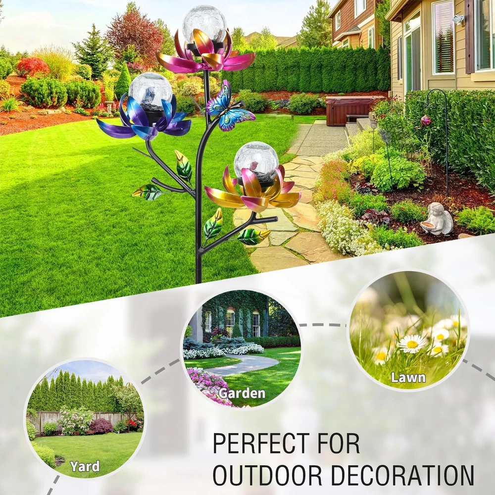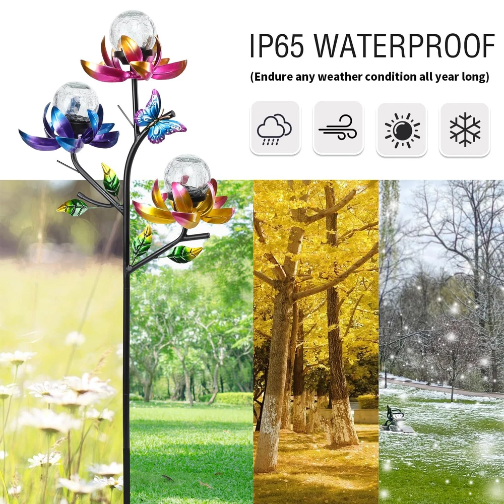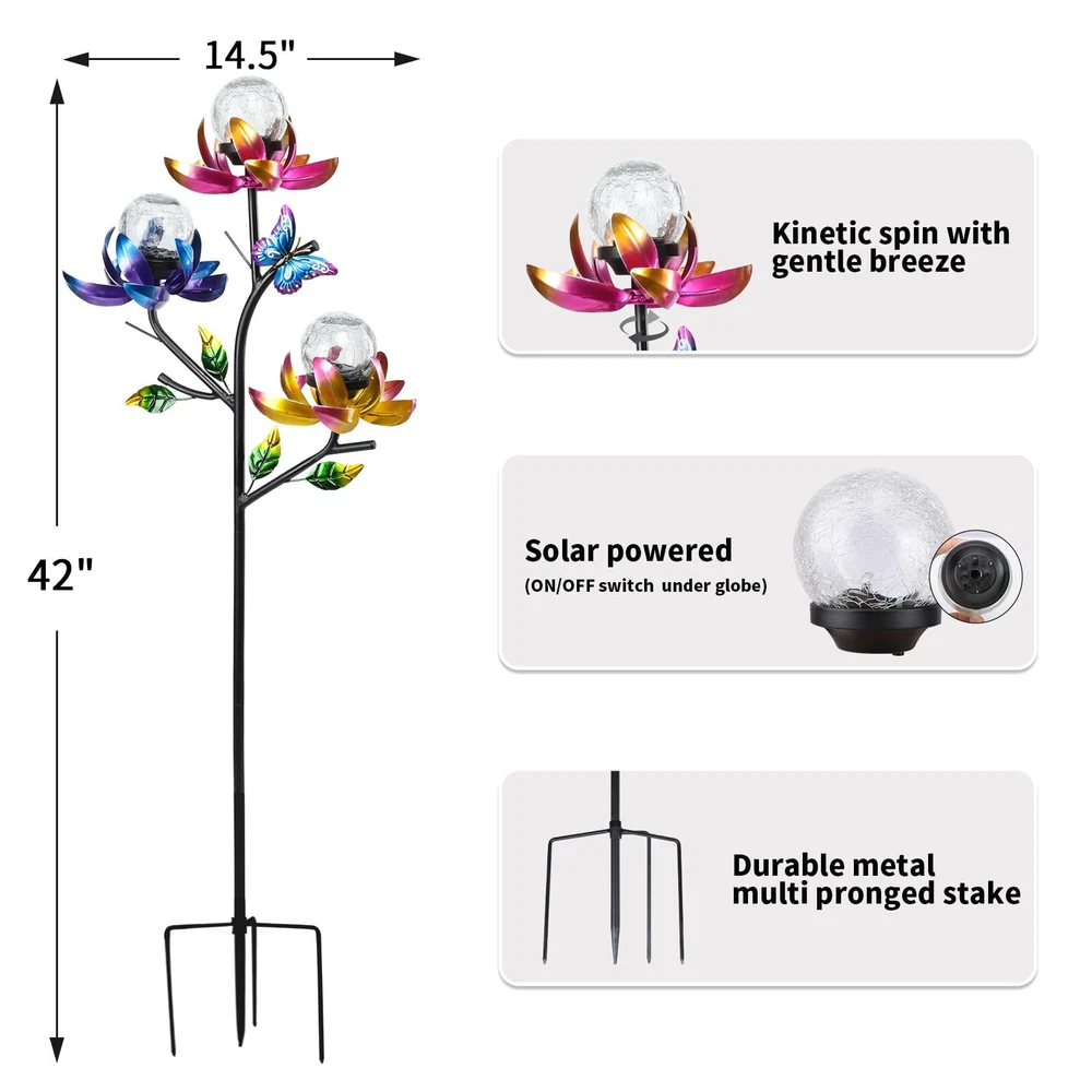 Catch the breeze and create a mesmerizing display of movement with this triple flower solar wind spinner. Brightly colored flowers in yellow, pink and blue rotate horizontally. Wind spinner outdoor is a beautiful piece of garden art in the daylight and, when the sun sets, the solar-powered globes illuminate to give you a magical nighttime experience. Every flower in this solar wind spinner is with integrated solar panels. Place garden solar lights decorative in direct sunlight and allow it to get 6-8 hours of direct sunlight to ensure a full charge. When fully charged, the stake should stay lighted for 6-8 hours. Swirling with color and light, this triple kinetic flower spinner makes the cutest holiday gift that breathes beauty and life into any garden! The weather resistant material allows enjoyment day and night, season after season. These solar garden stakes lights are equipped with a stake for easy placement. So you can place this decorative solar light in your garden, walkway or flower bed by staking on the ground.