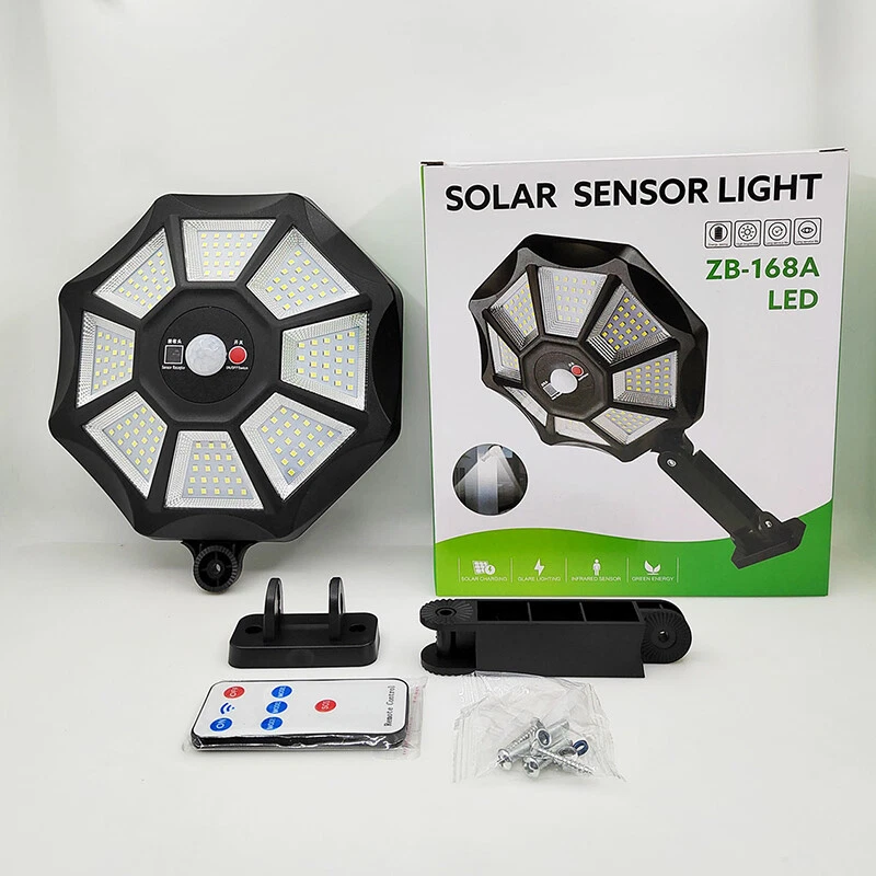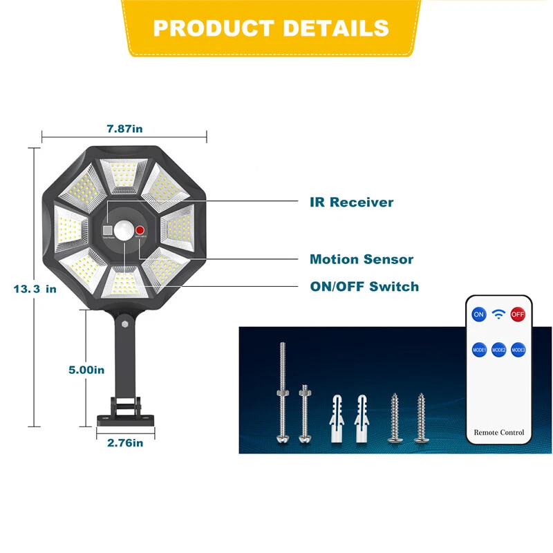 Description: Upgraded Octagonal Solar Outdoor Light: The upgraded solar lights for outside adopts unique octagonal design, equipped with 168pcs super LED beads, without any lighting blind area, providing you with the best lighting. 360° Wide Angle Solar Lighting: Outdoor solar flood light with high sensitivity and 180° adjustable bracket design, solar street light with polycrystalline silicon photovoltaic panels, photoelectricity conversion rate increased by 20%, you can adjust the angle of the solar panel to get the best daylighting effect. Waterproof & Long-lasting: The outdoor waterproof solar sensor light is made of Long-lasting, high impact resistant ABS material with a waterproof rating of IP65, making it able to withstand a variety of outdoor environments and other extreme weather conditions, easy to install and set up, no wires or tools required. Intelligent Radar Sensor Chip: The solar parking lot lights provides 3 lighting modes: Mode 1: 100% light brightness when motion is detected, and automatically turns off when there is no motion at night. Mode 2: When motion is detected, the light is at 100% brightness. After 20 seconds of no motion at night, it goes to 20% brightness. Mode 3: Lights automatically turn on at night at 50% brightness. Specification: Product Name: Solar Wall Light Color: Black Light Color: White (6500K) Material: Plastic Control Method: Remote Controll Light Fixture Form: Floodlight Lighting Method: Adjustable (3 Modes) Indoor/Outdoor Usage: Outdoor Power Source: Solar Powered Battery Capacity: 2400mAh Charging Time: 6 ~ 8hrs (Taking summer sunshine intensity as an example) Working Time: 6 ~ 10hrs Water Resistance Level: IP65 Waterproof Product Dimensions: 33.8 x 20 x 5cm / 13.3 x 7.87 x 1.97in Special Feature: Energy Efficient, Adjustable Height, Waterproof, Motion Sensor Package Included: 1 x Solar Wall Light 1 x Remote Control 1 x User Manual 1 set of Screw