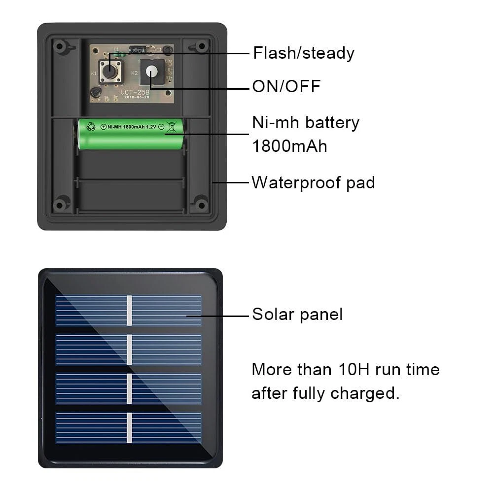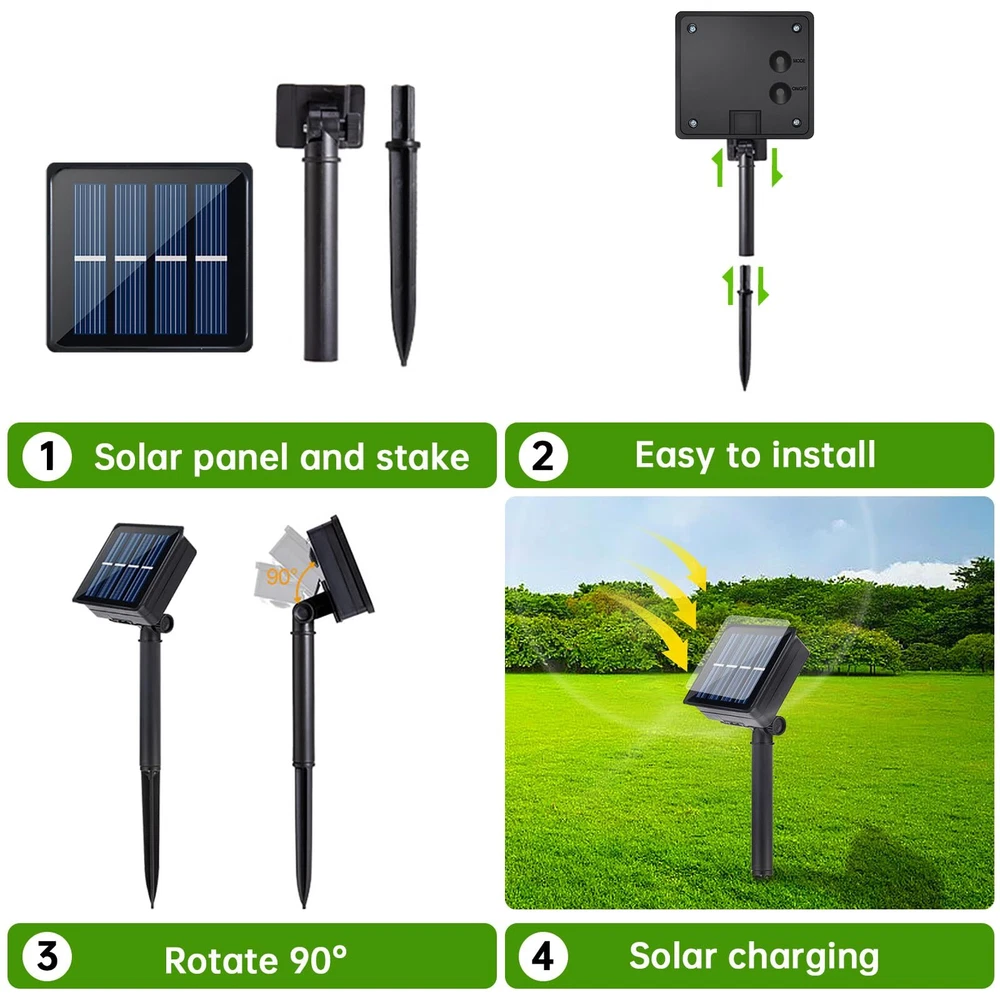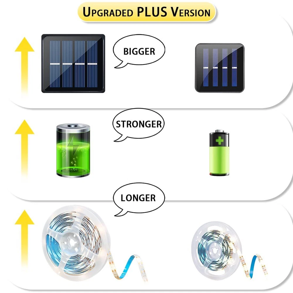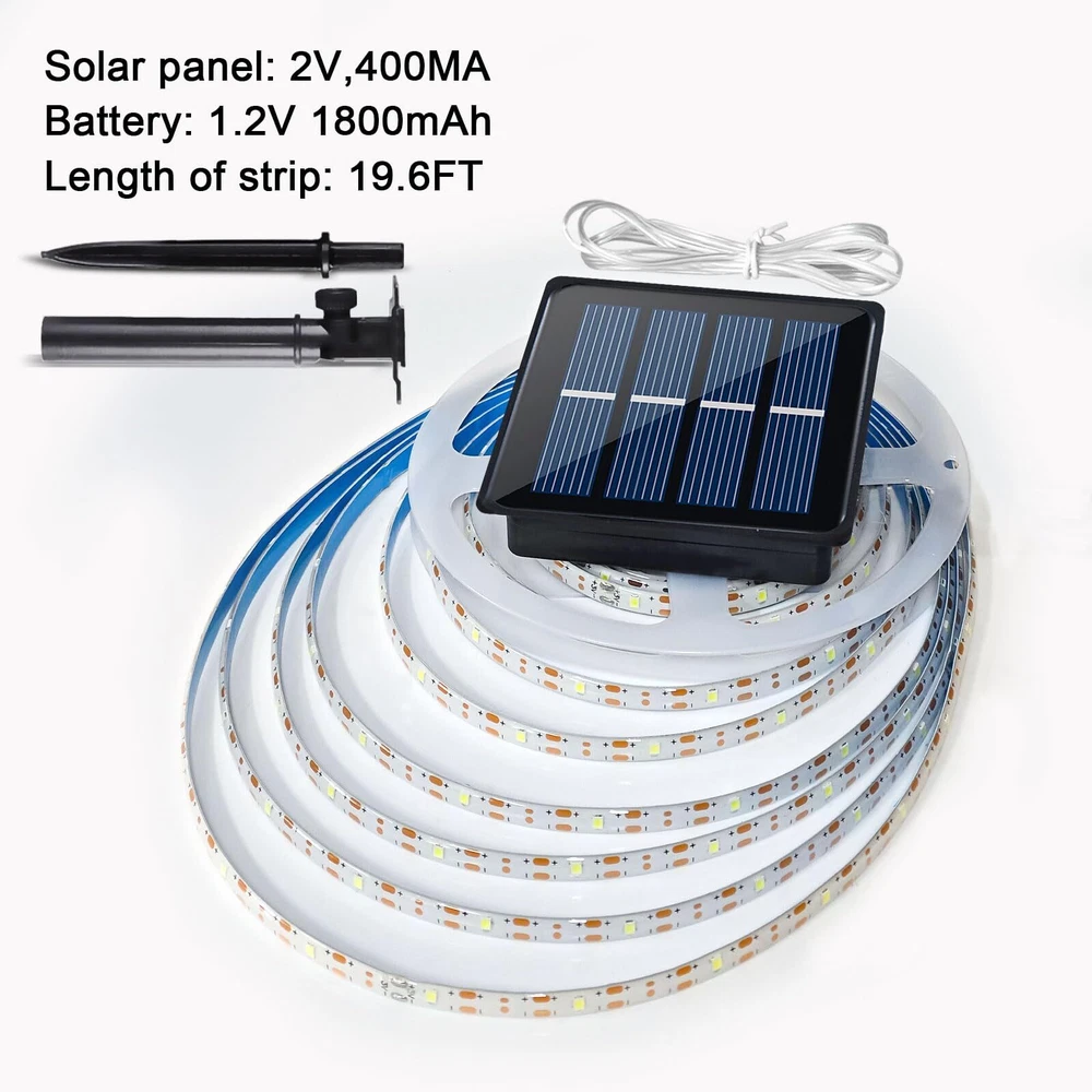 Specifications: Material: Plastic, resin Light source: Super Bright 2835 LED LED QTY: 180 LED Light Color: cool white Light modes: 8 modes(combination, in wave, sequential, slo glo, chasing/flash, slow fade, twinkle/flash, and steady on) Charging time: 6~8 hours Working time: 10-12 hours Operation temperature: -20℃ ~ +60℃ Stroage temperature:-40~80℃ Waterproof: IP65 Light length: 6 m/19.6ft Solar panel: 2V 400mA 0.8W Battery Type: Ni-Mh batteries, 1800mAh, AA size Solar panel size: 8.5*8.5cm/3.4*3.4 inch(L*W) Net weight: 0.62lb Package: 1 x LED Solar strip light 1 x Ground spike 1 x Solar panel Warm Notice If the solar lights become dim, it means that the solar strip lights has a low battery level, and it must be charged in sunlight as soon as possible, otherwise the solar powered strip lights will stop working. 【A Sustainable Solution for Outdoor Decorative Lighting】For a long time, lights have been utilized in many indoor lighting scenarios, and they are the protagonists of decorative lighting. Now, we are moving LED strips outdoors, using solar energy storage to automatically light up at dusk and automatically recharge at dawn. This doesn't require wiring or electricity bills, making it a sustainable solution for outdoor decorative lighting 【Upgraded Version, Longer, Larger, and Stronger】This solar powered light strip has been upgraded with a larger solar panel size of 3.5 inches, an increased battery capacity of 1800 milliampere-hours, extended size to 19.7 feet, and an upgraded number of LED lights to 180, making it look small but with sufficient energy 【Cuttable LED Solar Strip Lights, Adjust the Length According to Your Needs】The back of the light strip has double-sided adhesive, which allows the strip to be stuck on any flat surface. The strip can also be cut or folded to the desired length 【Waterproof and Cold Resistant, Suitable for Various Scenarios】In addition, solar powered strip lights are waterproof and weather-resistant, making them ideal for outdoor use in all seasons. These lights are typically used for outdoor lighting, such as garden paths, patios, decks, gate, yard, wedding, entrance hall, balcony, party, gazebo, or camping umbrella 【What’s In The Box】set of 19.7 ft solar panel connected light strip (with installed batteries), installation ground stakes and screws, and an instruction manual. We place great emphasis on brand quality and provide a 12-month quality as well as a 24-hour response