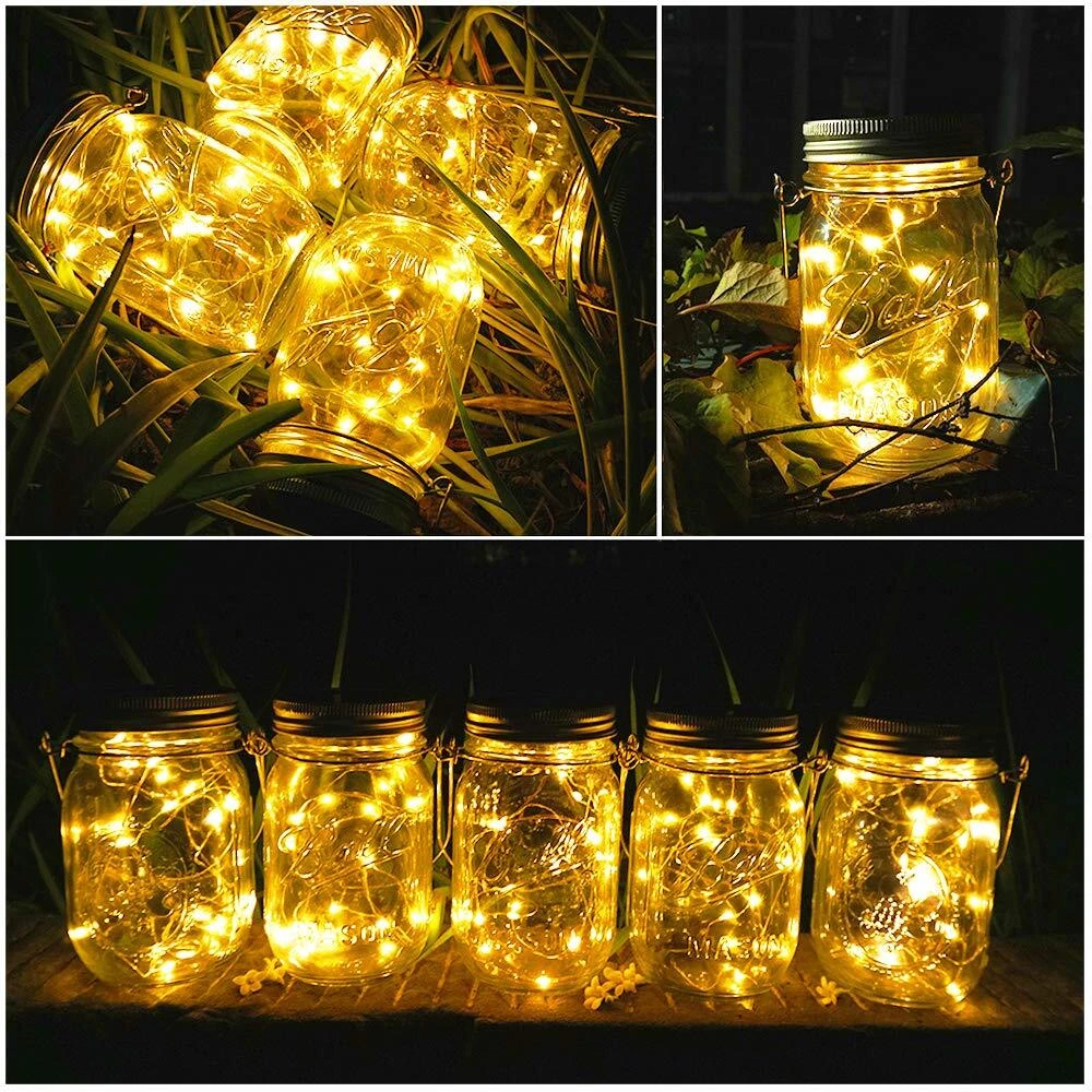 DIY Your Own Garden Decor Lights • With the mason jar solar lights, you could make full use of your mason jars to DIY beautiful garden decor lights, deck decor lights and patio decor lights. • Hang them on the tree, when you have a garden party or wedding night, these maosn jar night lights will definitely create beautiful and warm ambient beyond your expectation. • Put them in your patio or along the pathway, they will provide enough accent lighting for you. • Decorate your house indoor or outdoor as well, good choice when you need some sweet atmosphere. <2019 Upgraded Model> - Rust resistant layer, more durable. - Larger solar panel, charge more efficiently. - 15 LED bulbs, brighter than 10 bulbs old version. - Reinforced waterproof design, more durable in rough weather. Warm Notice: Light color: Warm White Led Light Quantity: 15 Charging Time: full recharge need 6 hours. Working time: 5-7 hours when the battery fully charged Lid Diameter Size: 2.76 inch(70mm)/Insert 2.17 inch(55mm). If you receive the lid lights and find it is not bright, please put the lids under the sun for charging at first. Please notice that each lid has a switch below, slide it to turn on before charging by solar. Package included: 6 x Solar mason jar lid lights(AAA Rechargeable Battery Included) 6 x Stainless Steel Wire Hangers Tips: Mason Jars Not Included is a brand dedicated in decorative lights, our factory has 5 years experience in lights craft. We always listen to our customers’ advice and improve our product. We believe that our products can bring you a good shopping experience. UPDATED MASON JAR LID LIGHTS - Cozy warm Lights, with 15 micro LED, much brighter than 10 LED jar lights. Larger solar panel, charge more efficiently. The edge of the lid uses rustproof material instead of cheap alloy, you would find it more durable in humid weather. SOLARPOWERD - Press the button to switch it on and expose them to direct sunlight, a built-in light sensor ensures that it turns on at dusk and turns off by dawn automatically. Generally charge in the sun 6-8h will light up 8-12h. If there is not enough sunlight in your area, you can also place one AAA battery to make it work. INDOOR & OUTDOOR - You can use this jar lid light in your bedroom/kitchen/living room to create a comfortable environment, besides, due to the O-shape seal ring design, this jar lid light is 100% waterproof! You can rest assured to put your shinning mason jar in your yard/garden, no need to worry about the rain. DIY WITH CREATION - Enjoy decorating your Mason jar with your creation! Shape the silver string lights as you like and fill mason jars with fruit, sand, dried flowers, shells, pebbles, berry sprigs, seasonal things etc., let your imagination run wild. WHAT YOU GET - Pack of 6 units of Mason Jar LED String Lights Lid with 6 hangers. A very Good Deal to order. LED lights can last 50,000 hours under regular using, with 12 months Quality !