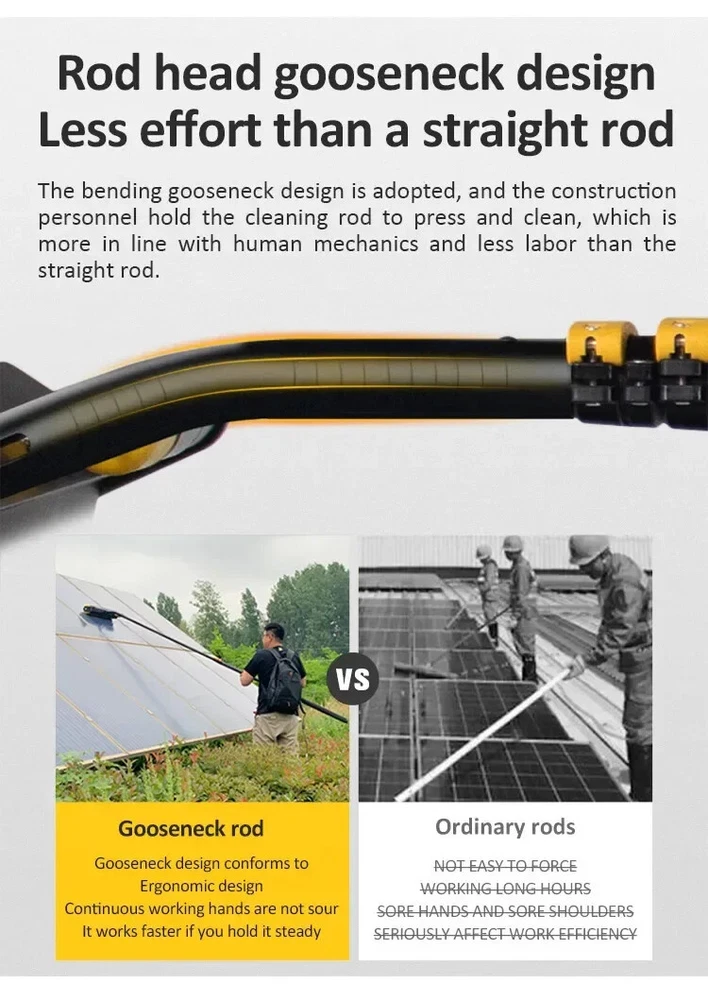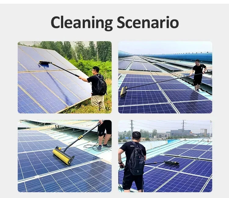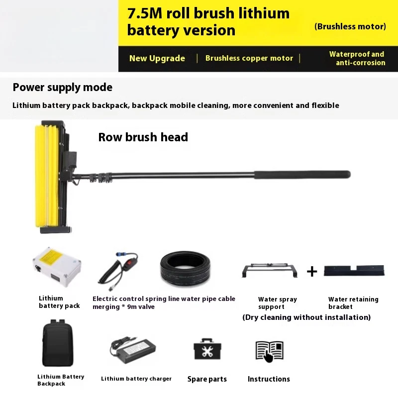 solar cleaner robot Panel Electric Cleaning Bru sh panel cleaning tools cleaner brush Motor speed 700r/min The motor power 150 watts The motor voltage 24v Rod length 3.5/5.5/7.5 Pipe diameter 35/40/40 The length of the wire 16 Length of water pipe 20 The power supply mode 220V mains/lithium batter The battery voltage 24v Lithium battery capacity 26 ah The battery 8 to 10 hours Use your time 4 to 5 hours Brush materials New nylon yarn Cleaning width 60 cm Application Details Images
