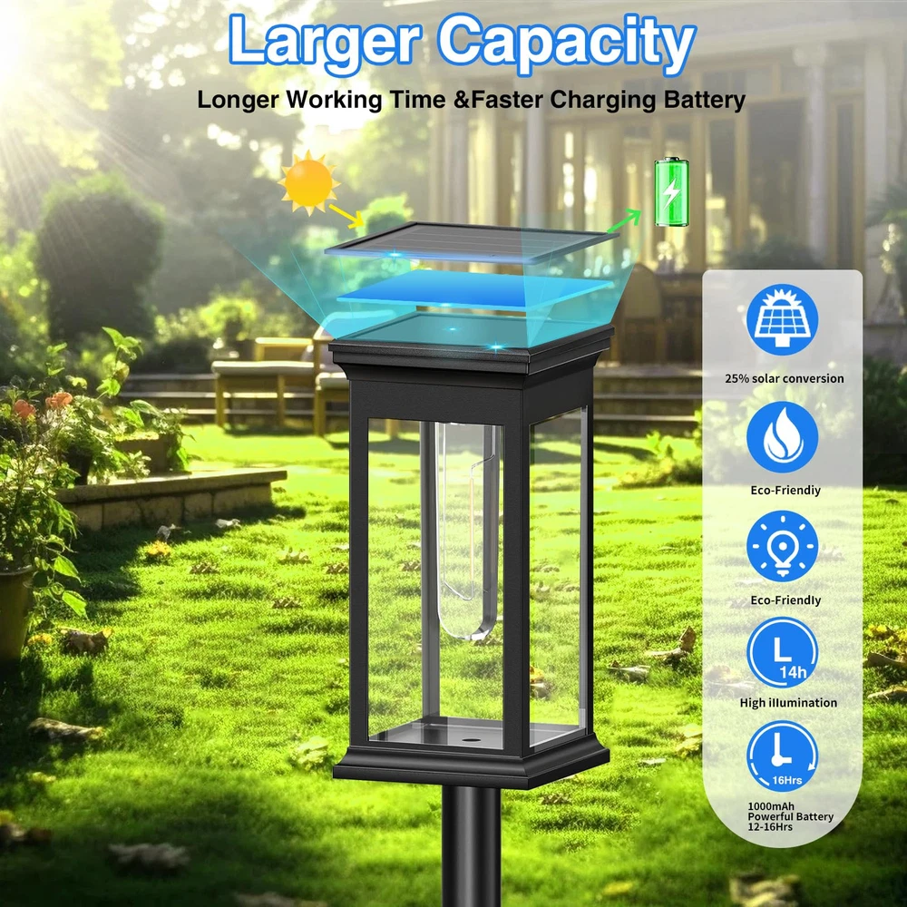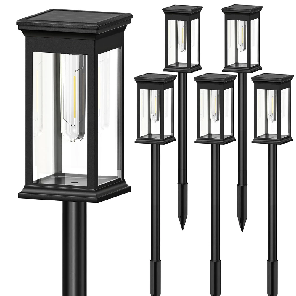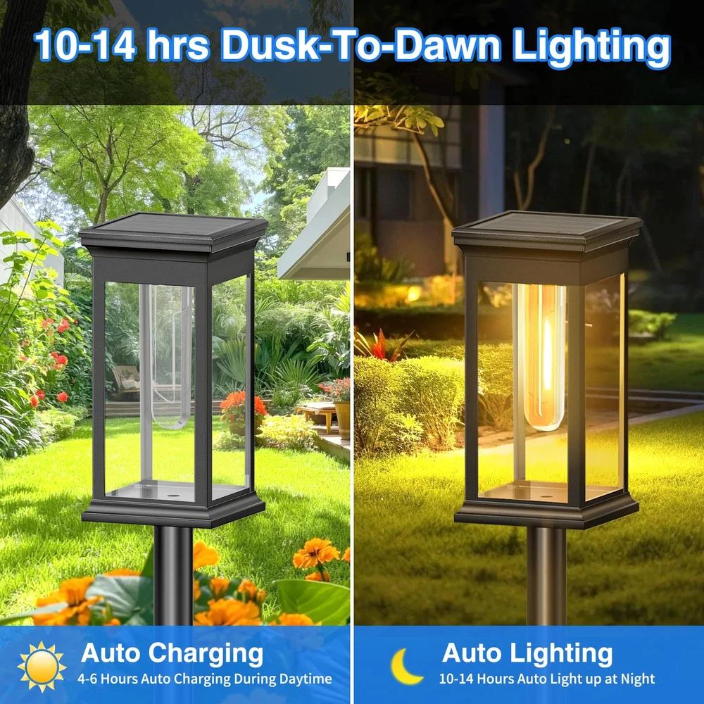 Upgraded Bright Solar Pathway Lights: The upgraded solar walkway outdoor lights with 360° radial illumination and powered by solar energy, emit an evenly brightness, energy-efficient to save your electricity bill. Warm white solar pathway lights features a stylish transparent streamlined design in matte black finish to help illuminate walkways, driveways, garden, landscape and adding a sophisticated look to your outdoor space. High Lumen & Long Last Solar Path Light: Adopting upgraded high-powered filament LED, the solar lights outdoor pathway warm white provide higher brightness with warm light color (3500K) and longer working time. Built-in rechargeable batteries 1000mAh Ni-MH, the solar lights outdoor waterproof can give off luminous duration over 10-12 hours after 4-6 hours fully charged by sunlight during the day, Exceeded your expectation which is high brightness and long illumination than normal pathway lights. IP65 Waterproof & Durable Material: The solar lights for outside are made of thick and durable PC material on transparent shade, part of the rest is in tough and UV fade protected ABS plastic to ensure durability to prevent breakage. Sealed construction of the solar garden light weather-resistant and IP65 waterproof, can provide reliable protection and withstand the changing seasons like rain, snow or harsh heat, ensure long illumination time and decoration for your garden. Auto-On/Off Switch Sensing Saves More Energy: Solar powered outside lights for yard equipped with high efficient monicrystalline solar panel have higher energy absorption and then convert them into electricity better. Sense changes to detect brightness of the surrounding environment and automatically illuminate when the sun goes down and remain on until sunrise. Height Options & Easy Installation: Height of the solar driveway lights outdoor is adjustable for greatly meet the lighting and decoration needs by choosing pole or , and then simply connect the solar lid and ground spike to complete the installation. Insert the garden lights solar outdoor into the place where can get direct sunshine and please turn on the switch before charge or use. Wide Application Solar Garden Light : These solar powered led yard lights are definitely an pleasing functional gift choice for your family, friends, and neighbors to create a warm and romantic atmosphere on front yard, backyard or garden decor. Brightness is well enough for path, walkway, driveway, etc., Surely making your outdoor space look like having a professional landscaping for both a safety and a decorative touch.