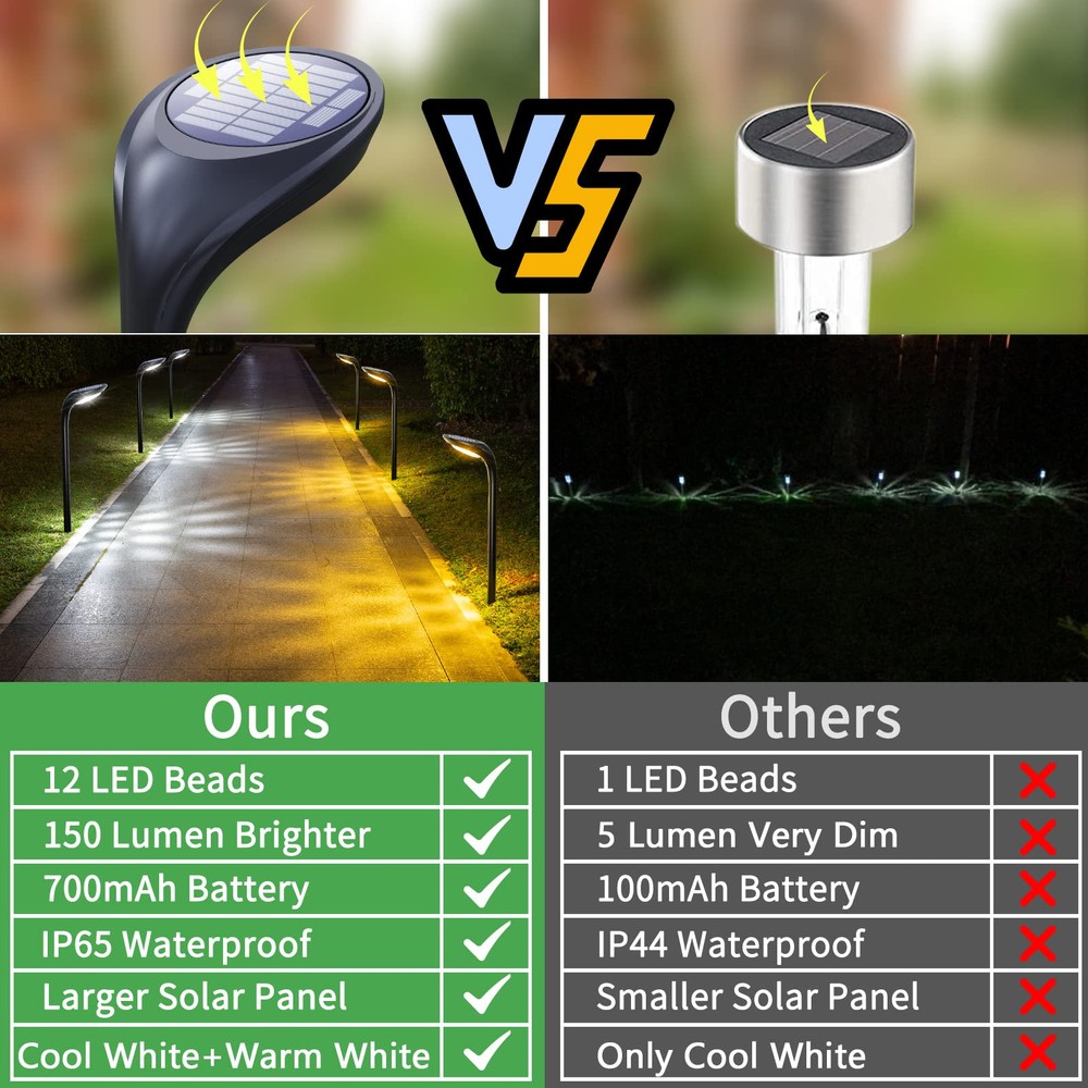 1. These solar pathway lights are fantastic! The dual lighting modes (cool and warm white) let me set the perfect mood for my garden, and the adjustable height poles make installation super flexible. They charge quickly and stay bright all night, automatically turning on at dusk. The waterproof design holds up well in rain, and the sturdy build feels durable. Perfect for lining walkways or adding ambiance to the backyard—great value for the price!