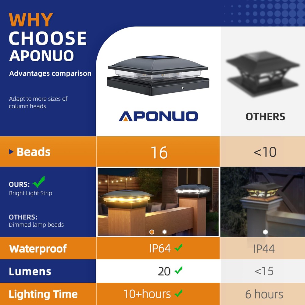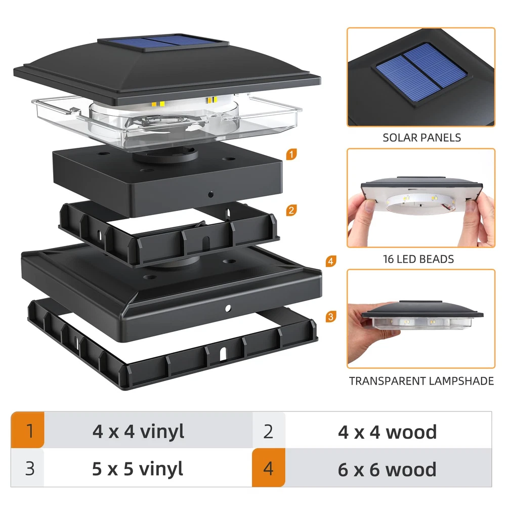 [Applicable Size ]- solar post cap lights measures 5.71x5.71x2.64 inches, comes with screw fittings and different sizes of bases. You can mount the 4x4 post solar lights on 4x4,6x6(actual 3.5x3.5,5.5x5.5) inchs wooden post caps,or you can mount solar fence post lights on 4x4,5x5 (actual 4x4,5x5) inches vinyl post cap. [Warm White/Cool White]- solar deck post lights has two color modes, white light and yellow light. fence post solar lights with 16 led beads is capable of emitting 20 lumens of bright light at the start of dusk, making it perfect for outdoor lighting and garden decor,deck decor,fence decor,patio decor. [Solar Post Lights Outdoor Waterproof 4x4] - solar post cap lights outdoor 4x4 are made of high quality pp plastic, which can resist pressure and water, with a waterproof rating of ip64, sealed well and will not rust, ensuring that the deck post lights can be used for a long time in outdoor waterproof. [Outdoor charging and lighting]-4x4 solar post cap lights can last all night lighting in full charge state. It is recommended that you install the deck post lights solar powered 4x4 in a well-lit location so that vinyl fence solar lights can stay charged efficiently. [Garden/Patiao/Yard/Fence/Deck Decor]-6x6 post cap solar light can be installed on the fence post caps or deck post caps around the front yard, backyard, driveway, sidewalk, walkway, deck or porch.4x4 solar post lights illuminate your garden 360 degrees, decorate your fence, deck, patio, porch or yard.