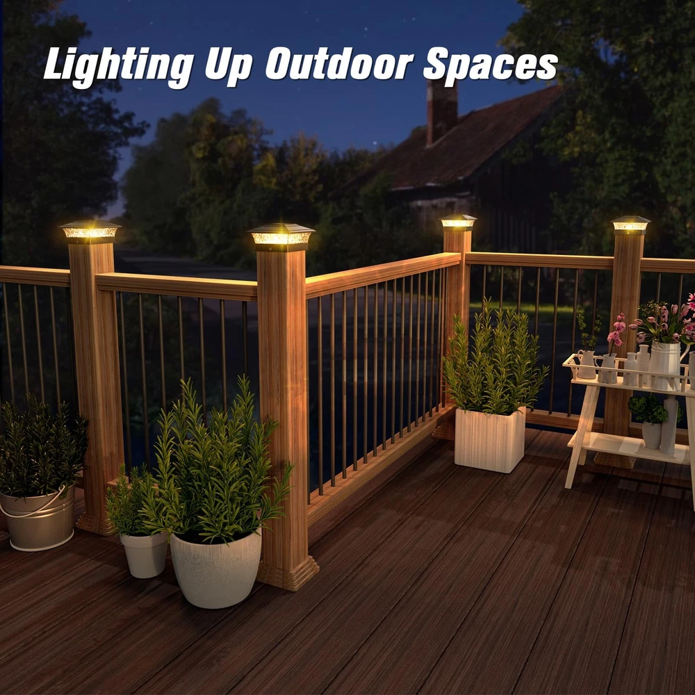 [Unique Post Light]The post cap light solar powered with 16 ultra bright led beads emits enough light through the diamond patterned shade, creating a highly distinctive pattern. So that the solar fence post lights will add a touch of elegance to your outdoor space while illuminating your garden fence, deck fence, and stair railings. [Weater Resistant] Solar outdoor lights for fence and deck is made of IP44 waterproof material, which can endure high temperature, heavy rain, wind and snow. Whenever night falls, the waterproof solar powered fence post lights will automatically light up rain or shine. [Easy Installation] These solar deck post cap lights are suitable for 4x4 wooden posts and 4x4 vinyl posts. To install these 4x4 Waterproof Black Fence Post Cap Lights, you just need to screw into the wooden/vinyl post and remove the tab on the light cover. [Save Energy] Black fence post solar lights charge in the sun for 4-6 hours during the day and automatically light up at night for 10+h continuous lighting.Solar-powered outdoor deck post lights without wire save labor and power costs while being environmentally friendly. [Two Color Mode&Wide Usage]Outdoor waterproof LED lights are available in two color temperatures: warm white and cool white. The switch for selecting the color temperature is on the lampshade: W for warm and Y for white. This means you can choose different light mode to illuminate your garden, paths, decks, driveways, fences, patios, mailboxes, yards, porches, courtyards, and anywhere you want to install them. [] No matter what problems you encounter during installation and use, please us and we will provide you with prompt and professional after-sales service.
