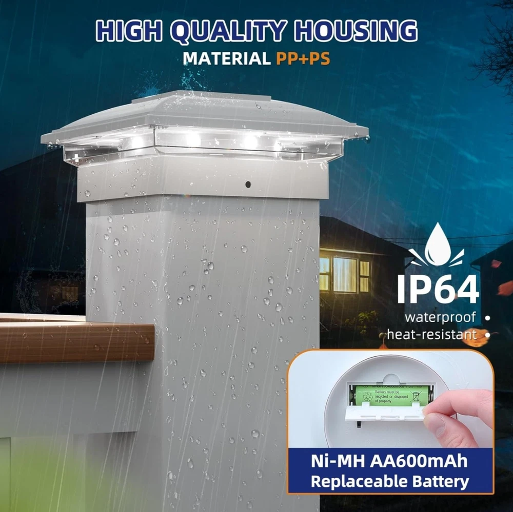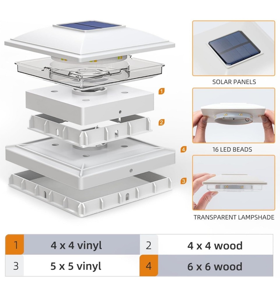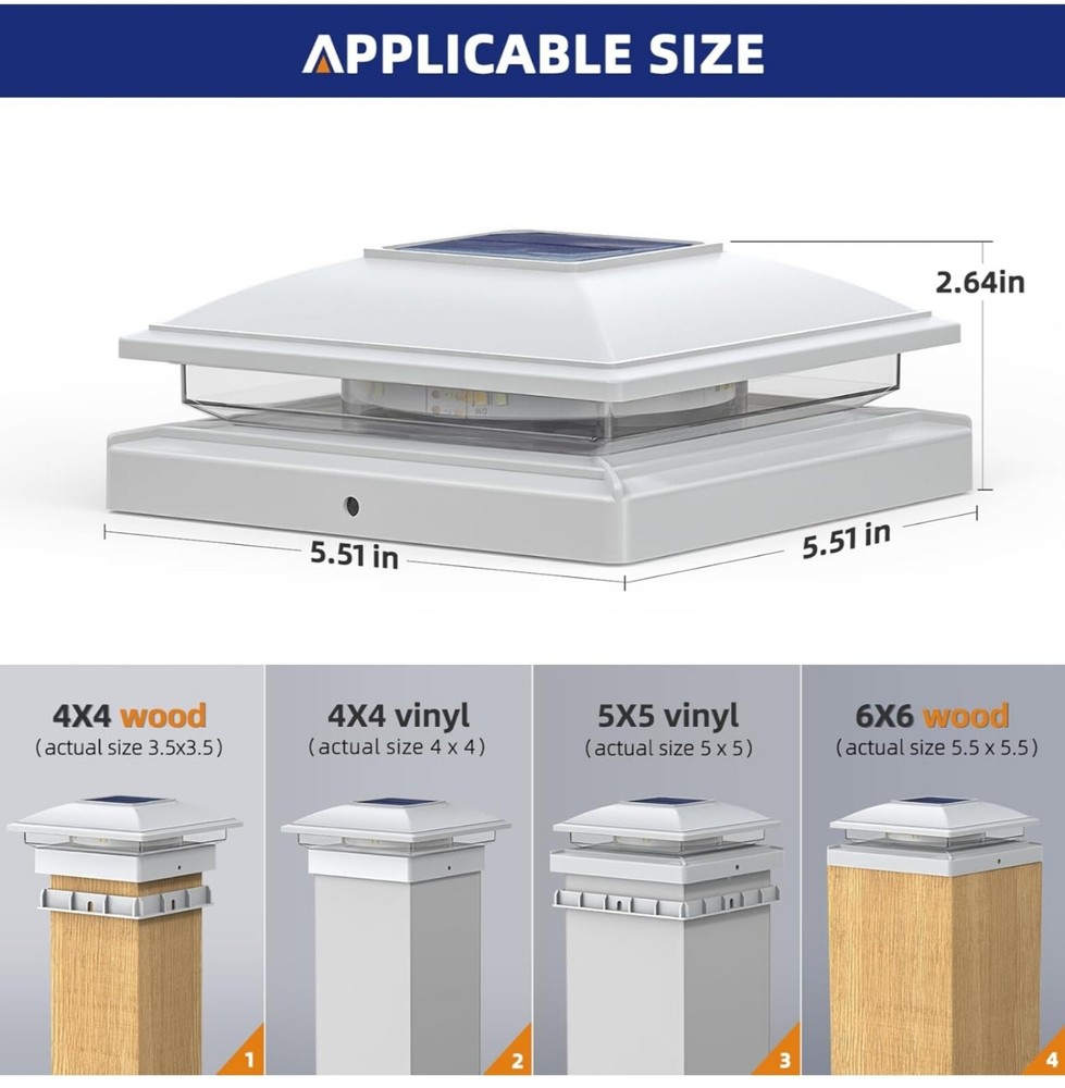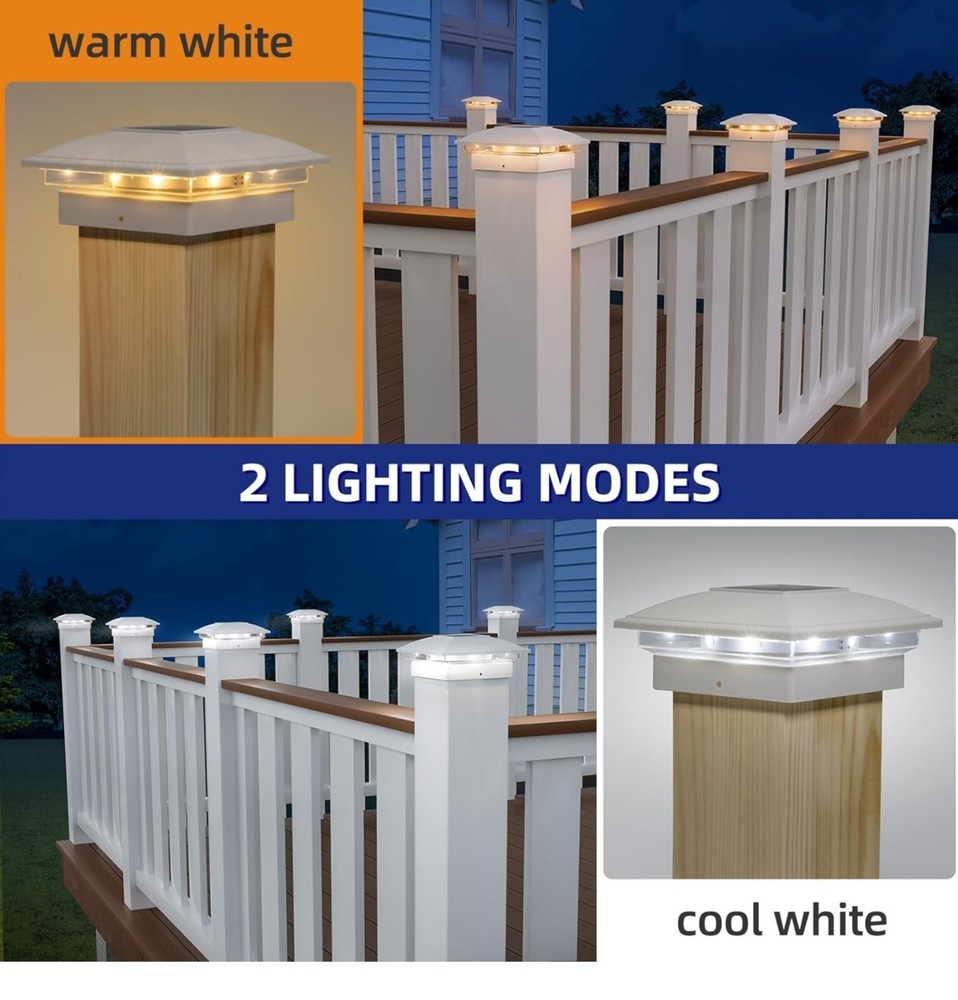 B085071625: APONUO Solar Post Cap Lights12 Pack Fence Post Solar Lights 2Modes Bright Outdoor Waterproof Garden Patio Fence Deck Post Lights Solar Powered for Fence Deck Caps 4x46x6 Wood4x45x5 Vinyl Applicable Sizes:APONUO solar post cap lights measure 5.71 x 5.71 x 2.64 inches and include screw fittings with multiple base options. Compatible with 4x4, 6x6 (actual 3.5x3.5, 5.5x5.5 inches) wooden posts and 4x4, 5x5 (actual 4x4, 5x5 inches) vinyl posts, ensuring a secure and versatile fit for various outdoor post Dual Lighting Modes – Warm White & Cool White:Featuring 16 LED beads, APONUO solar fence post lights offer two color modes—warm white and cool white—emitting 20 lumens of bright light at dusk. These 4x4 post solar lights create an inviting ambiance, perfect for garden décor, patio accents, deck lighting, and fence illumination Durable & Weatherproof for Outdoor Use:Crafted from high-quality PP plastic, APONUO solar post lights are IP64 waterproof, pressure-resistant, and rust-proof, ensuring reliable performance in rain, snow, and extreme weather. Designed for long-lasting outdoor use without maintenance worries Efficient Solar Charging – All-Night Illumination:APONUO 4x4 solar post cap lights provide all-night lighting on a full charge. For optimal performance, install these deck post lights solar powered in a sunny location to maximize solar absorption and battery efficiency Elegant Outdoor Décor & Wide Application:Ideal for garden, patio, yard, fence, deck, porch, driveway, walkway, and more, APONUO 6x6 post cap solar light offers 360° illumination, enhancing your outdoor space with stylish and functional lighting
