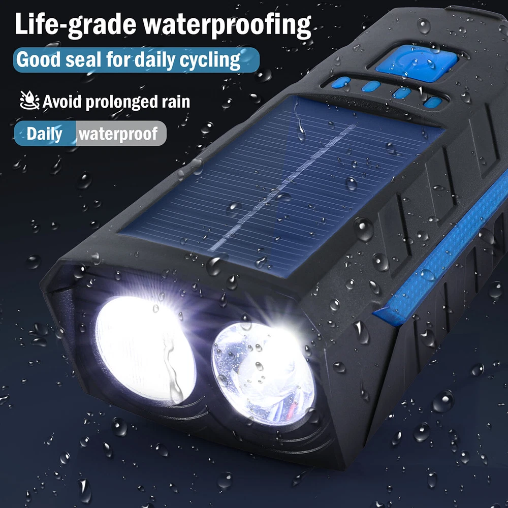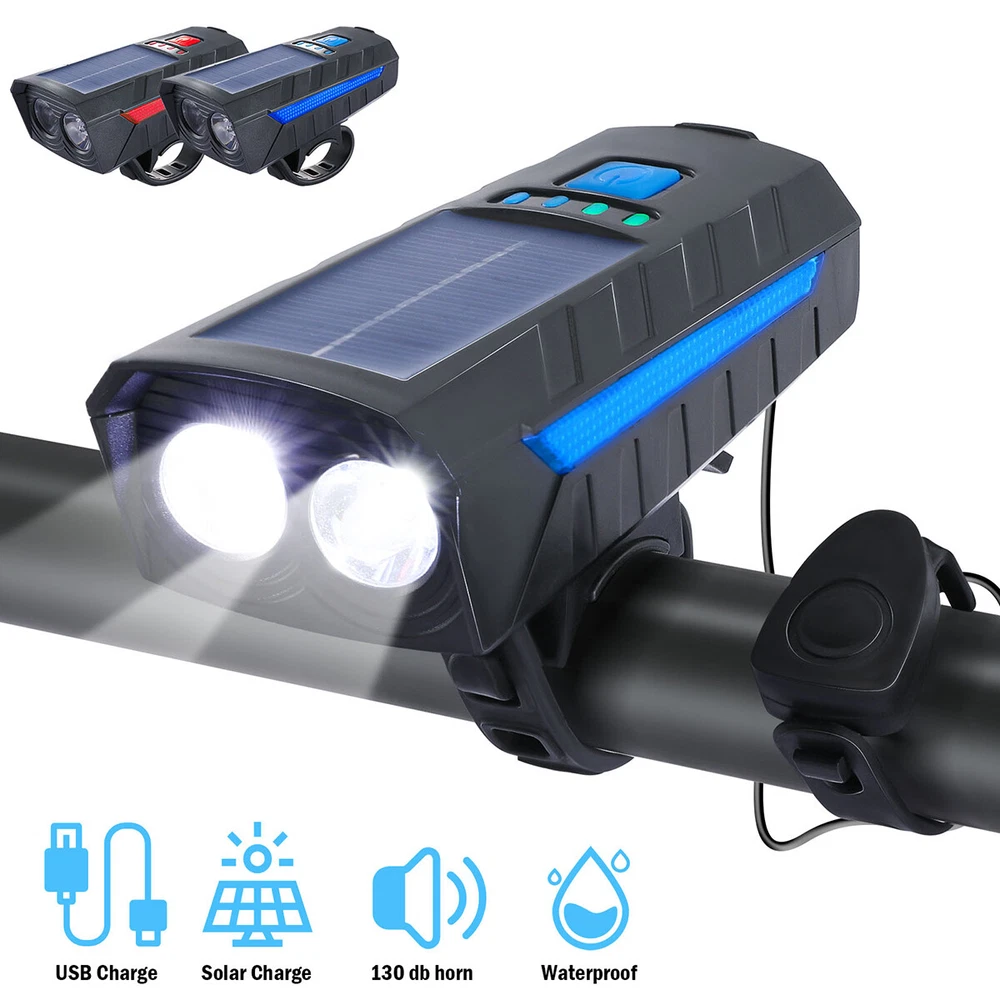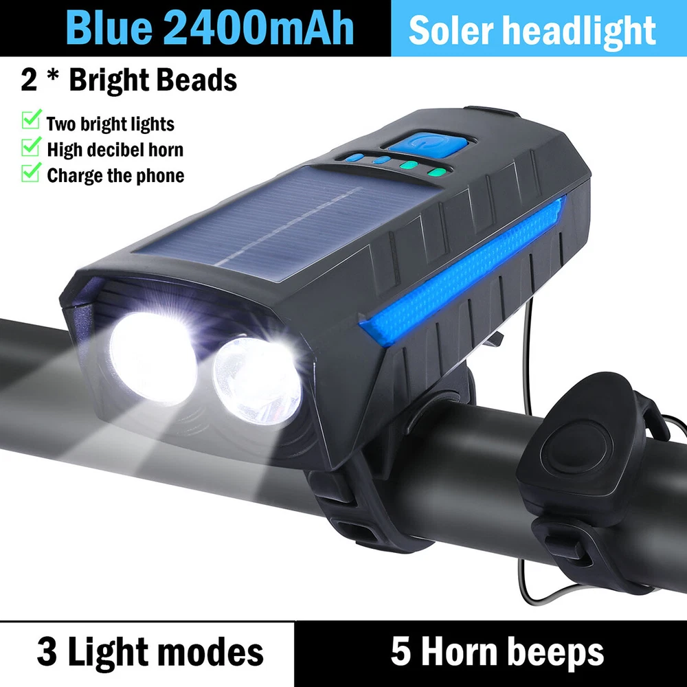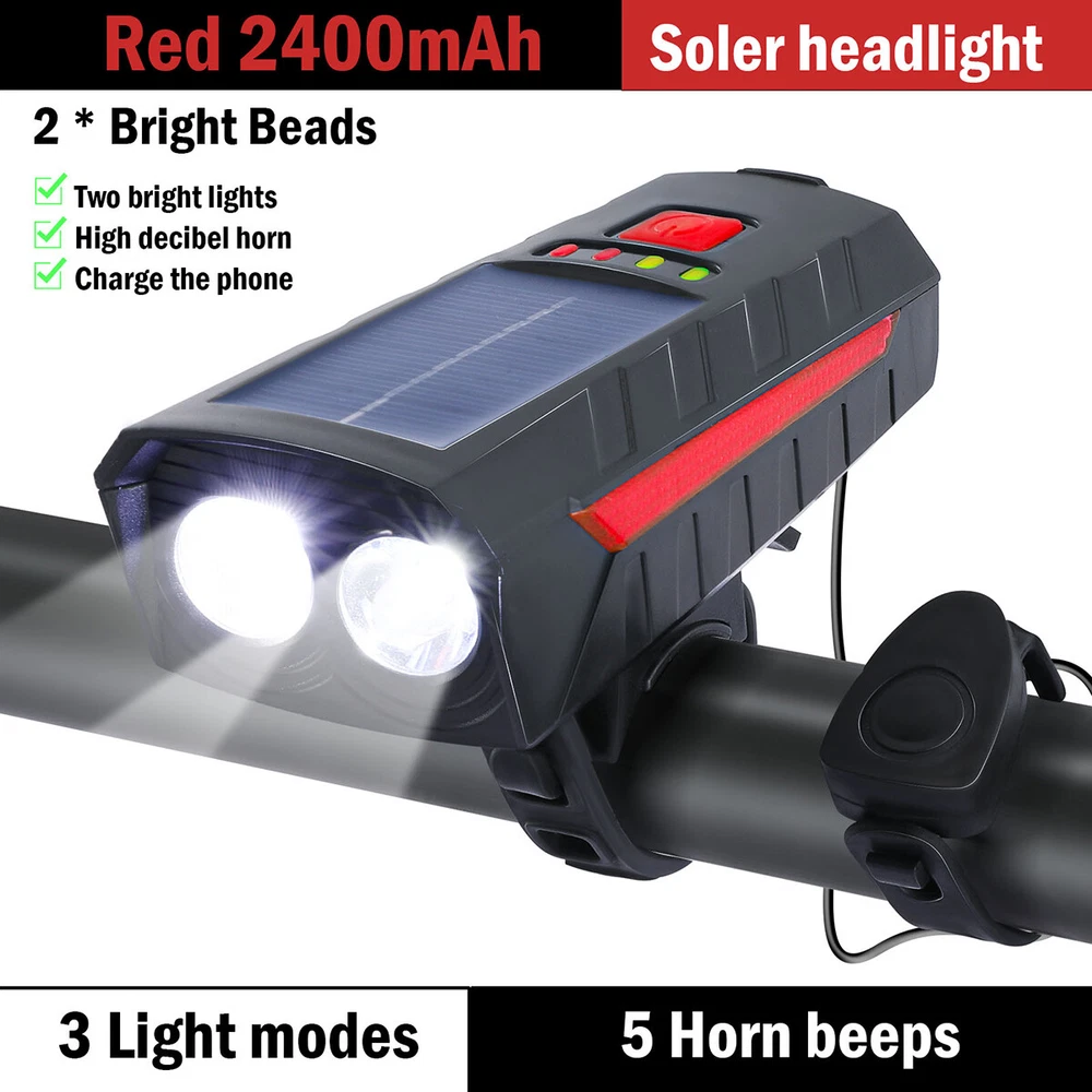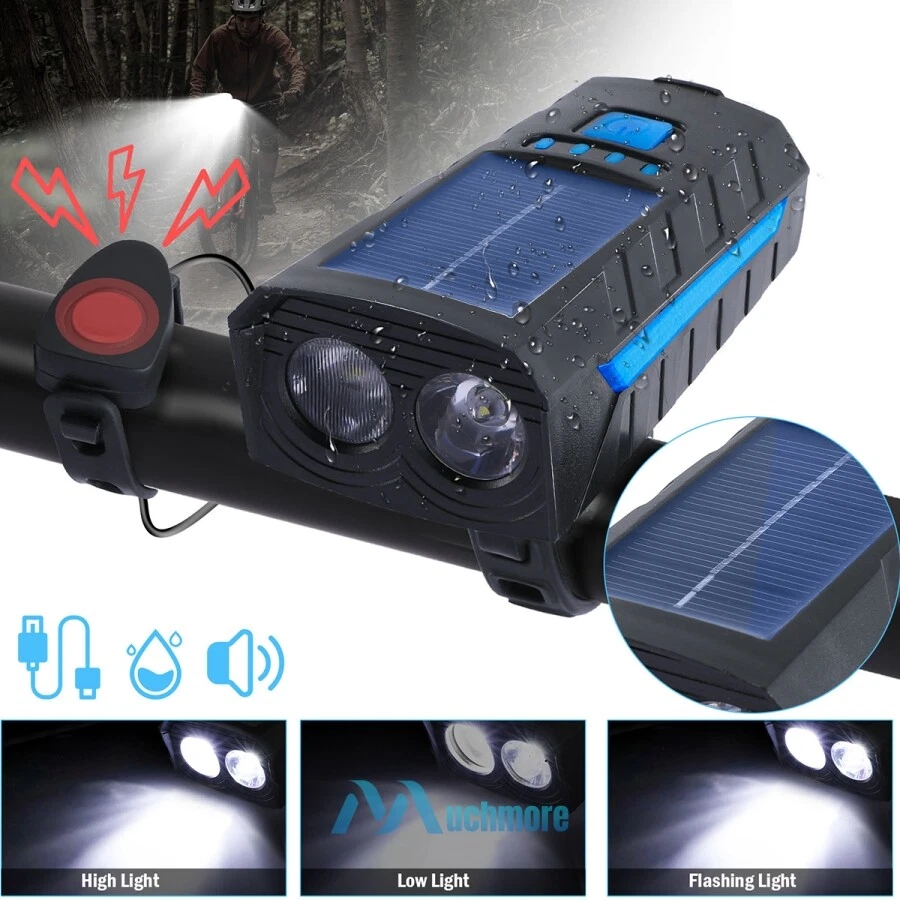 Solar Powered LED Bicycle Headlight Bike Head Light Lamp + Horn USB Rechargeable