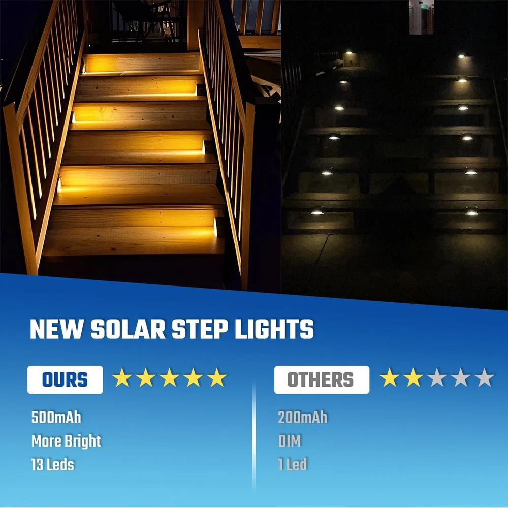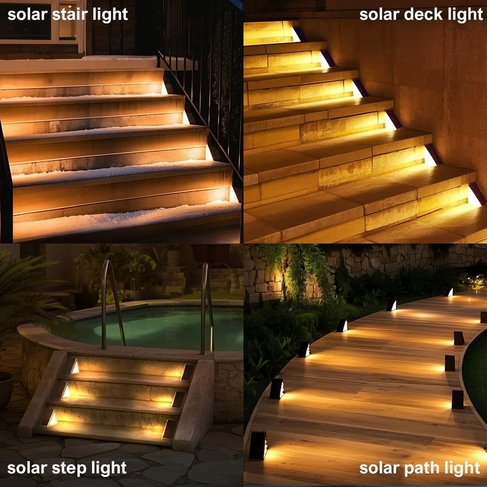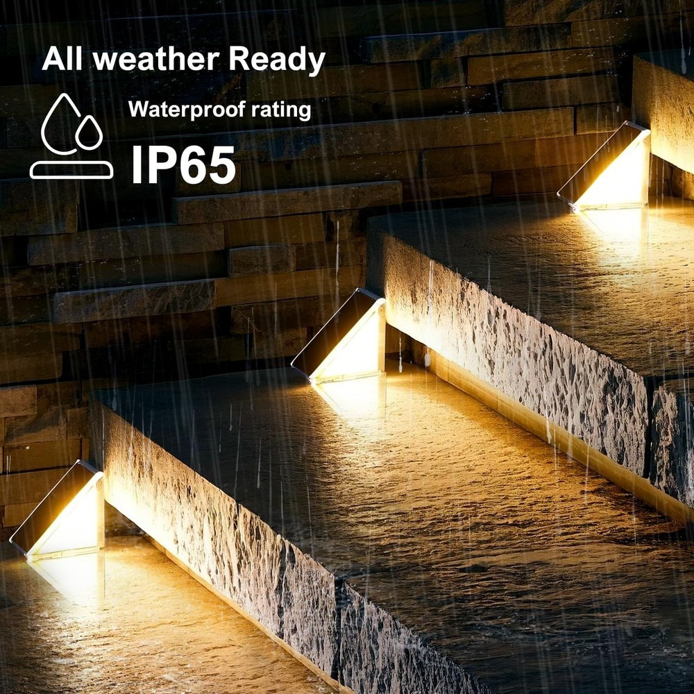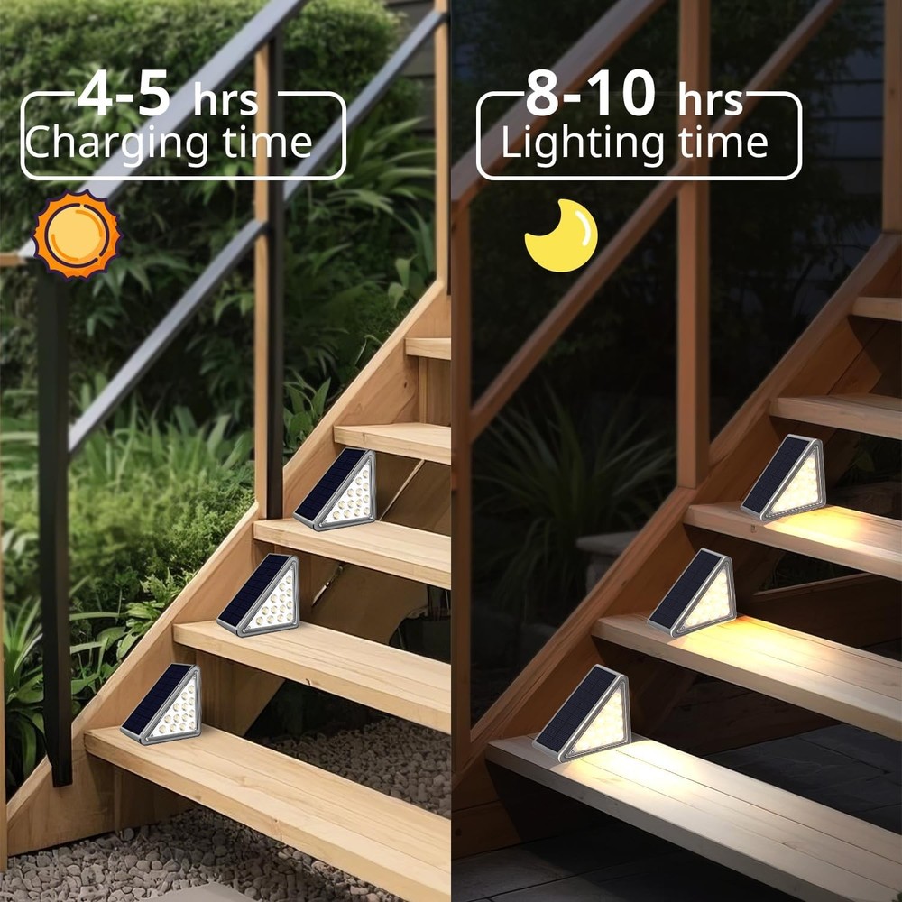 Solar Step Lights Outdoor Stair Lights, Deck 4.34*3.25*2.19in, Gray Product Details Brand: JEJOT Color: Gray Material: Acrylonitrile Butadiene Styrene Style: Modern Light fixture form: Step Light Room Type: Porch Product Dimensions: 2.19"L x 3.25"W x 3.25"H Specific Uses For Product: Garden, Yard, Pathway, Deck, Walkway Indoor/Outdoor Usage: Outdoor Power Source: Solar Powered Special Feature: Energy Efficient, Adjustable Color Temperature, Dimmable, Waterproof, Color Changing Light Source Type: LED Shade Material: Plastic Theme: Love Light Color: White, Warm Included Components: Mounting Hardware Lighting Method: Adjustable Specification Met: CE, RoHS Number of Items: 8 Bulb Base: E26 Switch Type: Dimmer Water Resistance Level: Waterproof Assembly Required: No Manufacturer: JEJOT Size: 4.34*3.25*2.19in Model Name: JEJOT-8p Part Number: J-117 Item Weight: 2.51 pounds Country of Origin: China Item model number: j117 Special Features: Energy Efficient, Adjustable Color Temperature, Dimmable, Waterproof, Color Changing Batteries Included?: No Batteries Required?: Yes Color Temperature: 3000 Kelvin Product Dimensions : 2.19 x 3.25 x 3.25 inches; 2.51 Pounds Item model number : j117 Manufacturer : JEJOT Country of Origin : China Brand: JEJOT Color: Gray Material: Acrylonitrile Butadiene Styrene Style: Modern Light fixture form: Step Light Advanced and Practical:JEJOT Solar step lights for outside can create a bright beam of light on each step,Combining charming appearance and lighting, you can enjoy the pleasant feeling brought by solar staircase lights,Make your garden, courtyard, and stairs more beautiful Two modes and Monocrystalline silicon solar panel:Outdoor stair lights have two modes to choose from: warm (3000k)/white (6500k) to adapt to different seasonal scenes,Monocrystalline silicon solar panels can absorb and release long-term light in a small amount of time, allowing outdoor staircase lights to achieve high conversion Waterproof and Durable ABS material:The outdoor solar steps lamp adopts IP65 waterproof technology, which can resist various outdoor weather conditions and meet daily needs. The lamp body is made of ABS material, greatly improving the service life of the solar staircase lamp Two Installation methods:solar lights for steps are perfectly decored on garden stairs, patio, yard, deck, porch step and sidewalk,etc. The triangle solar outdoor lights go in the corners so they are not in the way. No worry about stepping and tripping. 2 installation ways: 1)Directly attached to the stairs by 3-M sticky tape. 2)Fix the outdoor accessories on the stair by screws and bolts. (Tips: Solar stair lights need to be installed in a sunny spot.)