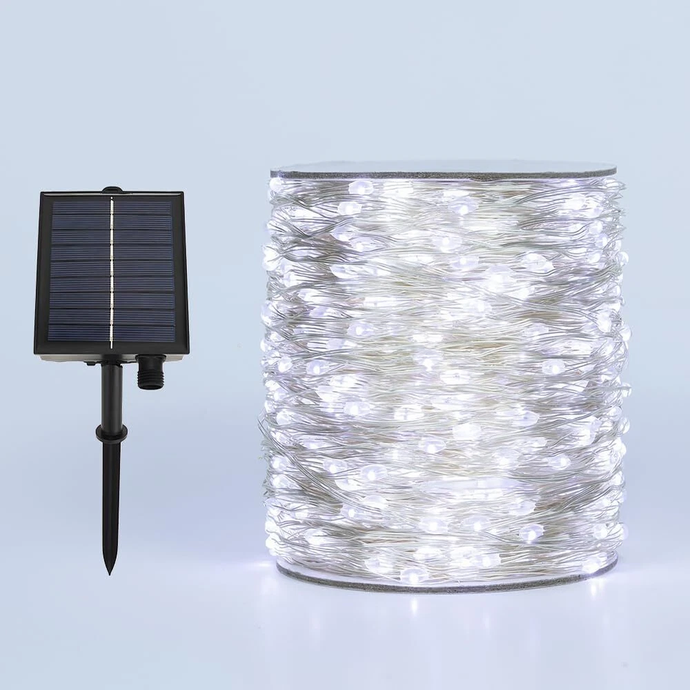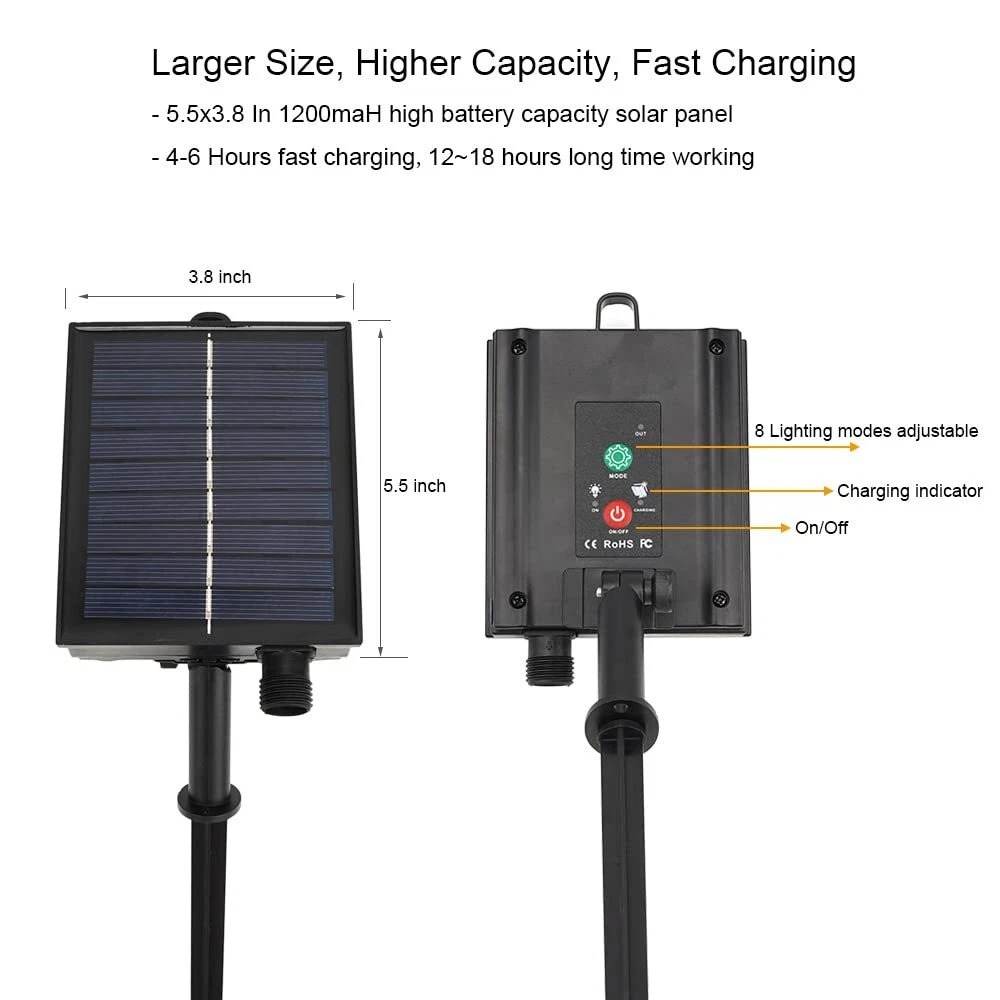Eco-friendly & Energy-saving: The solar string lights are powered with a built-in rechargeable 1200 mAh battery,which has large capacity for whole night lighting require.the string light will automatic illuminate at dark and off at dawn,work up to 12 to 18 hours after full charge.Adopting high-efficiency solar panels,it automatically absorbs sunlight and converts it into electricity during the day, no external power supply is needed, energy saving and emission reduction Continuous Shining Day and Night: Advanced battery technology ensures sufficient power, even on cloudy days can continue to shine, up to 8 hours of lighting time at night, allowing you to enjoy a warm night 8 Lighting Modes: The string lights outdoor waterproof create different aesthetic atmosphere with various light modes: Combination, in waves, sequential, slow glow, chasing/flash, slow fade, twinkle/flash, and steady-on Waterproof & Durable: IP44 waterproof design, no fear of rain, suitable for outdoor gardens, terraces, balconies and other environments, all year round, anytime and anywhere for you to light up.And the string lights also have good weather resistance and are able to work stably in a variety of climatic conditions, including high and low temperatures, humidity and sandy environments. This makes LED string lights perfect for outdoor decoration and lighting Bendable Copper Wires(Silver Color Wires): The solar fairy string lights inclued 3-copper wires.Extra long bendable copper wire could be shaped into any symbols.No need for complicated wiring, just fix the solar panel in the direct sunlight, hang the light strings at will, and start your eco-lighting journey instantly.With light weight and small size, it is portable and convenient for camping and traveling