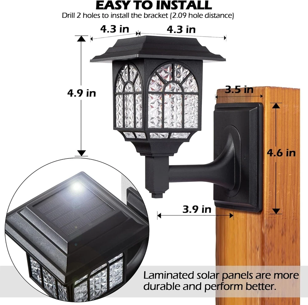 Solar Wall Lantern Lights Outdoor Waterproof Black Sun Powered Wall Light 2 Pack Description: Solar-Powered: Newly developed solar fence lights use laminated durable polysilicon solar panels and warm white LED lights. Illuminate 10-12 hours at night after 6-8 hours full charged under the sunlight. (Bad weather may affect lighting time.) Ingenious Design Lampshade: Solar wall lantern light has a special design lampshade. It can project a warming and sparkling lights at night. A perfect wall light to decorate your outdoor. Suitable for Outdoor: Deck fence lights are made of corrosion resistance ABS material. Waterproof system can withstand rain, snow or hot weather. Wireless, no maintenance cost, long term usage and safe. Great solar lights for your garden, yard, lawn, patio and walkway. Easy to Install: Just remove the plastic strip to turn ON the switch under the cap, the solar panel will sense changes in the brightness, These solar post lights automatically turn on at night and turn off at dawn. Use the ABS hooks we provide. (Solar panel must receive direct sunlight.) Product Size: 6.5 x 4.3 x 7.7 inch(Include ABS hooks). Features: Size: 2 Pack Color Warm White Material Plastic Style Modern Light fixture form Wall SHIPPING We are always working hard to ensure your package arrives as soon as possible. Please understand that some factors like weather, high postal traffic, and the performance of shipping companies are outside of our control. We offer free shipping to the lower 48 states and ship within 3 business days of payment, usually sooner. We do not accept P.O. Boxes. Please provide a physical address. For shipping outside of the continental USA, we only use eBay's Global Shipping Program. The item is shipped to KY and then sent to the rest of the world. International customers are responsible for all duties and taxes. Continue to check out in order to calculate costs for shipping the item to your country. Messages regarding eBay's Global Shipping Program MUST be directed at eBay EXCLUSIVELY. PAYMENT We accept payment by PayPal only (Can accept all kind of credit cards) Please pay as soon as possible after winning an auction, as that will allow us to post your item to you sooner. Payment must be received within 3 business days of auction closing. Before buying, please make sure your PayPal and eBay address is correct. If not, please correct it before payment. We have confidence in our products, but if you are not fully satisfied please contact us within 30 days of purchase and you will get full refund of your money. Return the product in the same condition you received it. Please note - return shipping will be paid by the buyer.