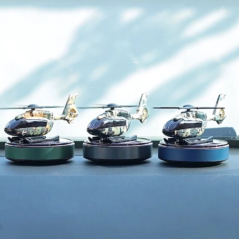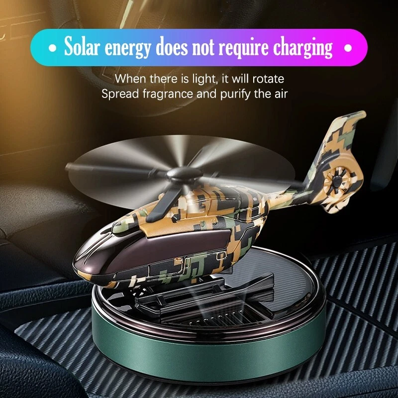 Solar car freshener, helicopter model, solid aromatherapy car air purifier [Compact size and high quality materials] : Camo Solar Aircraft in-vehicle Aroma: 11 x 7.5 x 6.5 cm /4.3 x 2.9 x 2.5 inches. The helicopter fuselage and metal rings are made of high-quality ABS+ aviation aluminum alloy. [Solar power supply] : Solar collector consists of solar panels, high efficiency. This camo solar Airplane in-car aromatherapy can spin itself anywhere in the sunny outdoors without the need for batteries and cables, so you can make it an excellent home ornament or unique car ornament [Safe ] : Essential oils are extracted directly from plants, 100% natural, evaporating without any pollution. Not harmful to children and pregnant women [Perfect Christmas gift] : The car aroma purifier is not only a car air freshener, but also an excellent decoration for the can or home, which is the perfect gift for family and friends 【 Available in three scents 】 : Camouflage blue [sea flavor] Top note: Bergamot, black tea shade, Gepong Middle note: broken lotus leaf, cardamom, clove after note: cypress wood, rock grass orchid, sandalwood Camouflage Green [Antique] Top note: Bitter orange flower oil, citrus Medium: Bergamot oil, neroli, rosemary Afternote: sweet orange oil, lavender Camouflage Black [Gardenia] Top note: Lavender, Gardenia, Gabon Medium note: Broken lotus leaves, cardamom, cloves After notes: Sweet orange, lemon, sandalwood
