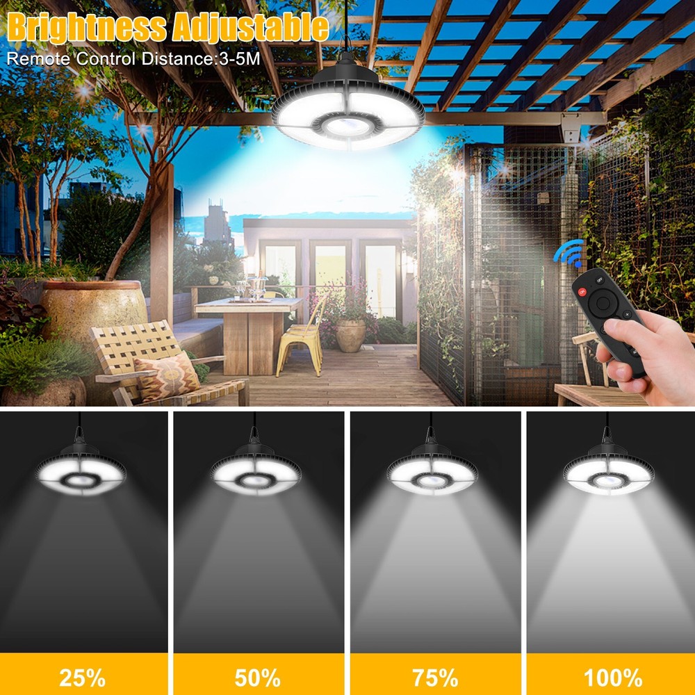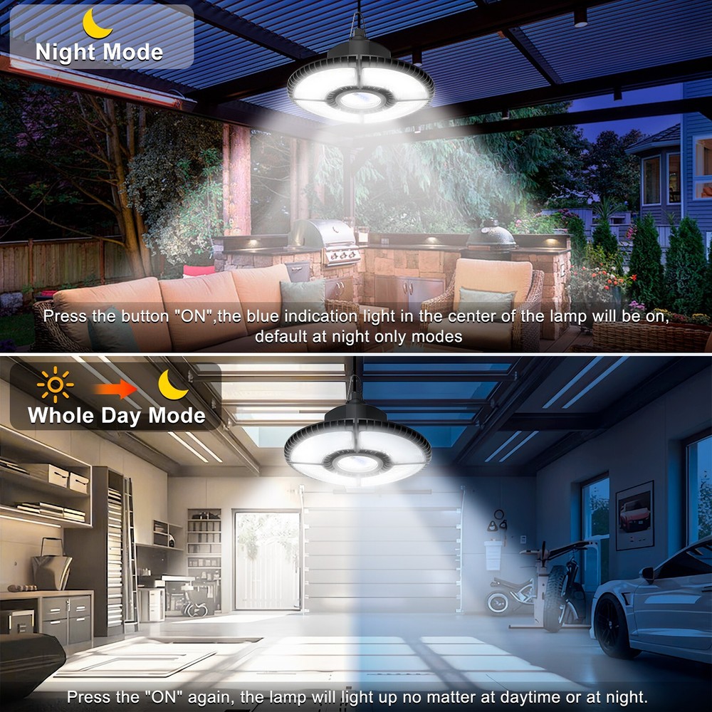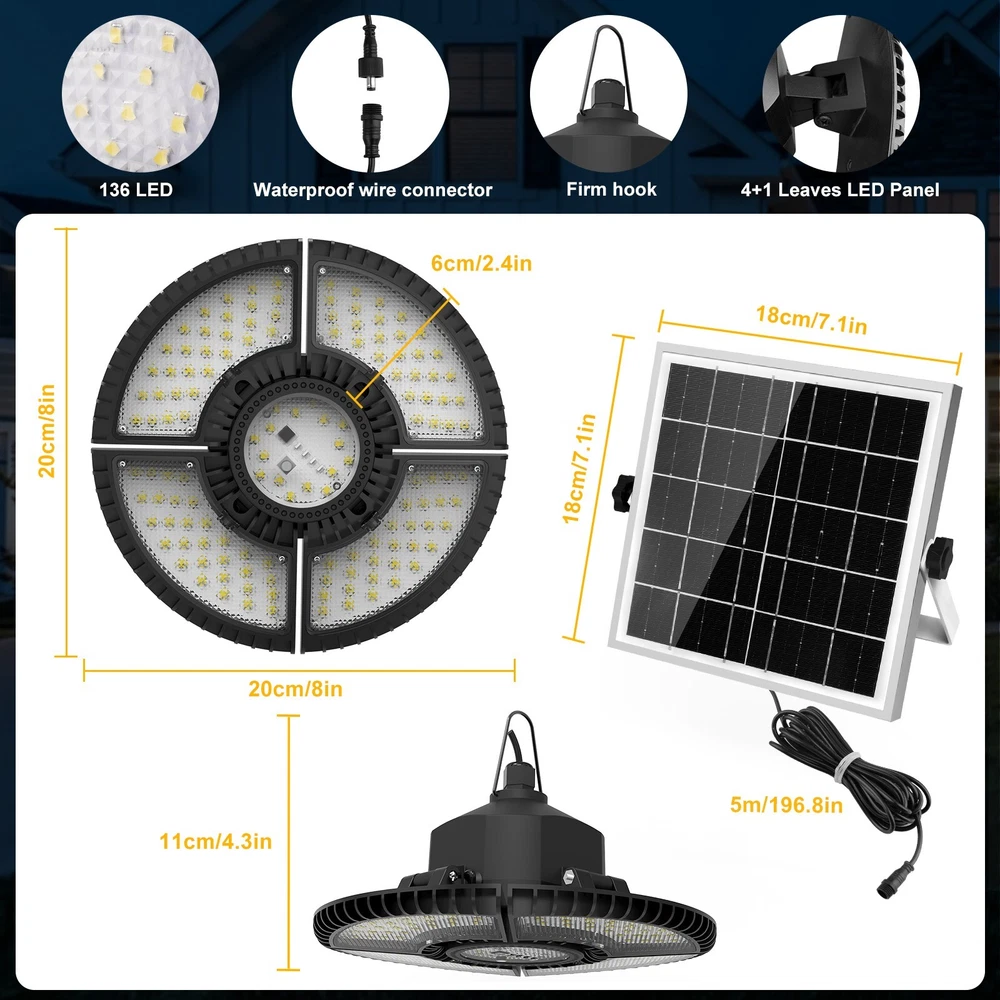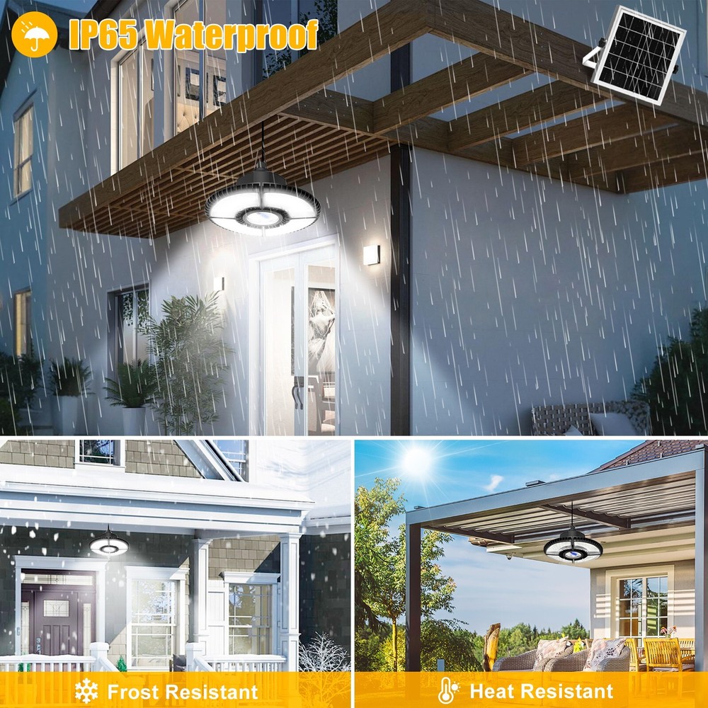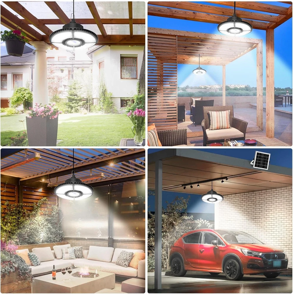Product Description Solar Pendant Lights Previous page Next page Decorative Living Room Decorative Garage Decorative Chicken Coop Camping Decorative Yard Automatically Turn ON/OFF Remote Control Functions Manual Switch----Button Usage 1. Press 1st Time: Turn On 2. Press 2rd Time: Half Bright 3. Press 3 Time: Full Bright 4. Press 4th Time: Turn Off Product Features Timer Function & Adjustable Brightness You can press the "25%, 50%, 75% and 100%%" switch to change the brightness. Timer function, set the timed lighting to 2 hours, 4 hours, and 6 hours IP65 Waterproof With an IP65 waterproof rating and ABS material, you don't have to worry about rain, heavy snow, sleet, or hail