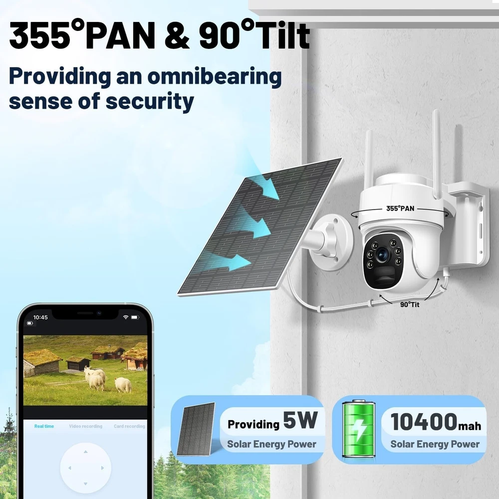4G LTE Cellular Security Camera, Solar-Powered No WiFi Needed Wireless Outdoor Security Camera with PIR Motion Sensor, 355° Live View, 2K HD Night Vision, Remote Access, 2-Way Audio, Built-in SIM Card No WiFi or Power Needed for Constant Monitoring: The 4G LTE cellular security camera, suitable for use in the US, Mexico, and Canada, is solar - powered with a built - in 10400 mAh battery, requiring no internet connection, making it ideal for remote locations like farms, graveyards, and construction sites to ensure constant surveillance Built-in SIM Card with Flexible Data Plans: Comes with 300MB of prepaid data for camera connectivity. The SIM data plan can be renewed in-application at $14.9 per month, $79.9 for 6 months, or $149.9 annually (only with the included SIM card). Enjoy unlimited data viewing without worrying about data limits, and it supports TF cards (up to 128 GB, not included) and optional cloud storage service for secure event uploads, accessible anytime via the iCam365 app. Remote Control and 2K Live Viewing: This outdoor cellular security camera offers 2K resolution, 355° pan, and 100° tilt, allowing you to control it remotely via the ICAM365 app for clear live video anytime, ensuring the safety of your property Smart Tracking, PIR Detection, and Two-Way Audio: High-sensitivity PIR motion sensors reduce false alarms, sending timely alerts when motion is detected and saving video locally. The built-in microphone and speaker allow for real-time two-way audio, making it easy to communicate with visitors or deter intruders All-Weather Protection for Any Conditions: Whether it's a sunny day or a stormy night, the IP66 waterproof certification ensures the camera operates reliably in any weather. Enjoy peace of mind knowing your property is secure, regardless of the conditions outside