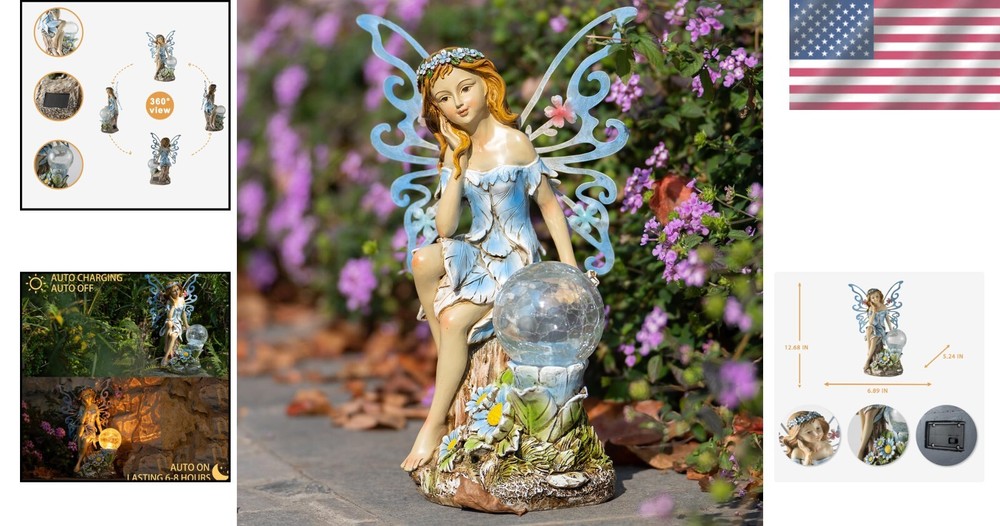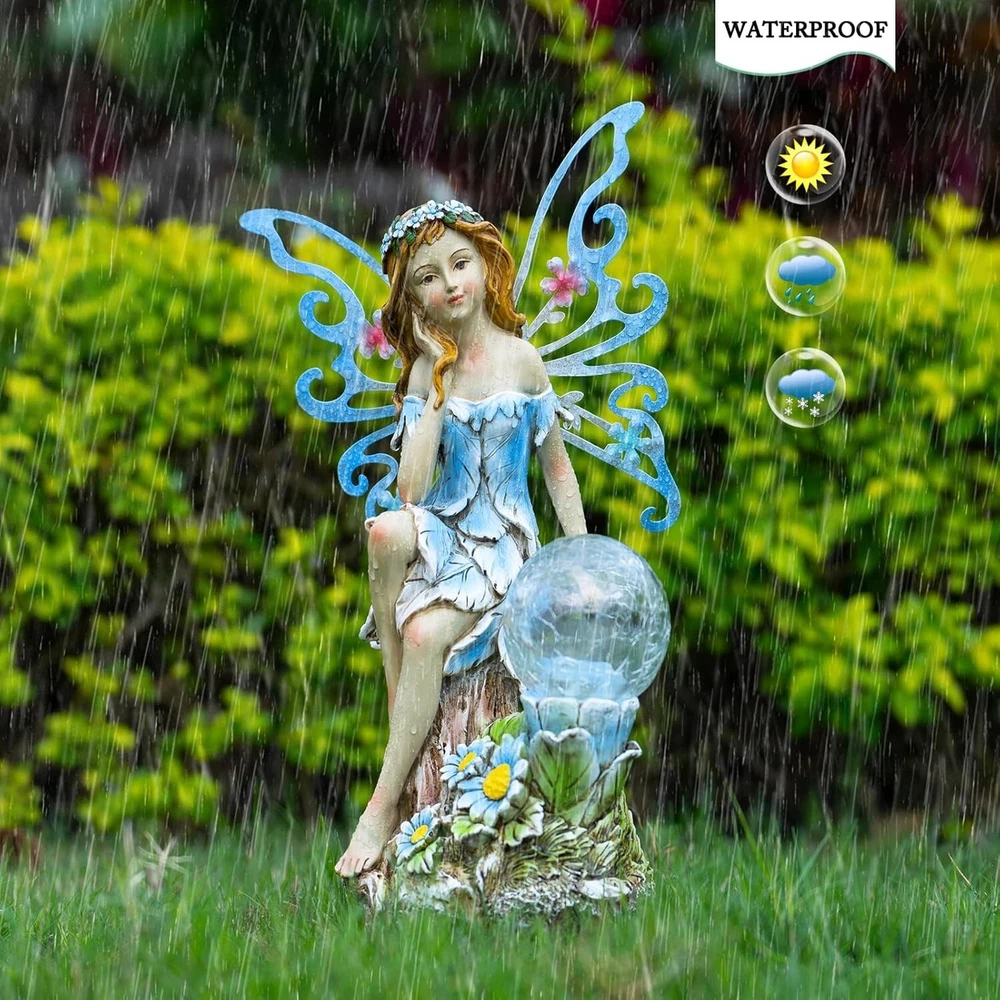 Care Instructions: Easy Care Features: Solar, Weatherproof, LED, Auto-on, Weather-Resistant Material: Resin Finish Types: Painted Specific Uses: Outdoor Assembled Length: 8.86 Inches Collection: Angel Subject: Fairy Customized: No Assembled Width: 4.92 Inches gtin13: Does not apply Type: Fairy Figurine Indoor/Outdoor: Outdoor Theme: Fairies Color: Blue Flower Fairy Occasion: Birthday Size: Medium Item Weight: 2.7 lb Brand: Unbranded Batteries Required?: Yes Finish: Painted UPC: Does not apply Assembled Height: 13.39 Inches Product Dimensions: 8.86 X 4.92 X 13.39 Inches Power Source: Solar Item Package Quantity: 1 Personalize: No Batteries Included?: Yes Area of Use: Lawn, Patio, Yard, Outdoor, Porch Style: Art Deco Shape: Novelty