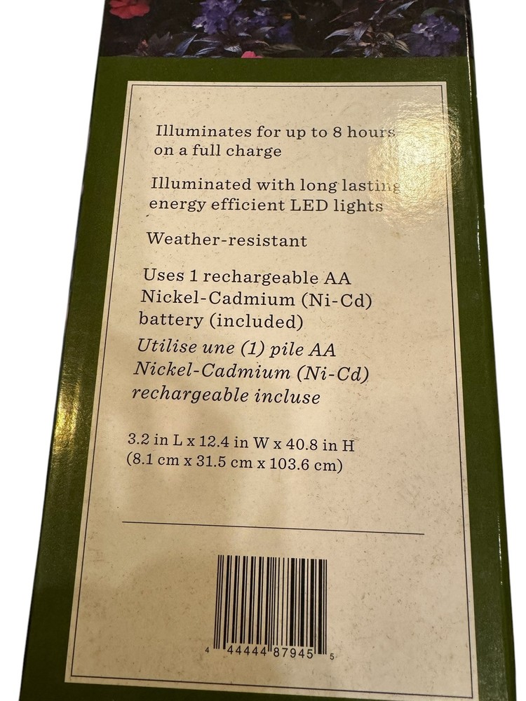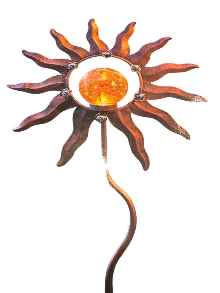 This is a solar-powered outdoor garden stake featuring a metal and glass design with a sun, moon, and star motif. It has a multicolor LED light that changes color and is waterproof. The stake is 40.8 inches tall with an art deco style, and it is suitable for outdoor installation. It has a switch control, a power consumption of 2.5 W, and uses a light sensor for activation.
