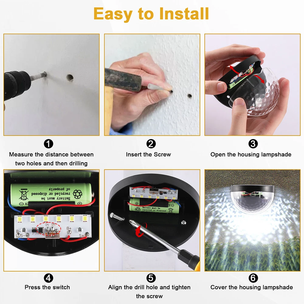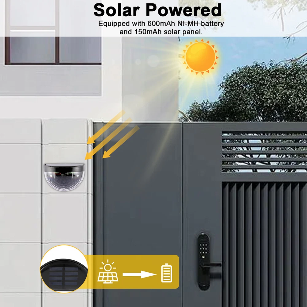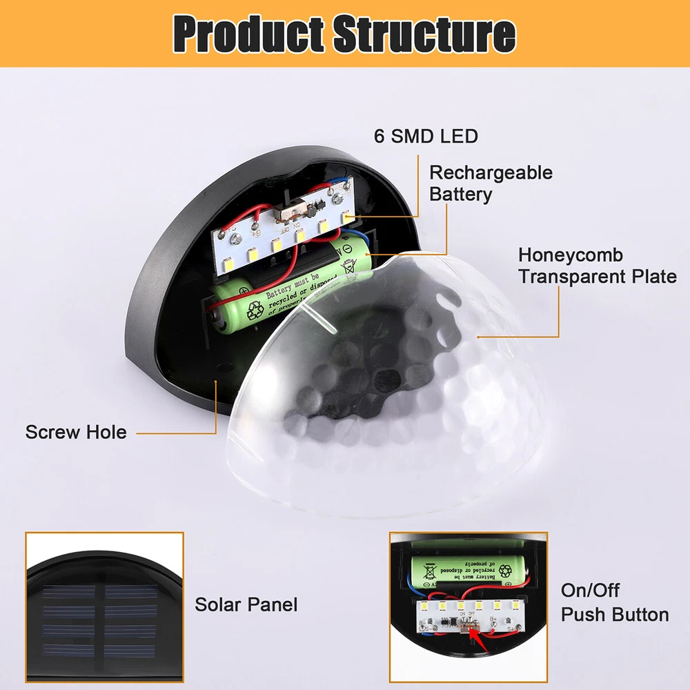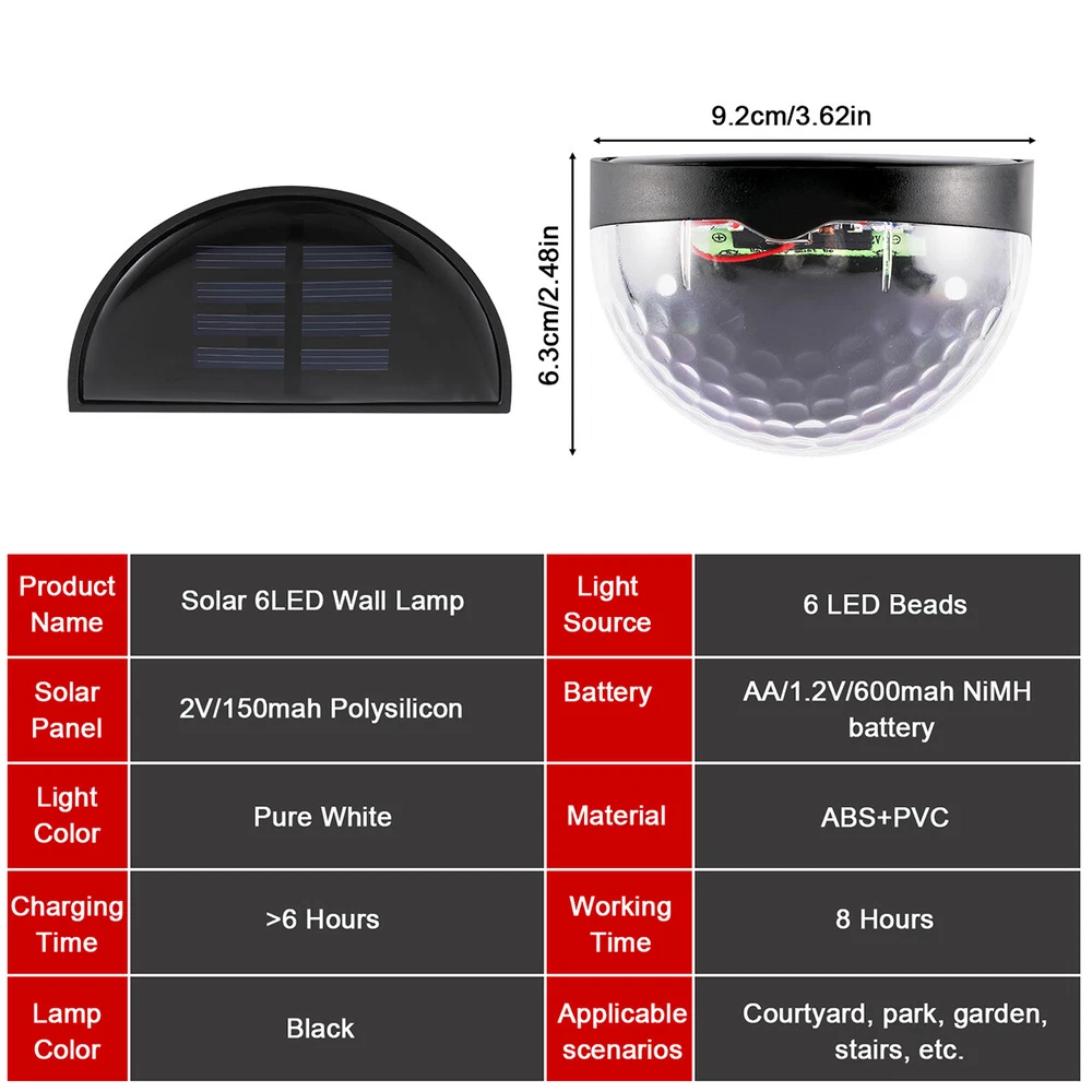 Outdoor Solar LED Deck Garden Stair Step Fence Lights Wall Pathway Fence Lights Specification: Material: ABS Size: 9.2x6.3cm/3.62x2.48in Shell color: black Light color: white/warm light Light source: polycrystalline silicon solar panel,2V 150mA Power dissipation: 6pcs 0.06W 2835 LED Battery: 1*1.2V 600mAh AA Ni-MH charging battery Function: light control Features: 1.Warm light without dazzling: The light of this deck light is enough for you to illuminate your fence, deck, step, patio and more, which is safe for the whole family to go downstairs at night. 2.Automatic work mode: Just set it up in an area where it will receive plenty of sunlight and turn it on. On sunny days only takes hours to fully charge. It turns on automatically at dusk, and off at dawn. 3.Good quality solar panel: Equipped with 2V 150mA polycrystalline silicon solar panel. No cost lighting, eco-friendly, powered by the sun. Just set it up in an area where it will receive plenty of sunlight. 4.Wide application: The solar fence light is perfect for illuminating stairs, paths, gardens, decks, patio, also use lighting front door, back yard, driveway, garage, outdoor wall and more. 5.Easy to install: The solar deck light can be installed in anywhere that can be fixed with screws. Comes with screws for your convenience. 6.Material: Made from good quality ABS material, anti aging and durable. 7.Good decoration: The light is ideal for decorating outdoor staircases. 8.Easy to use: No wiring needed, solar powered light, eco-friendly, energy saving, easy to install. Package Includes: 2/4/6/8/10 x solar fence light On Feb 21, 2025 at 00:28:01 PST, seller added the following information:
