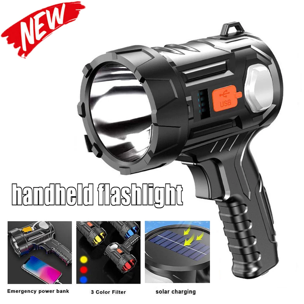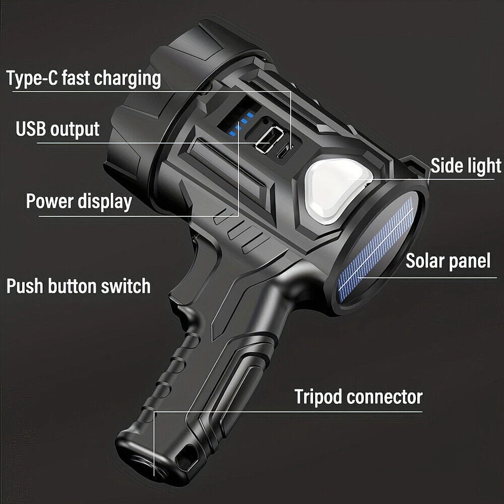 Solar/USB Rechargeable 30000000LM Bright LED Spotlight Flashlight Searchlight