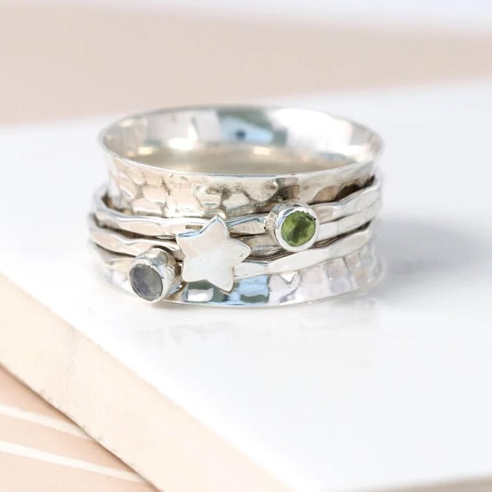 Product Overview: This beautiful 925 Sterling Silver Spinner Ring combines the elegance of Peridot and Rainbow Moonstone gemstones with the calming design of a spinner ring. Crafted from solid sterling silver, this unique ring is not only a stunning piece of jewelry but also offers stress relief and healing benefits through its interactive design and powerful gemstones. Key Features: Material : Solid 925 Sterling Silver – Known for its durability and timeless shine, perfect for everyday wear. Gemstones : Peridot : A vibrant green gemstone associated with emotional healing, abundance, and growth. Peridot is known to bring positivity and renewal. Rainbow Moonstone : A captivating gemstone with flashes of iridescent colors, believed to enhance intuition, balance emotions, and promote spiritual growth. Spinner Design : The outer band of the ring rotates freely around the inner band, offering a calming tactile experience. Great for stress relief and focus . Benefits of the Spinner Ring: Stress Relief : The spinning motion helps to relieve tension and anxiety. It’s perfect for fidgeting or when you need to calm your mind. Healing Properties : Both Peridot and Rainbow Moonstone are believed to support emotional healing, intuition, and spiritual growth. Stylish and Versatile : Suitable for casual wear or as a statement piece for special occasions. This ring can be worn as a personal reminder of peace, healing, and balance. Sizing and Fit: Available in various sizes. Please refer to the size chart to select your correct size. The ring has a comfortable fit, ideal for everyday wear. Perfect Gift for: Those seeking emotional balance and healing. Anyone who enjoys unique, meaningful jewelry. A special gift for birthdays, anniversaries, or as a thoughtful self-care item. Why Choose Our Spinner Ring? High-quality 925 sterling silver craftsmanship ensures durability and long-lasting beauty. The combination of Peridot and Rainbow Moonstone gemstones offers both spiritual and aesthetic benefits. Handcrafted with care to deliver a smooth, rotating mechanism for stress relief.