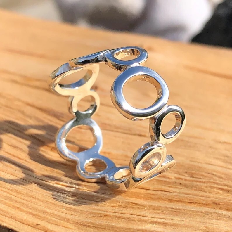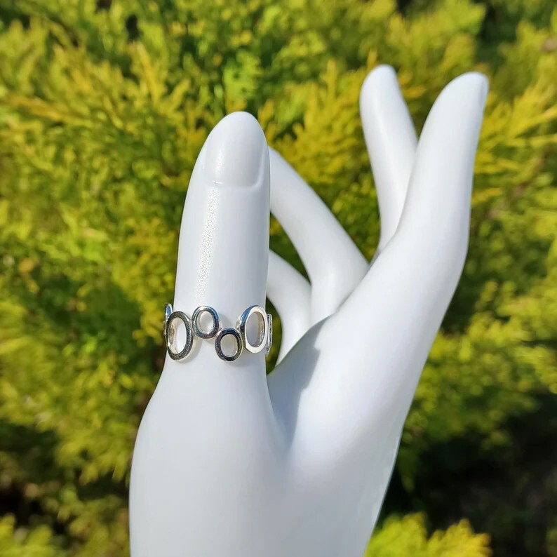 Add a touch of retro charm to your jewelry collection with this stunning Sterling Silver Groovy Circles Ring . Designed with playful, interlocking circles, this ring captures the essence of 1960s and 1970s fashion in a modern way. The smooth, polished sterling silver shines beautifully, making it the perfect statement piece for any occasion. Key Features: Material : High-quality sterling silver , ensuring durability and a bright, polished finish. Design : Unique groovy circle pattern , inspired by retro and vintage designs, offering a stylish, fun aesthetic. Adjustable Fit : This ring features an adjustable band , so you can wear it comfortably on any finger. Versatile Style : Perfect for casual or formal wear, this ring pairs well with any outfit, adding a pop of creativity and sophistication. Perfect Gift : An ideal gift for lovers of retro fashion, vintage-inspired jewelry, or anyone who enjoys unique, eye-catching pieces. Why You'll Love It : The Groovy Circles Ring is more than just jewelry – it’s a conversation starter. The organic, fluid design makes it a standout accessory, perfect for adding an element of fun and individuality to your style. Whether you're dressing up for a night out or looking to elevate your everyday look, this ring is sure to turn heads and spark compliments.