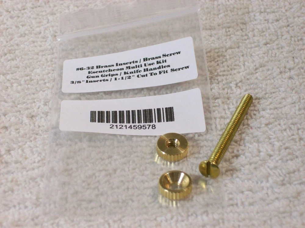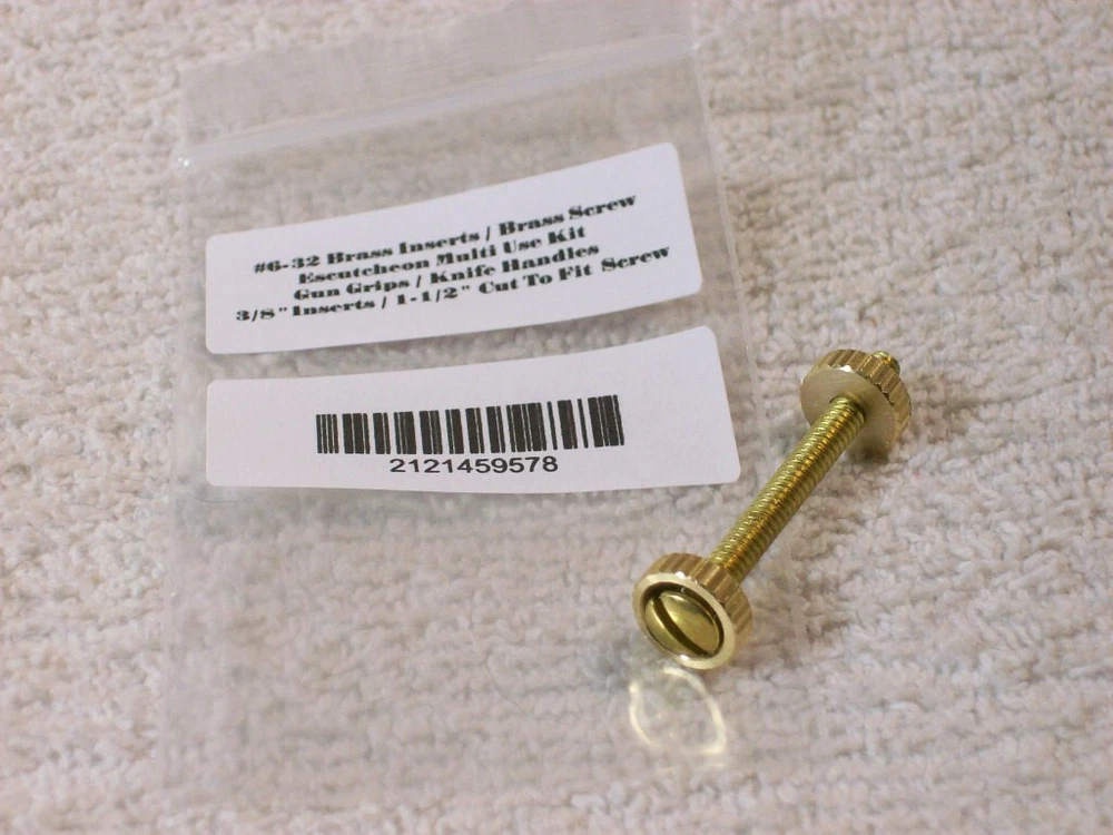 Solid Brass Universal Multi Use Escutcheons Pack of 1.... Can purchase additional packs ...no additional shipping charges for multiple purchases of these.....We have 2 packs listed.....See other listings We have sold 1000s of these over the years. Great for all kinds of wood working projects. ****SEE REFERENCE photos of a grip panel project that used these kits.....These items are not in the sale....**** Universal Escutcheons Kit / Knife Handles / Gun Grips / Brass Inserts With Cut To Fit Brass Screw 1 Pack READ**** Wood craft projects , gun grips , knife handles , other projects...... Multi use brass escutcheons kit.....**** 3/8" Brass Inserts X 1/8" thick... # 6-32 ****..... With Brass 1 - 1/2" cut to fit..... Brass Screw.... # 6-32 oval slotted head .......... No additional shipping charge for multi purchases of these. You only pay one shipping charge no matter how many lots are purchased per order.