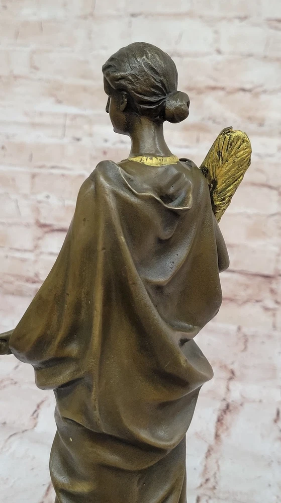 Condition : This sculpture is in perfect condition. Bronze Dimensions with Marble Base: Height 14" x Width 4.5" Marble Dimensions:4.5" X 4 Height without base:13" Weight:8 LBS Inventory: 71STE240BG4517 This symbolic bronze sculpture beautifully embodies the essence of peace and resilience. The woman stands with poise and strength, her arm firmly clutching a sword partially covered by a palm branch, a powerful representation of the delicate balance between war and peace. In her other hand, she holds a small lantern, illuminating the path forward with hope and wisdom. A smaller recast of the original "Peace" sculpture, this piece carries historical significance, as similar versions were produced during World War I. The intricate details bring depth to the sculpture, from the delicate folds of her garments to the fine textures of the sword and lantern, enhancing its artistic and symbolic value. Handcrafted from 100% bronze, this stunning work was cast using the traditional "Lost Wax Method," ensuring durability and precision. The rich brown patina accentuates its timeless appeal, and it is mounted on a black marble base for an elegant presentation. Signed by the artist J. Kassin, this sculpture is a compelling tribute to the enduring pursuit of peace. Athena Lady Wisdom Greek Goddess 100% Solid Bronze Sculpture Art Deco Statue Figurine STE-240BG Video will open in a new window Using the eBay App? Paste link into a browser window: [isdntekvideo]