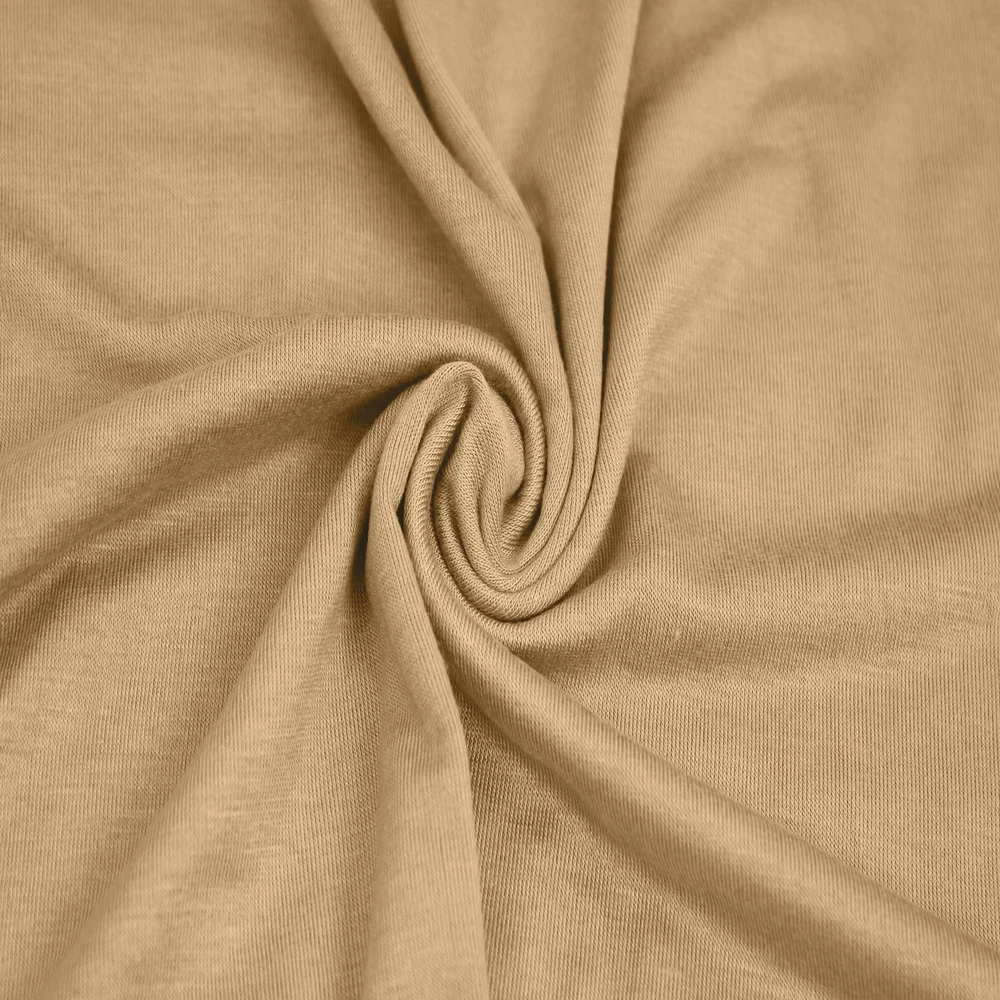 It is breathable and can actually be more moisture-absorbent. It has a very smooth, flowing fit and comfy feel. The Jersey Knit fabric is perfect for T-Shirts, Causal Wears, Stylish Jumpsuits, Dresses, Pajamas, head accessories and all kind of DIY Projects and so much MORE !!!! Width: 58-60" Content: 95% Rayon, 5% Spandex The Jersey Knit fabric is perfect for T-Shirts, Causal Wears, Stylish Jumpsuits, Dresses, Pajamas, head accessories and all kind of DIY Projects and so much MORE Apparel made from this fabric is soft and stretchy, yet durable Product color might slightly vary due to photographic lighting sources or your monitor settings