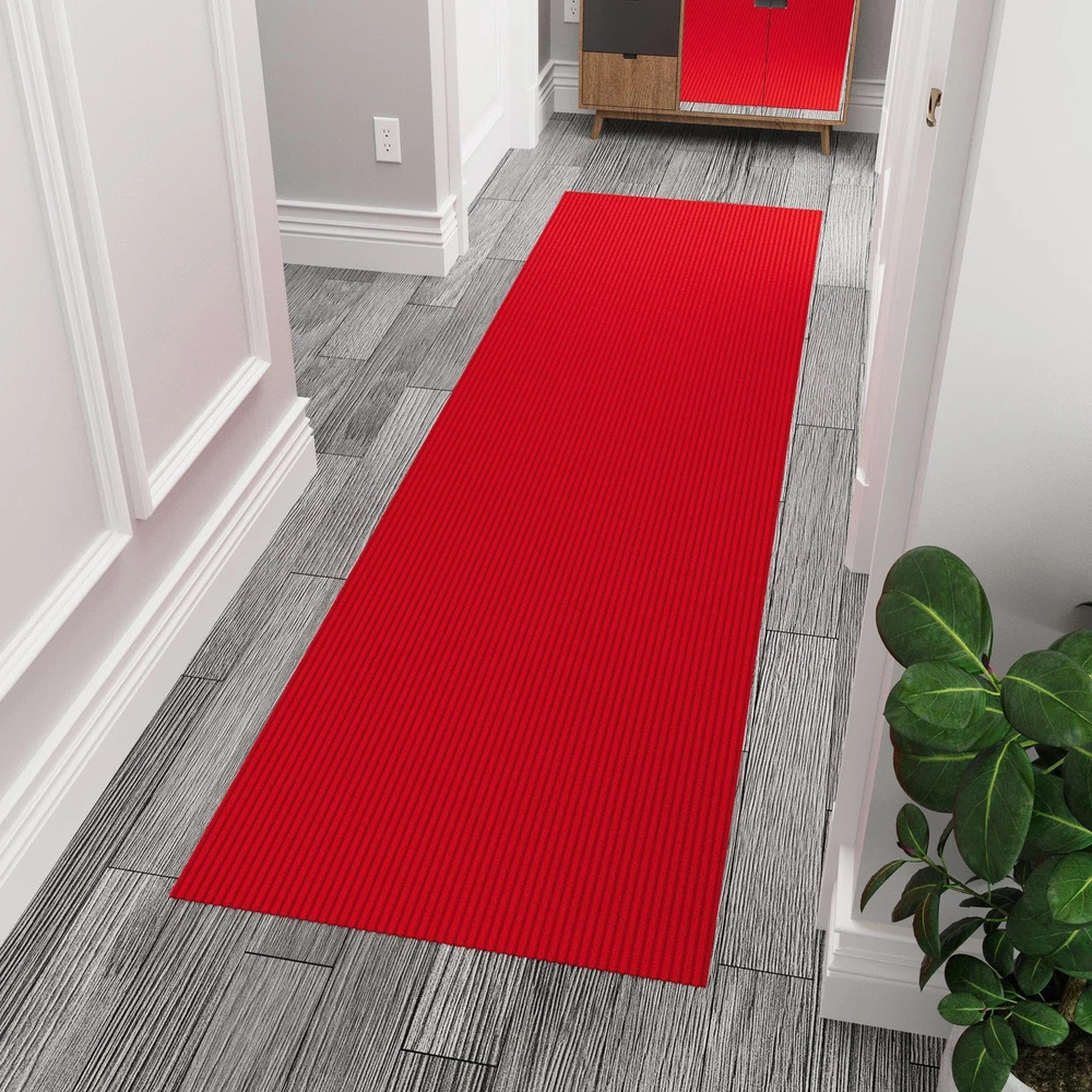 Our Scrape Rib Collection boasts a wide array of rugs, mats, and stair treads ranging from solid colors to unique prints and come in a wide range of shapes and sizes. Made in India, these Polyester rubber back rugs/stair treads will provide style throughout your home while also keeping your family safe with its non-slip rubber backing. Our sleek and functional ultra thin pile will help you place these rugs in areas where it would otherwise be difficult. These rugs are made from quality materials that are family and pet friendly and perfect for high traffic areas of your home such as the living room, bathroom, kitchen, and hallways! Here at , our mission is to deliver the highest quality rugs! [KEY ATTRIBUTES]: Size: 2'7" x 5' (3' x 5') | Thickness: 0.2 in. | Color: Red [ULTRA THIN]: An ultra thin pile thickness of 0.2 inches offers ideal functionality that is perfect for busy areas, underneath furniture, and in entryways as it will not obstruct doorways [NONSLIP & STAIN RESISTANT]: Made in India with high quality Polyester material. The rubber backing minimizes slipping. To ensure comfort and additional grip please purchase double sided rug tape. [TRENDY STYLE]: This contemporary custom size rug features a solid design, adding color and enhancing the look of your home. [KID & PET FRIENDLY]: Safe for everyday high foot traffic areas and more resistance to life’s unpredictable messes from kid or pet activity.