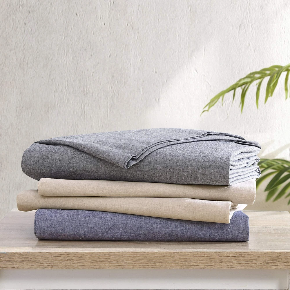 The Heather Percale sheet set is made of 100% recycled materials. Made of a blend of recycled polyester and recycled cotton in a percale weave, these sheets have a cool, breathable, crisp and lightweight feel. The heather design is a versatile solid to compliment any existing décor. Each set comes with a flat sheet, fully elasticized fitted sheet and pillowcase(s). Complete your bed with matching Montauk reversible comforter set by , sold separately. Lightweight, cool, and breathable sheets that are made with the environment in mind 100% recycled fiber sheet set 52% recycled cotton, 48% recycled polyester Heather fiber dyed design for a casual and versatile look Percale fabric that is cool, breathable, crisp and lightweight Each set comes with 1 flat sheet, 1 fitted sheet and 2 pillowcases (1 pillowcase for Twin sheet set) Fully elasticized fitted sheet for a snug and secure fit on your mattress Fitted sheets can fit mattresses up to 2” longer than their pocket measurement Machine wash cold, gentle cycle; do not bleach; tumble dry low; do not dry clean; warm iron if needed Queen sheet set includes: 1 flat sheet 90 inches wide and 102 inches long, 1 fitted sheet 60 inches wide and 80 inches long with a 16 inch pocket, 2 standard size pillowcases 30 inches wide and 20 inches long