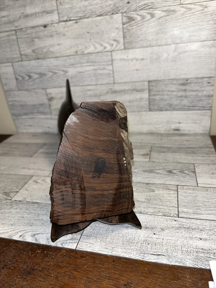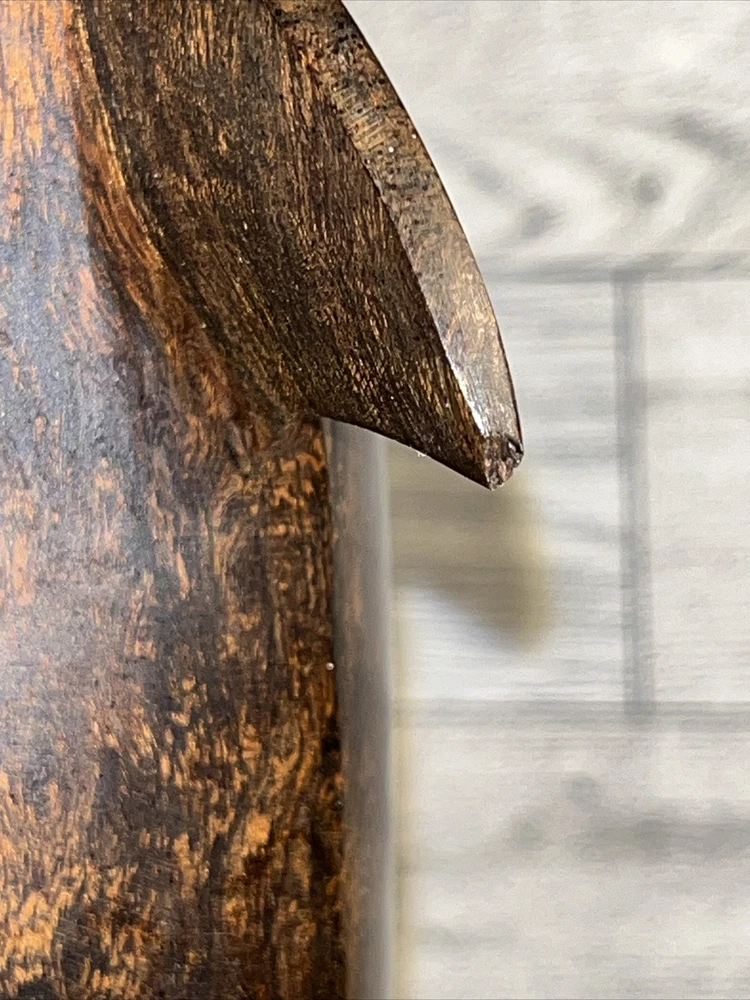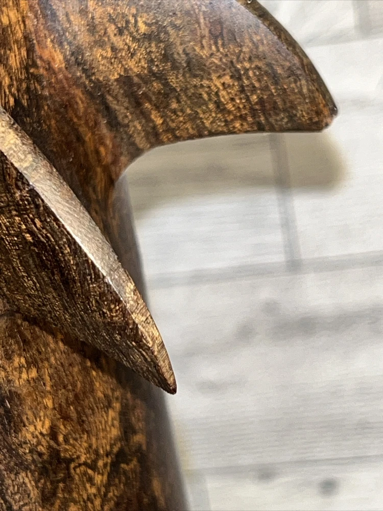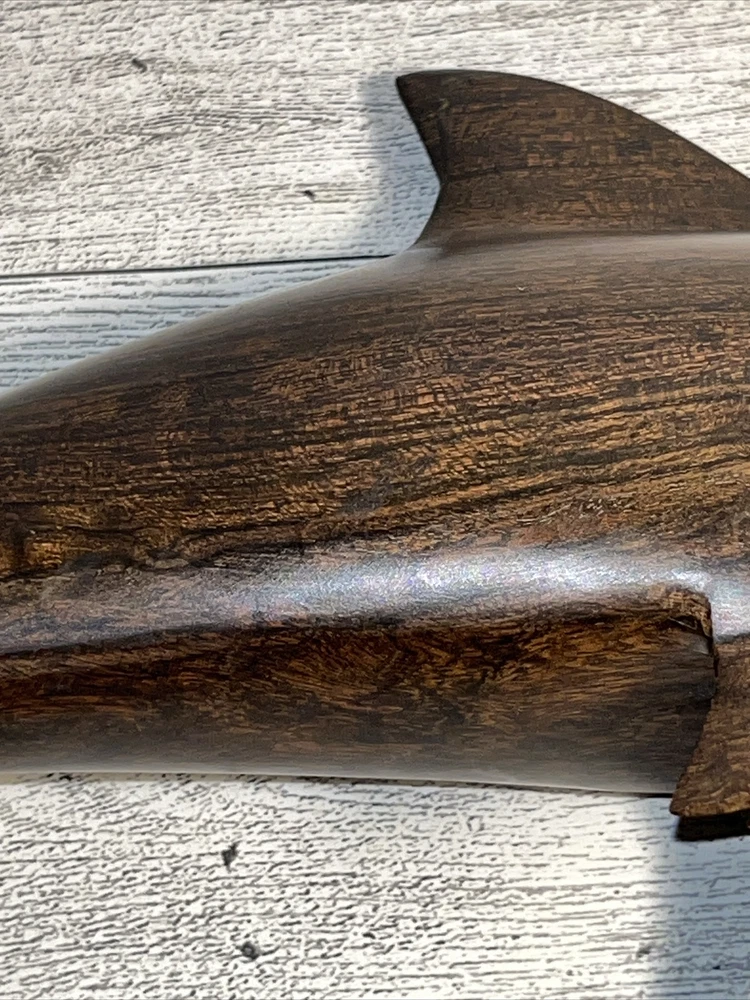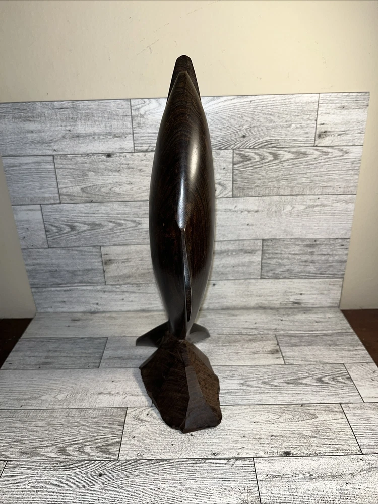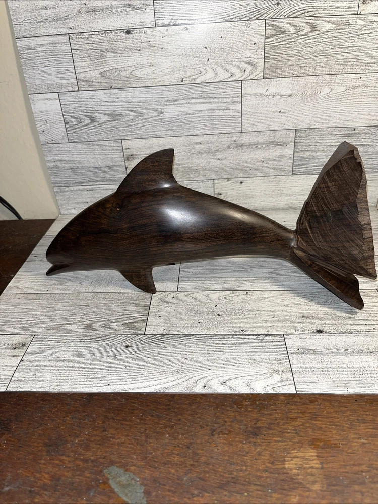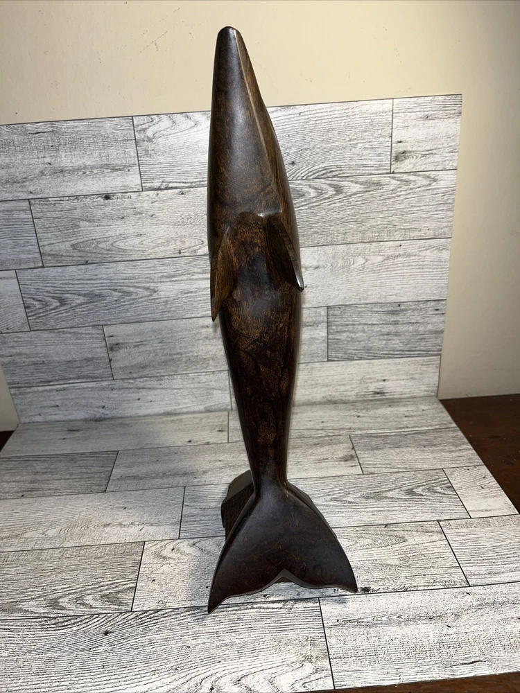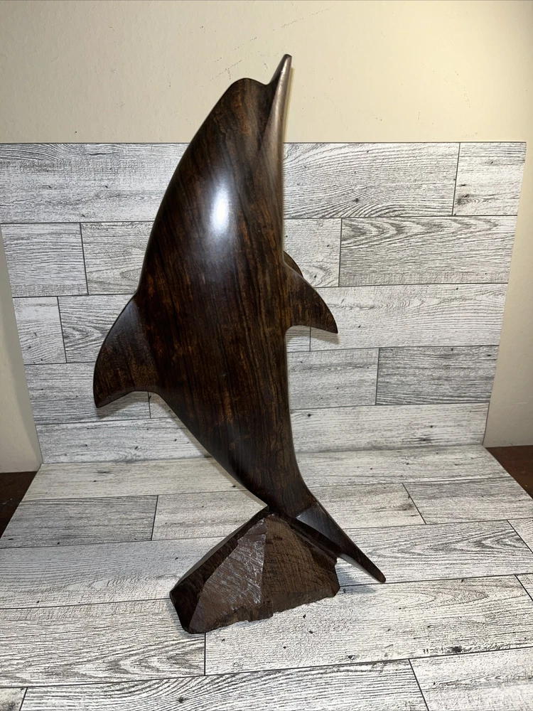Gorgeous Vintage Piece with superb craftsmanship! Overall Very Good Condition with a few flaws- 1 fin has a chip at the bottom tip & 1 tiny worn spot on the side-nothing a little polish wouldn’t hide-Please see photos. This stunning solid wood dolphin statue is a must-have for any collector or marine life enthusiast. Crafted with incredible attention to detail, this piece showcases the beauty and grace of these magnificent creatures. Measuring approximately 12 inches by 5 inches, and weighing 1.12 lbs, this statue is a perfect addition to any collection. The mixed brown and black coloring of the statue perfectly complements the intricate design of the dolphin, making it a true work of art. Made from high-quality materials, this statue is sure to stand the test of time and become a treasured piece for years to come. Whether you're a fan of dolphins or simply appreciate the beauty of marine life, this statue is a must-have for your collection.