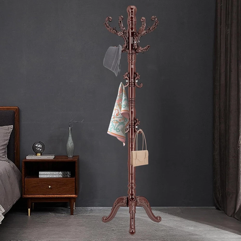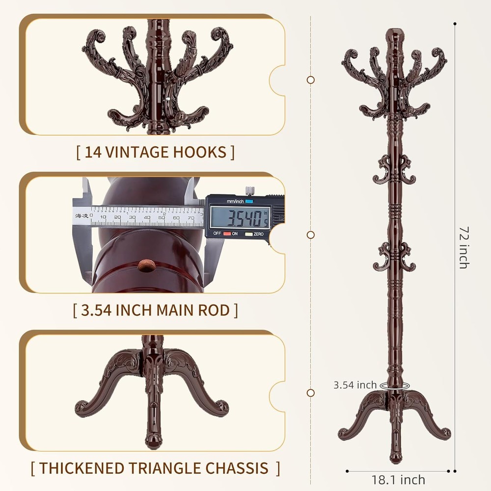 NATURAL SOLID BIRCH WOOD: The wooden coat rack is carefully selected from natural birch wood. The wood coat rack freestanding has a natural texture, which is tough and sturdy, wear-resistant and not easy to crack VINTAGE 14 HOOKS: This coat hanger stand features exquisite resin hooks with smooth lines. Each piece is manually polished by workers. The coat stand is smooth and no burrs, and it can be hung without damaging clothes. 14 hooks to meet your daily storage needs 300LBS LOAD-BEARING: The wooden coat rack chassis adopts a thickened and enlarged triangular chassis. The triangular mechanics are stable and will not shake. The main rod diameter is 3.54 inches, the chassis diameter is 18.1 inches, and it is thick and sturdy and can bear 300 pounds CLASSIC EUROPEAN STYLE: The wooden coat tree is designed in a luxurious European style, with a simple structure and comprehensive functions. The coat rack can be placed in the hallway, living room, bedroom, office, and any corner you need EASY TO INSTALLATION: The wooden coat tree stand adopts an embedded screw design and is connected to the main pole, and the full-tooth screw is connected to the chassis. Equipped with installation tools and instructions, you can easily complete the installation. On Dec 20, 2024 at 23:48:43 PST, seller added the following information: On Feb 21, 2025 at 00:35:34 PST, seller added the following information: