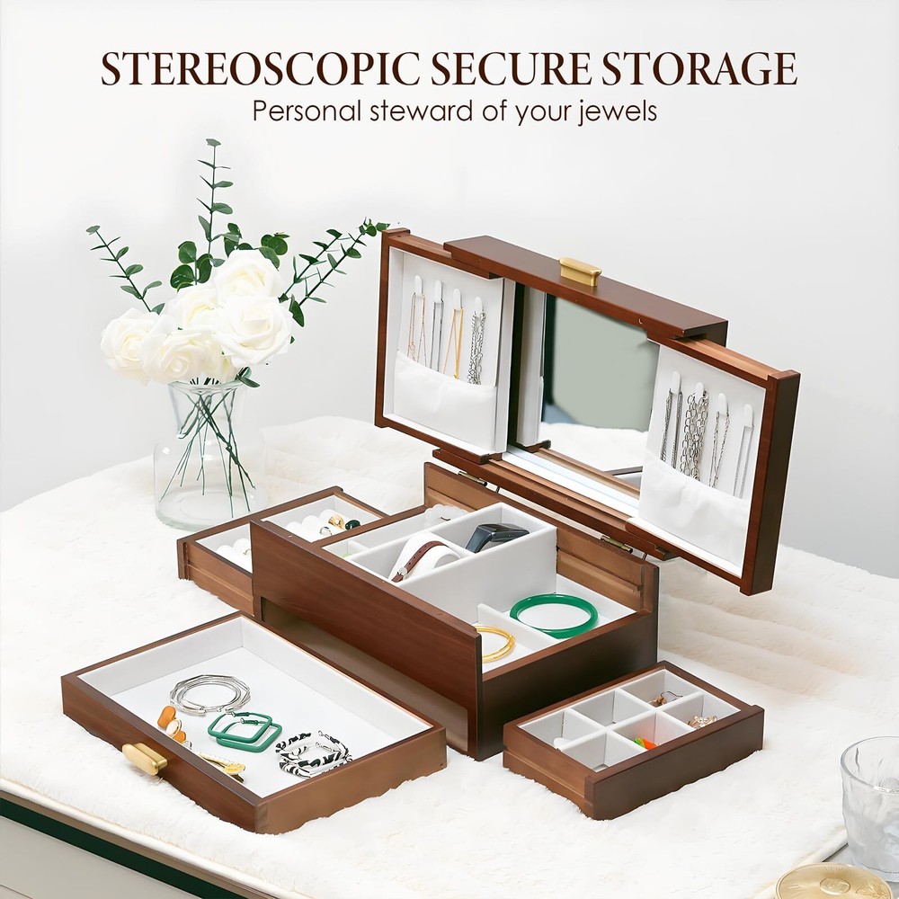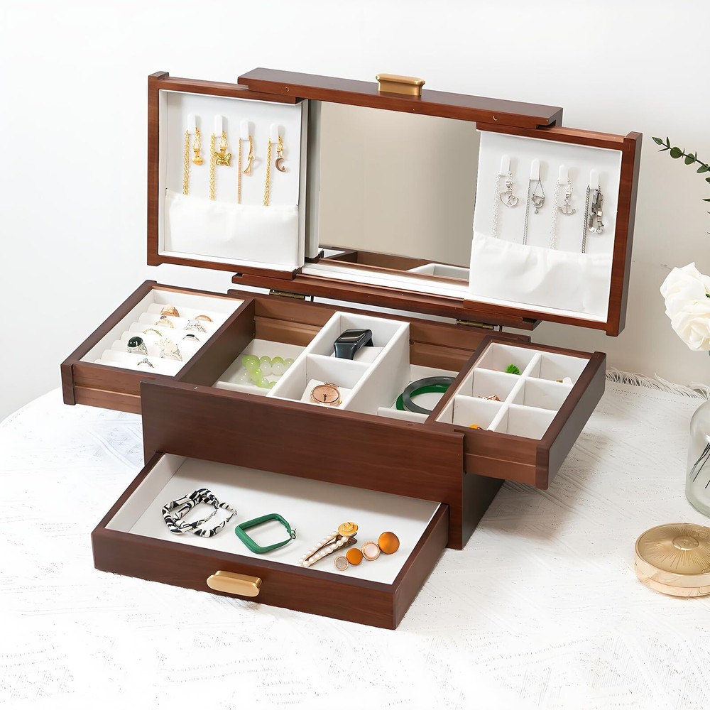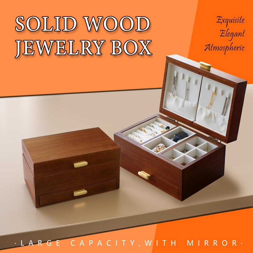 Jewelry Box Solid Wood Jewelry Box Jewelry Ring Necklace Watches Earrings And Other Multi-style Storage Organizer Girl Wife Mother Gifts - Buy Now with Fast Shipping! Jewelry Box Solid Wood Jewelry Box Jewelry Ring Necklace Watches Earrings And Other Multi-style Storage Organizer Girl Wife Mother Gifts Product Details Color: Vintage red Brand: FMYSUSUXY Material: Wood Style: Antique Special Feature: Anti-Tarnish, Dustproof, Foldable, Scratch Resistant Recommended Uses For Product: Necklace, Bracelet, Ring, Watch, Earring, Bangle Product Dimensions: 8"D x 12"W x 6.6"H Target Audience: Women, Men, Girls Shape: Rectangular Finish Type: Lacquered Color: ‎Vintage red Brand: ‎FMYSUSUXY Material: ‎Wood Style: ‎Antique Special Feature: ‎Anti-Tarnish, Dustproof, Foldable, Scratch Resistant Recommended Uses For Product: ‎Necklace, Bracelet, Ring, Watch, Earring, Bangle Product Dimensions: ‎8"D x 12"W x 6.6"H Target Audience: ‎Women, Men, Girls Shape: ‎Rectangular Finish Type: ‎Lacquered Inner Material: ‎Velvet Number of Drawers: ‎5 Number of Compartments: ‎8 Jewelry Storage Type: ‎Jewelry Box Manufacturer: ‎FMYSUSUXY Occasion: ‎Mother's Day, Engagement, Christmas, Birthday, Valentine's Day Mounting Type: ‎Table Top Closure Type: ‎Latch Item Weight: ‎6.84 pounds Country of Origin: ‎China Item model number: ‎big1 Finish: ‎Lacquered Special Features: ‎Anti-Tarnish, Dustproof, Foldable, Scratch Resistant Included Components: ‎jewelry box Batteries Included?: ‎No Batteries Required?: ‎No Date First Available: July 13, 2024 Key Features ✅ Large capacity jewelry box with mirror:Made of renewable solid wood and covered with soft velvet inside, it is a large -capacity high-end luxury jewelry box that perfectly protects your jewelry ✅ Pure copper handle:The shape is simple, oval, comfortable to touch, pure copper. Anti-oxidation. Rust proof ✅ Efficient storage and dressing:The jewelry box comes with a makeup mirror, you can effectively choose accessories according to your wear, and you can hang necklaces on both sides.The second layer can be freely retracted on both sides, with hidden storage space, separate watch ring and other placing areas.The third floor is a space designed for large bracelets. ✅ The best gift to give:The jewelry box can store a variety of jewelry, convenient storage, is the best birthday gift or surprise for yourself, friends, or family, and can also be used as an ornament, with great collection value ✅ Optimum size:Jewelry box 12''L x 8''W x 6.6''H, Expansion size 21.5''L x 10''W x 12.6''H Product Description